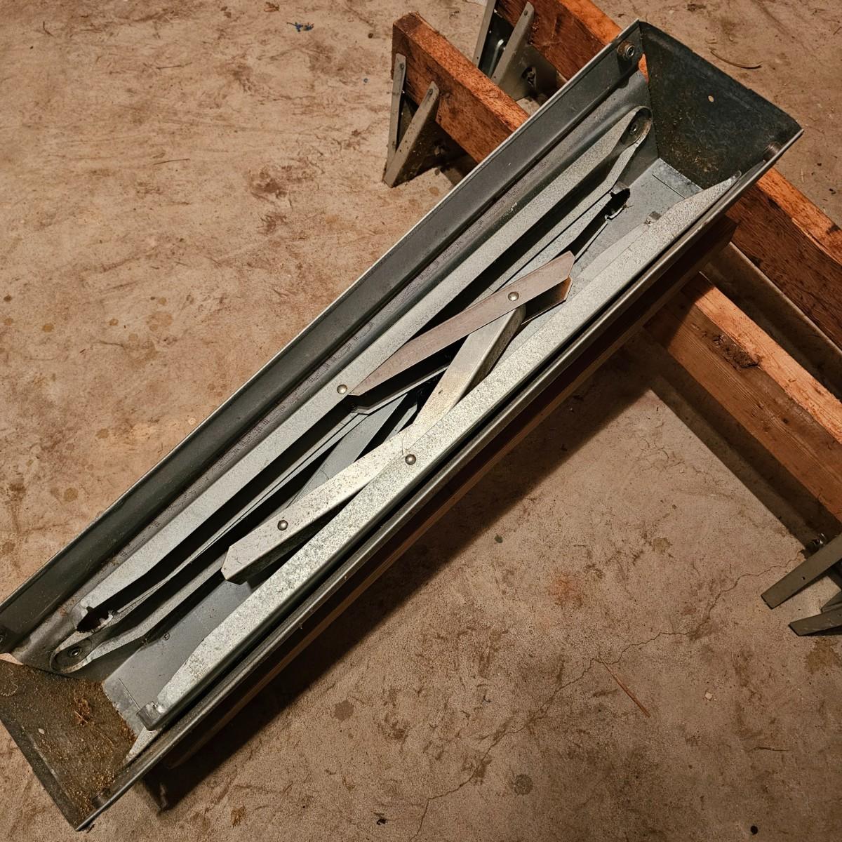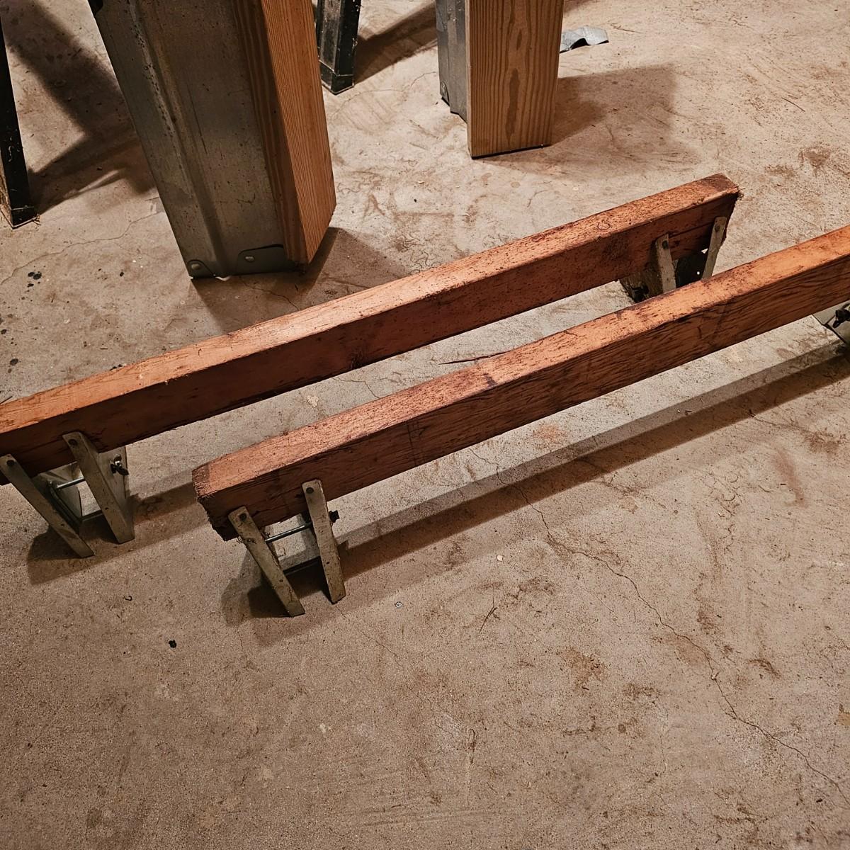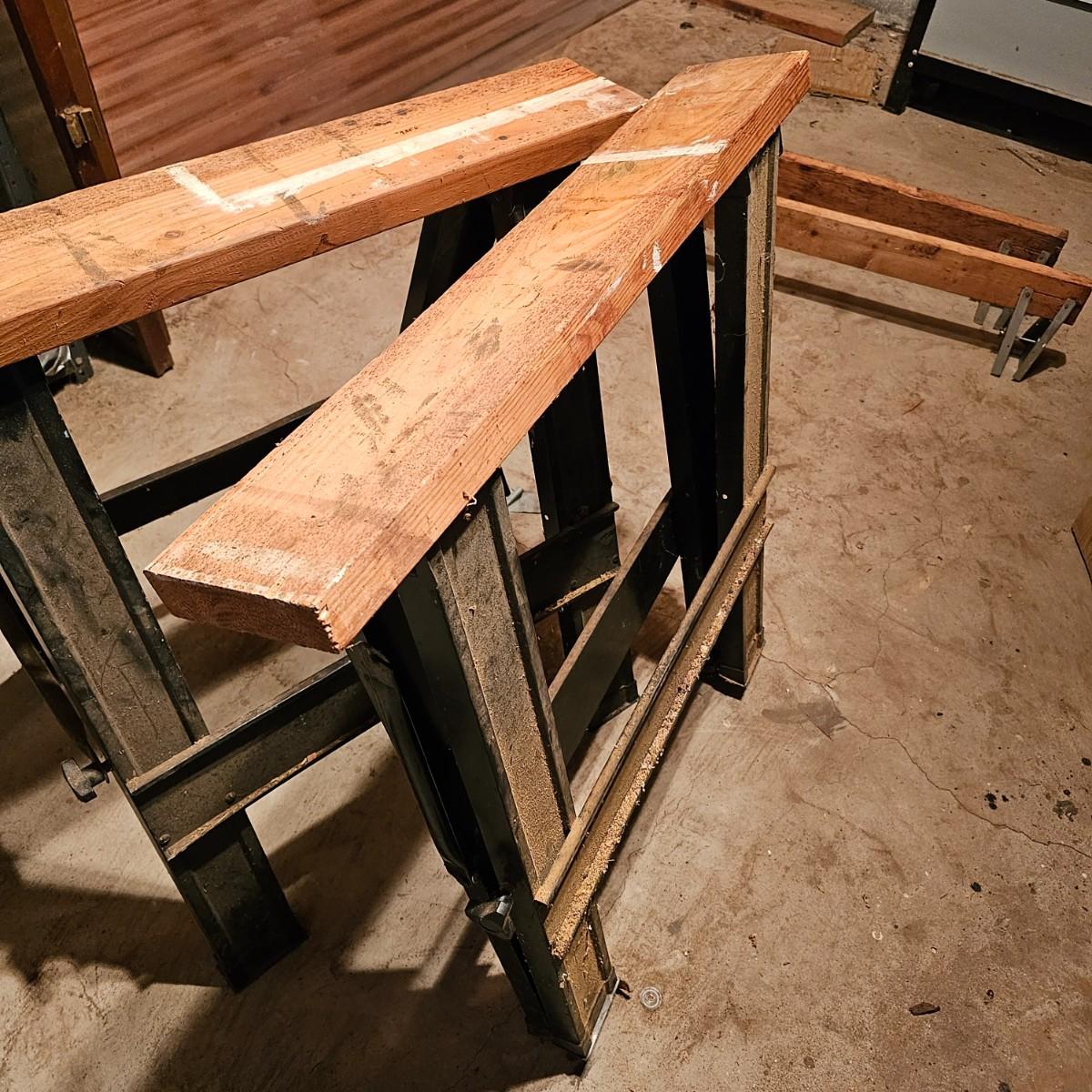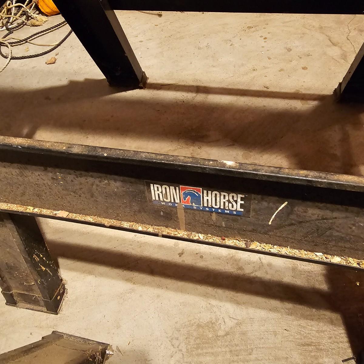 Three pairs of portable sawhorses. One set is just tops and brackets and will need legs added. It measures 36" x 6" x 8"H. Black Iron Horse units fold flat for storage. They measure 32" x 20" x 30"H when open and fold to 6" thick. The aluminum pair are by Ebco and fold up completely with the legs inside the top. When open these measure 36" x 24" x 30"H and folded they are 31" x 7" x 8"H. Wood tops on all. See photos for details. Local pickup only.