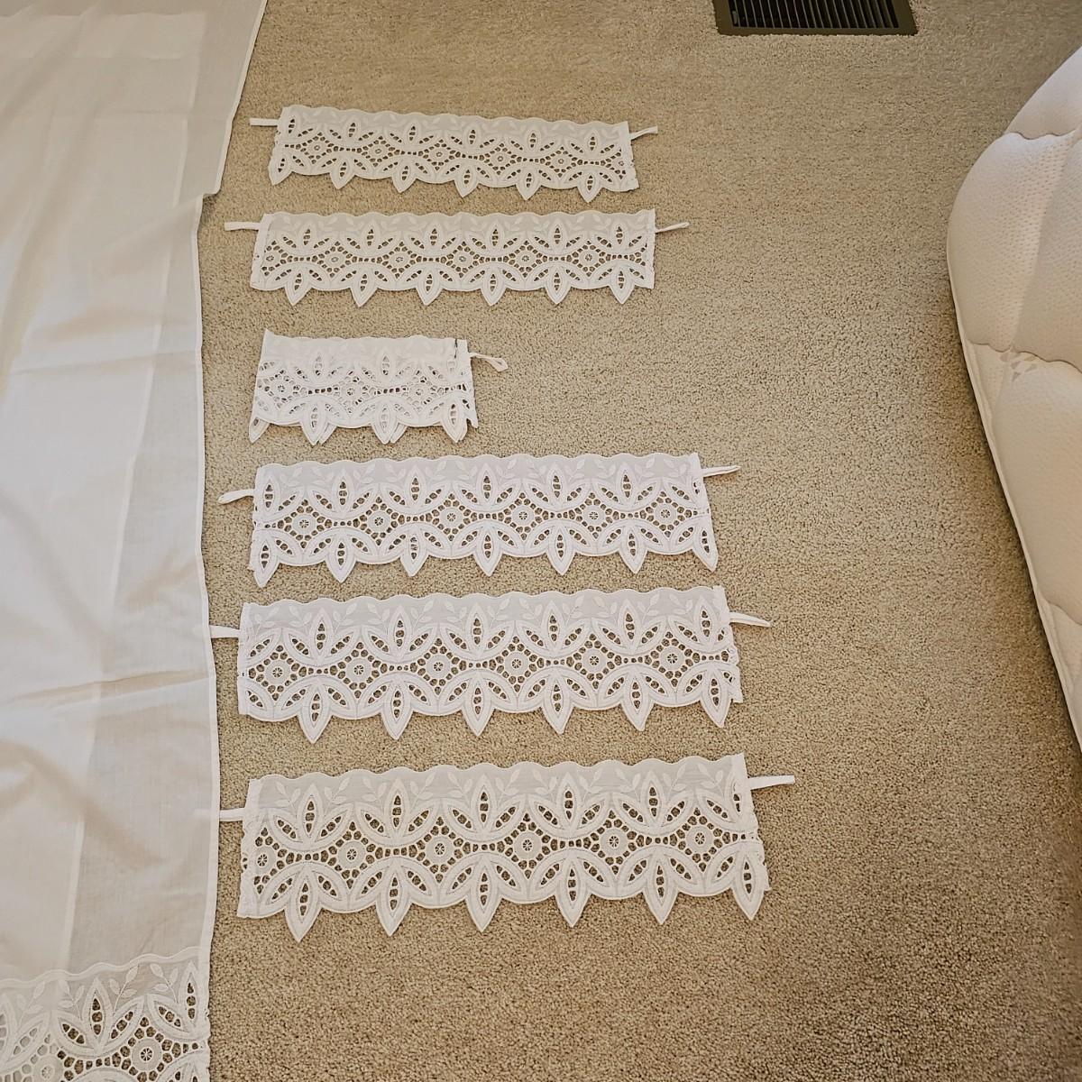 Three sets for three windows of drapery panels, valances and cloth pullbacks, all white with lace edge trim. Each panel measures 38" x 63", valances are 77" x 14" and pull backs are 19" x 6". See photos for details. Shipping available.