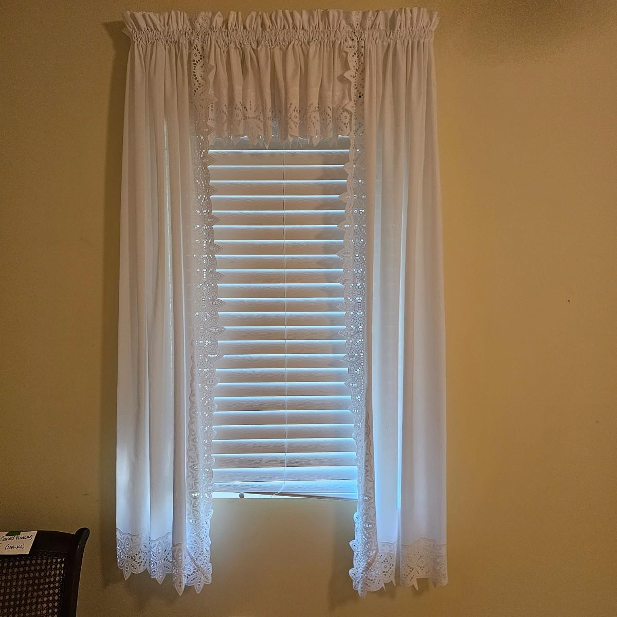 Three Sets of Lace Edged Curtains, Valances, & Pull Backs (UB-JS)