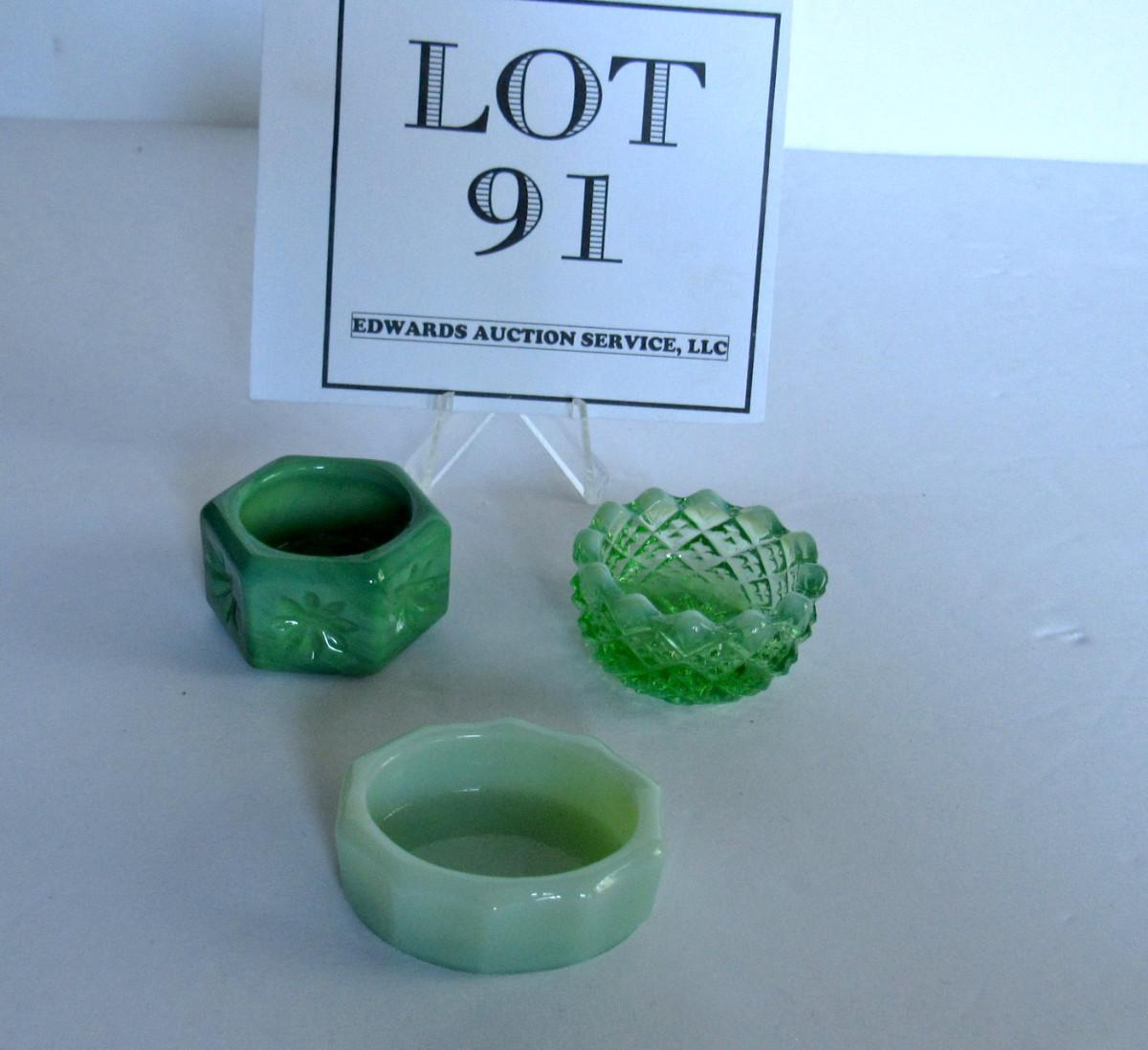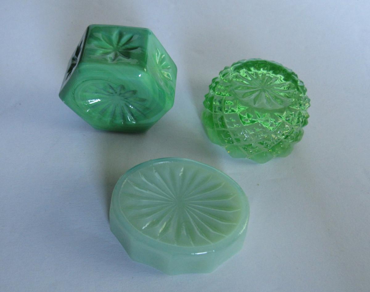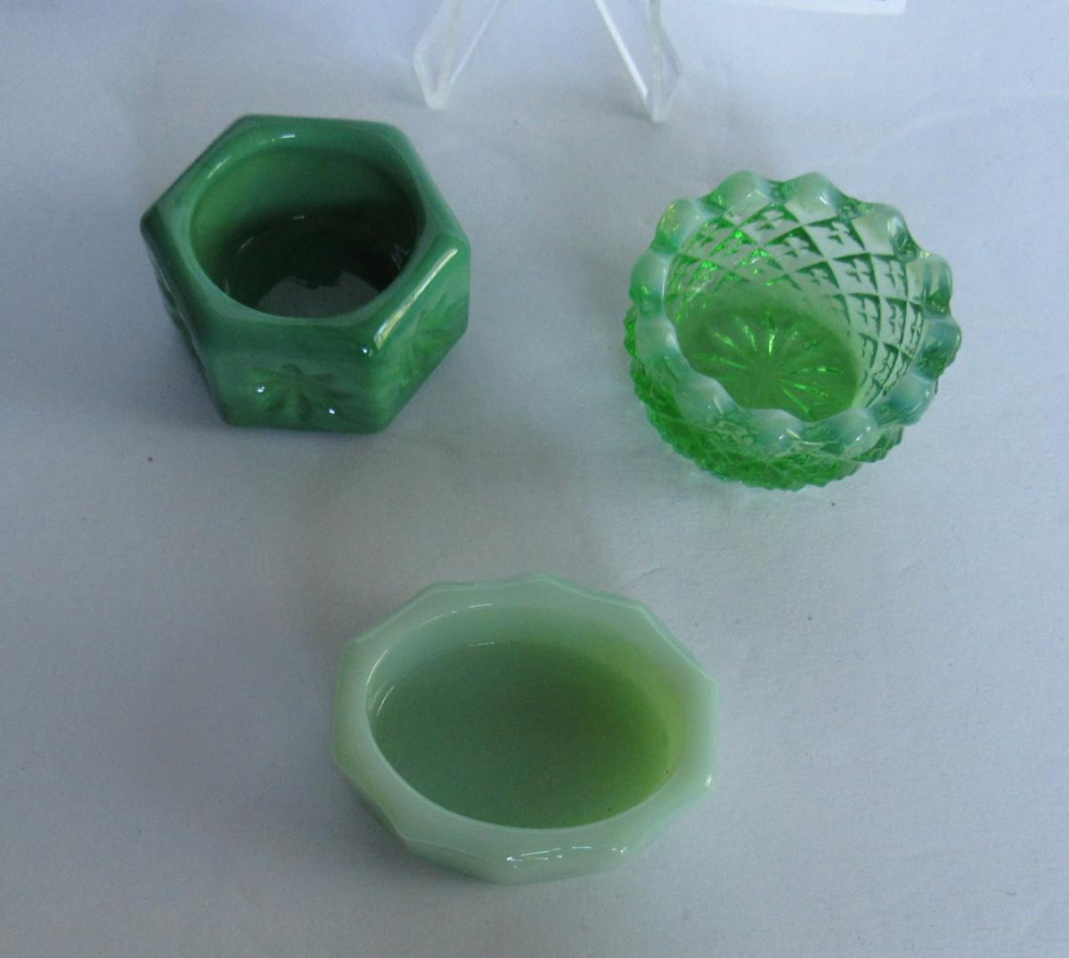 Jadite, opalescent, dark jade. Good shape. Shipping is available at actual shipping cost plus $5.00 handling fee per box for supplies/labor. See our terms for details. All sales are final. Condition notes may not be all inclusive, we may miss some issues as most vintage items are not in mint condition and have some degree of wear, paint loss, etc, but we always try to note obvious damage.