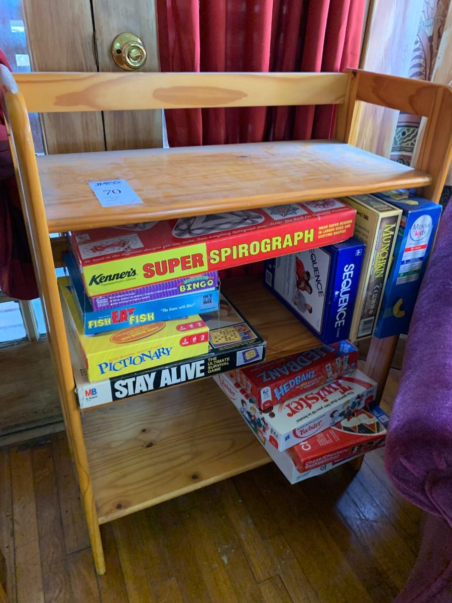 Open Bookcase. Includes contents: Vintage Spirograph, Pictionary, Twister and more.