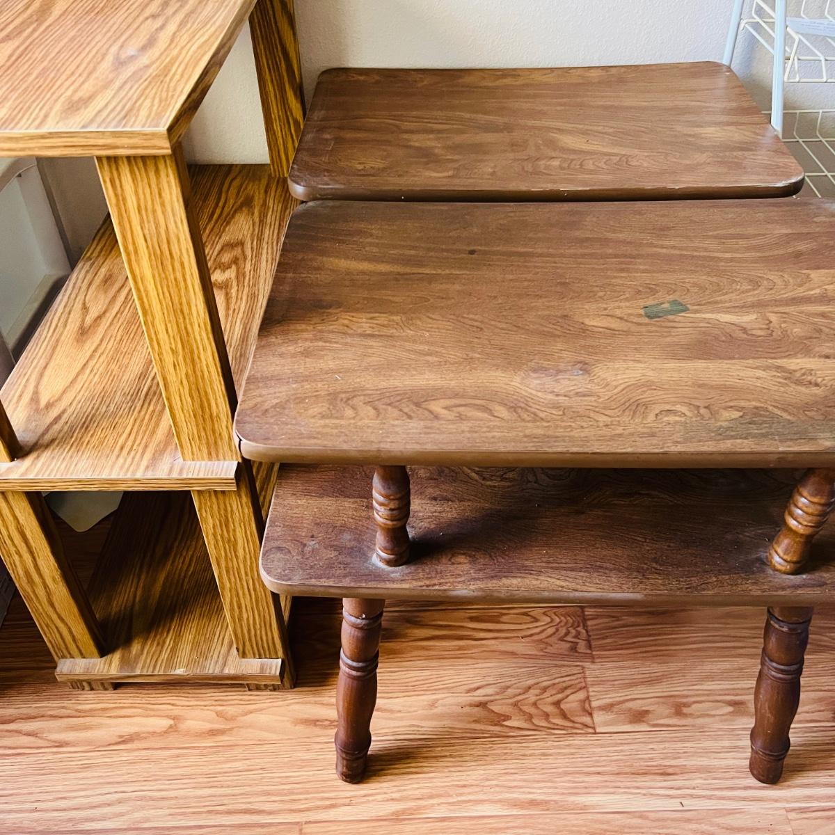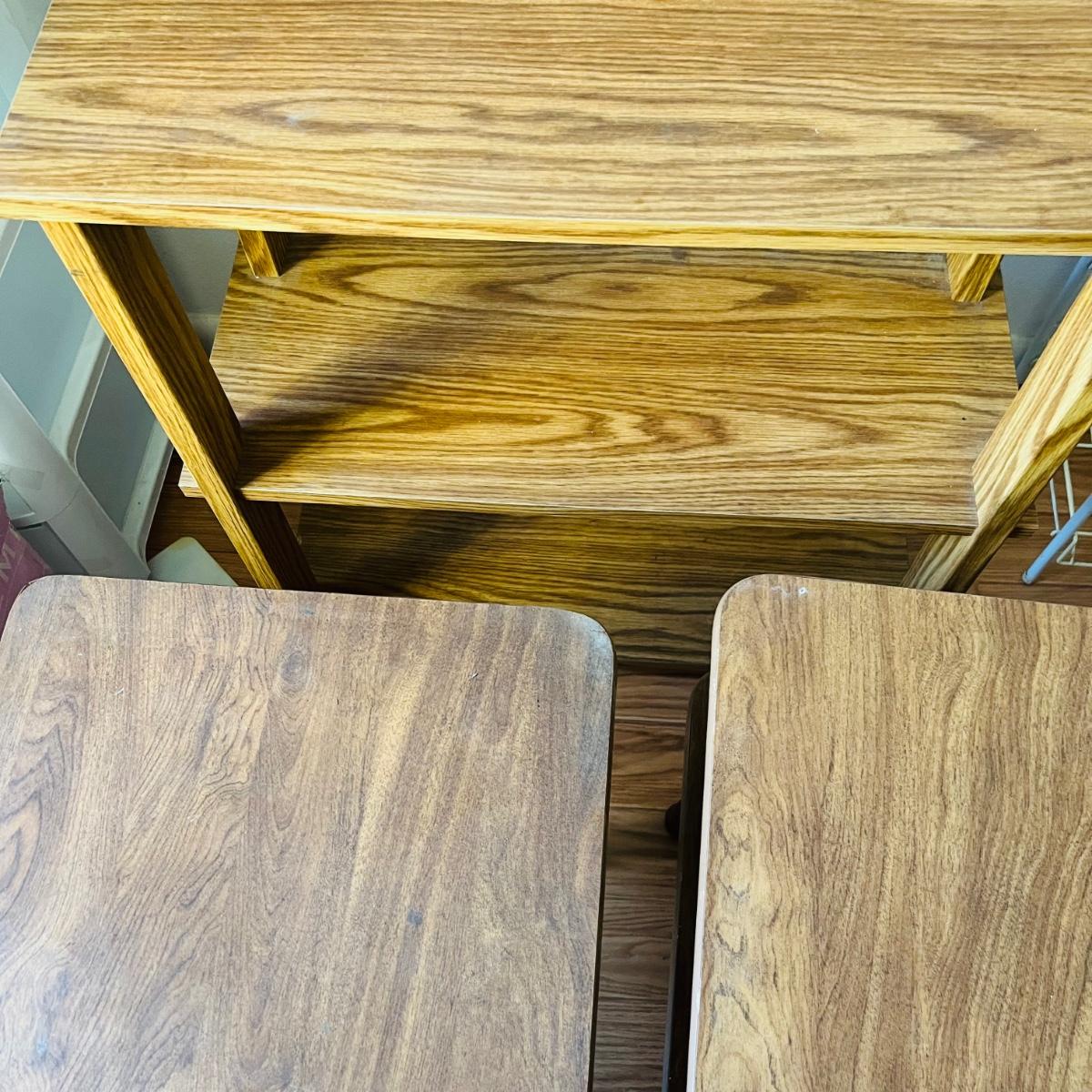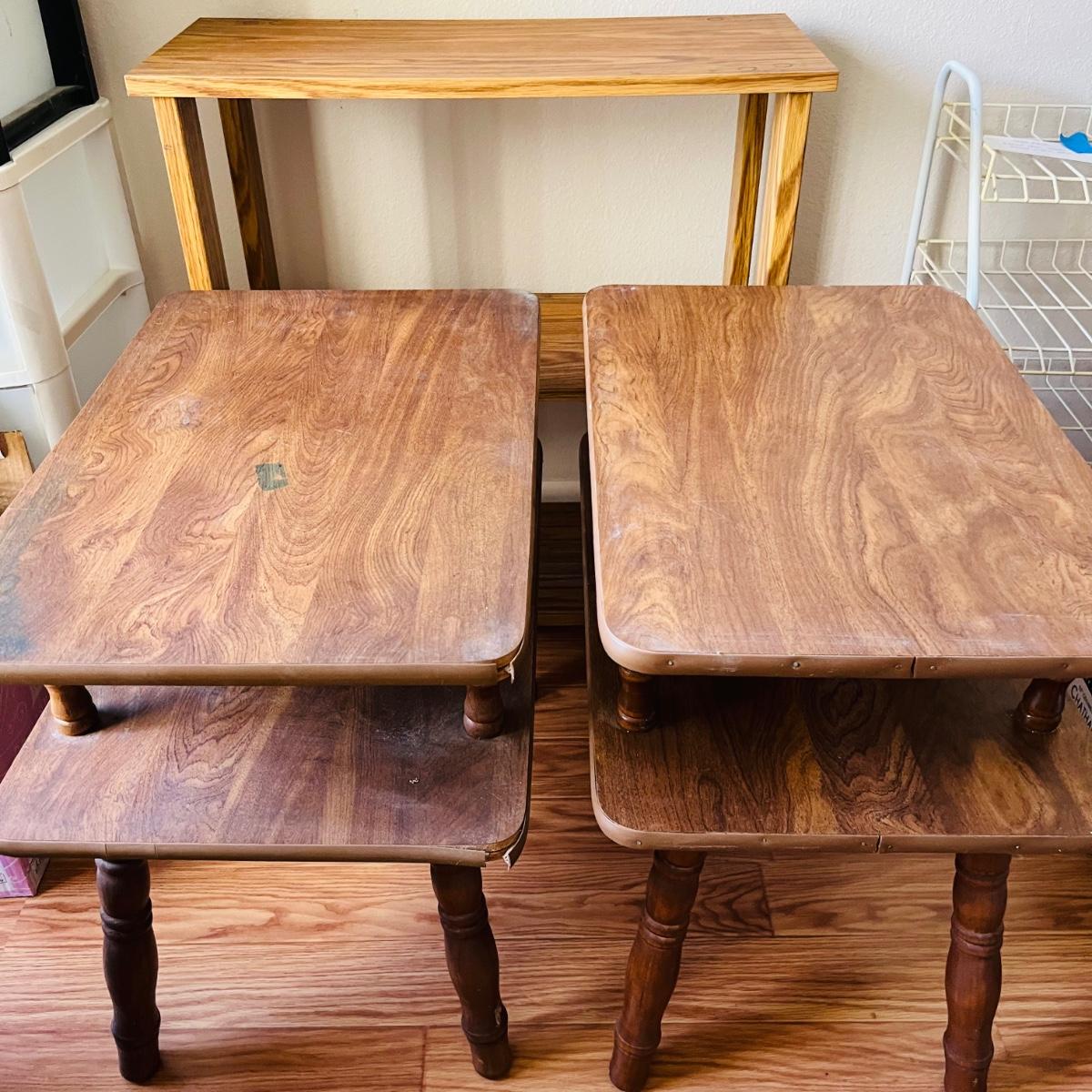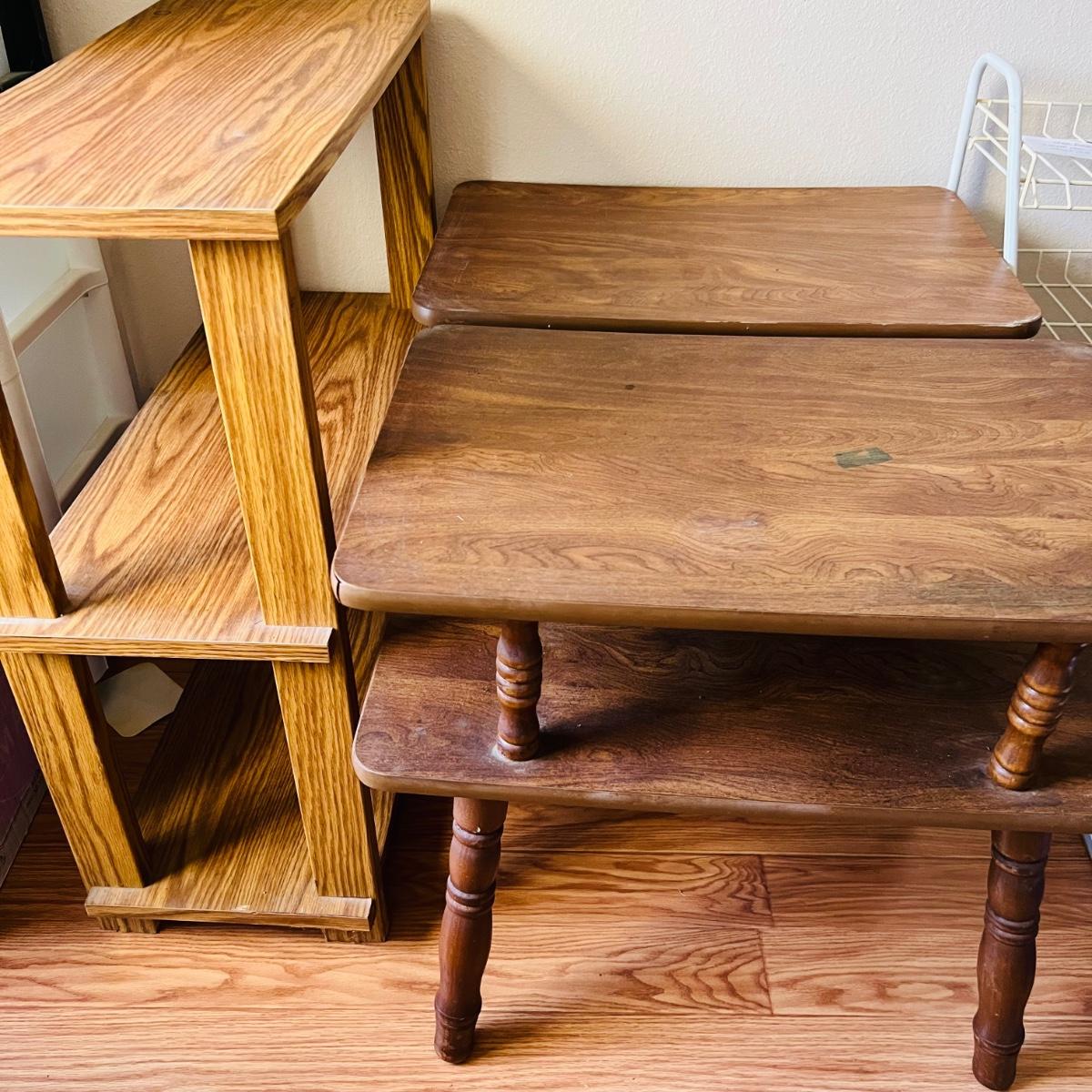 Lot includes a wood laminate bookcase and two laminate end tables. Shelf measures 27.5”L x 12” W x 30”. Top has some water marks as shown in picture but overall is in good condition. Two end tables measure 16”Wx24”Lx22”H. One in good condition and one needs tightening and trim glued down.