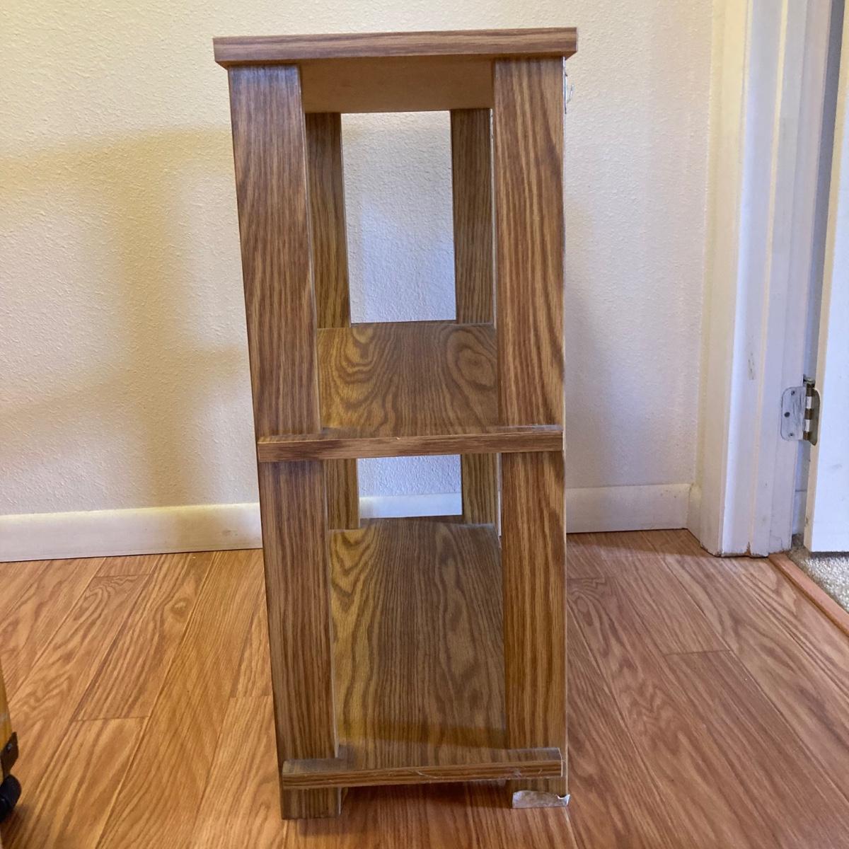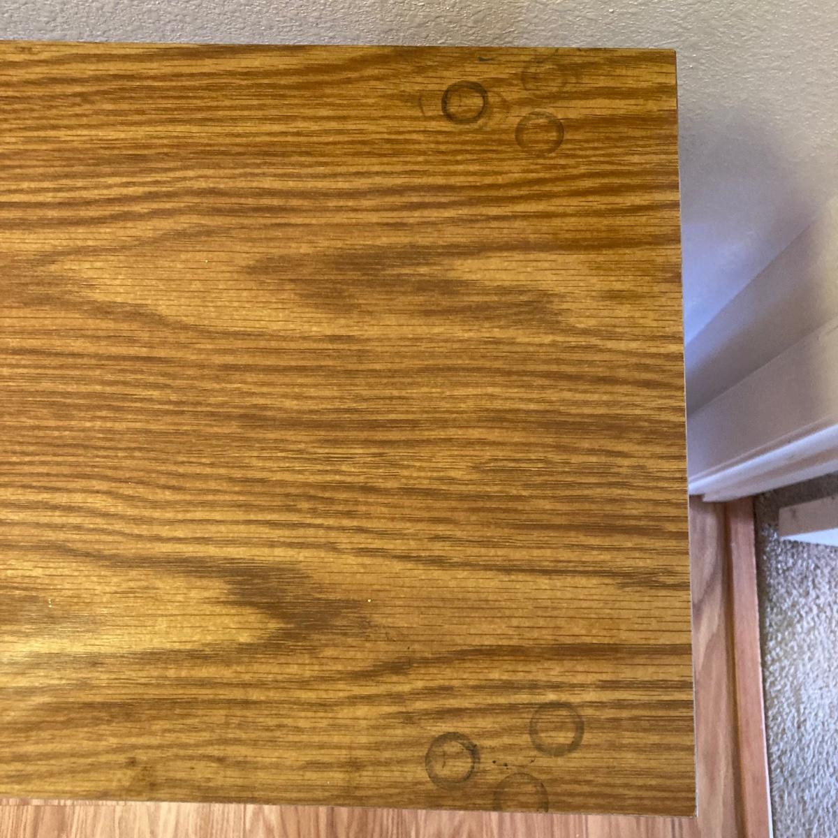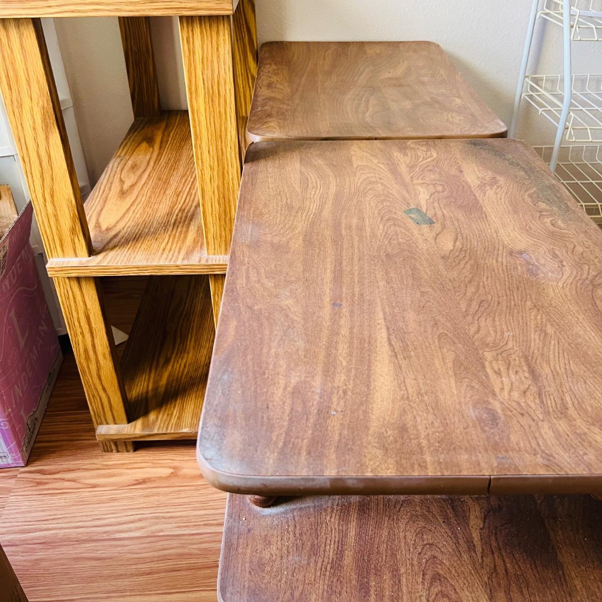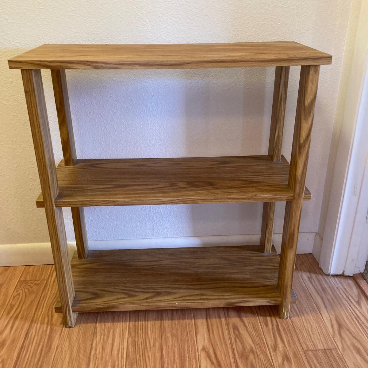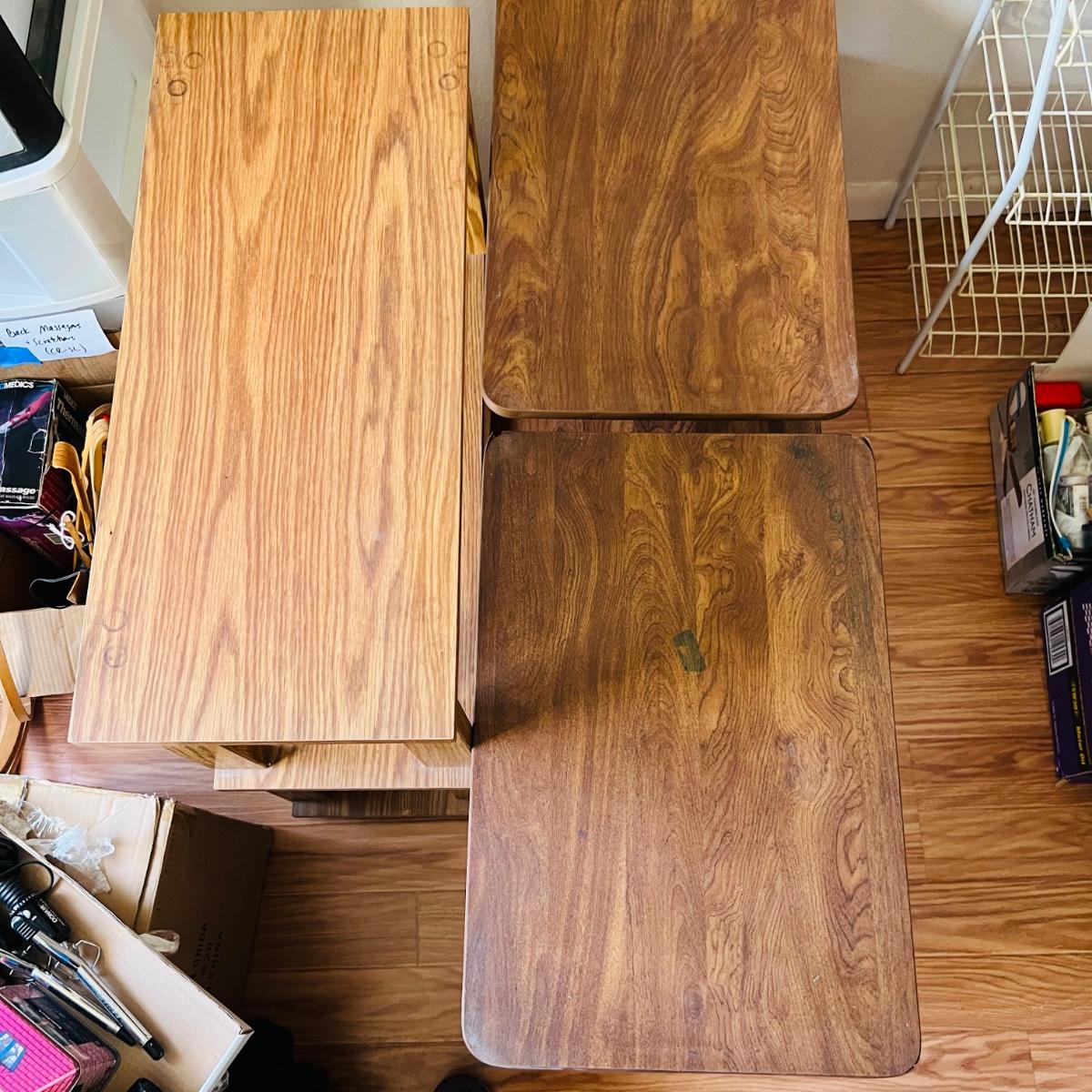 Lot includes a wood laminate bookcase and two laminate end tables. Shelf measures 27.5”L x 12” W x 30”. Top has some water marks as shown in picture but overall is in good condition. Two end tables measure 16”Wx24”Lx22”H. One in good condition and one needs tightening and trim glued down.