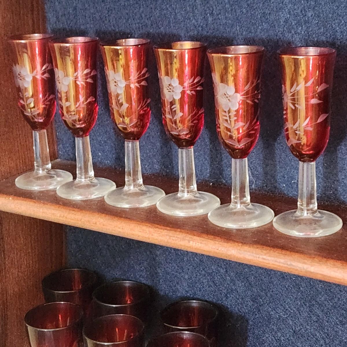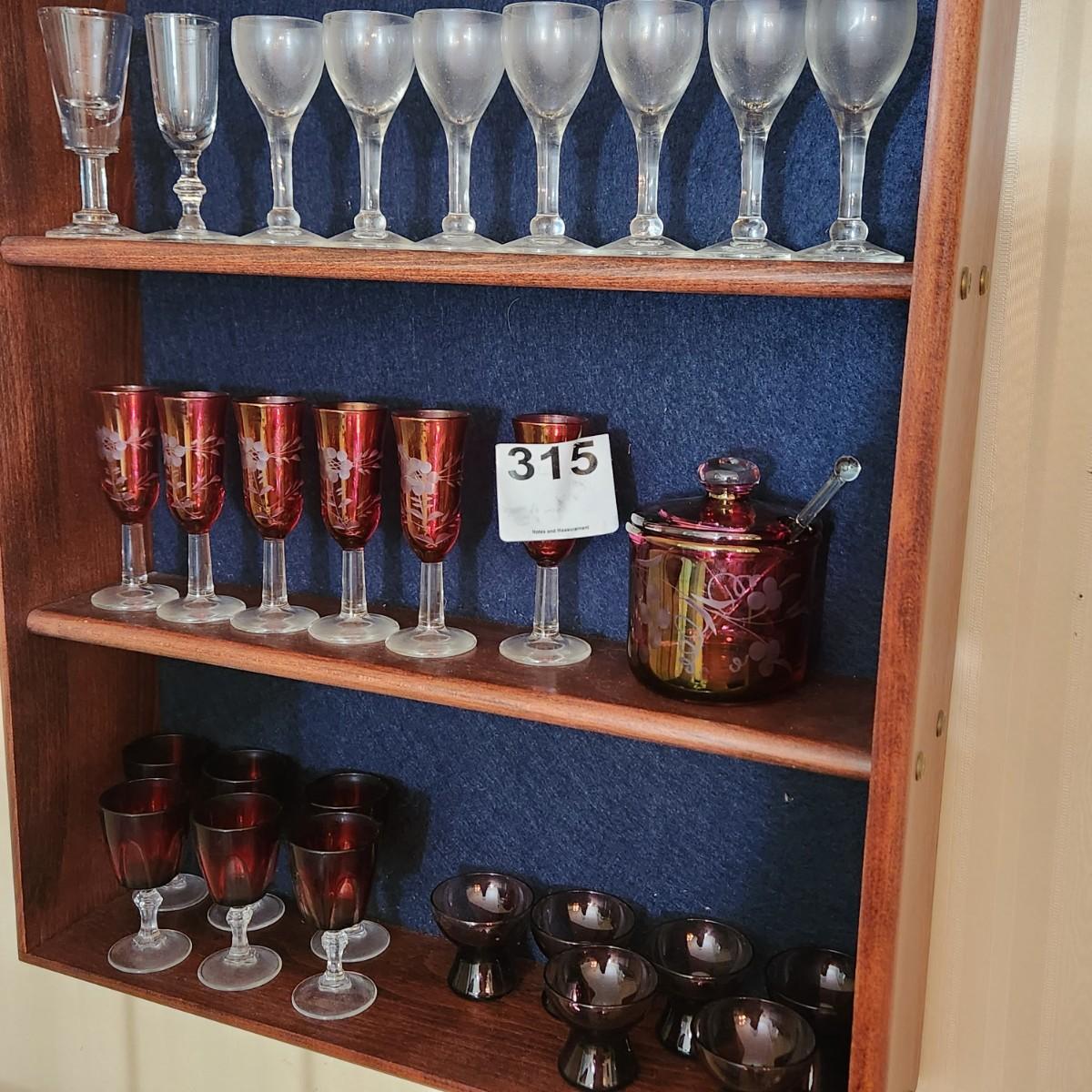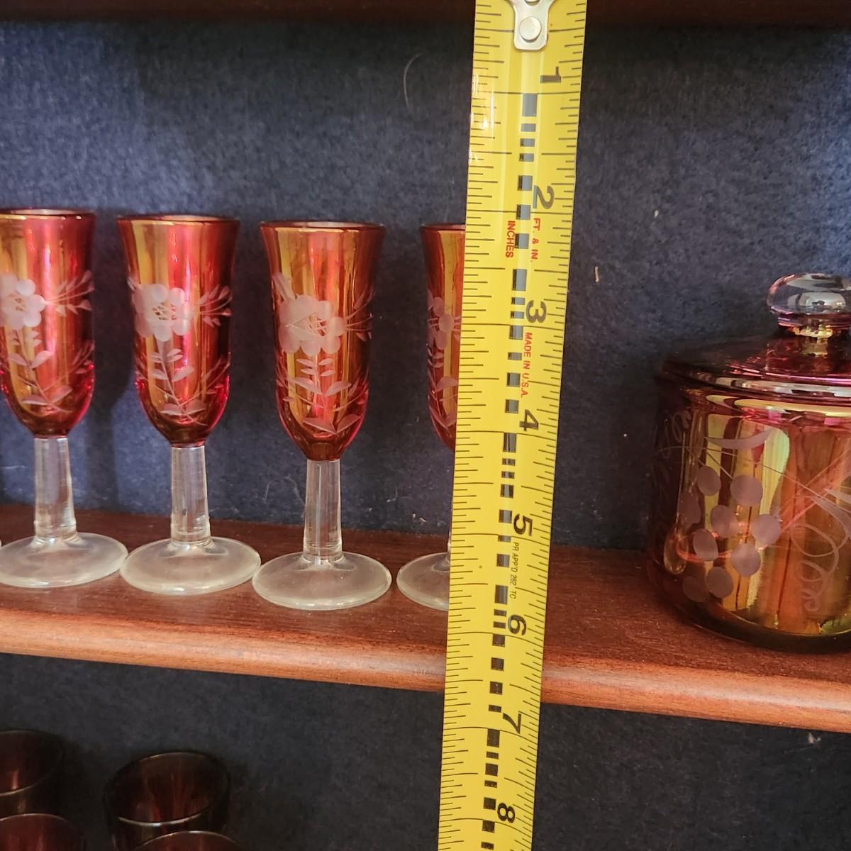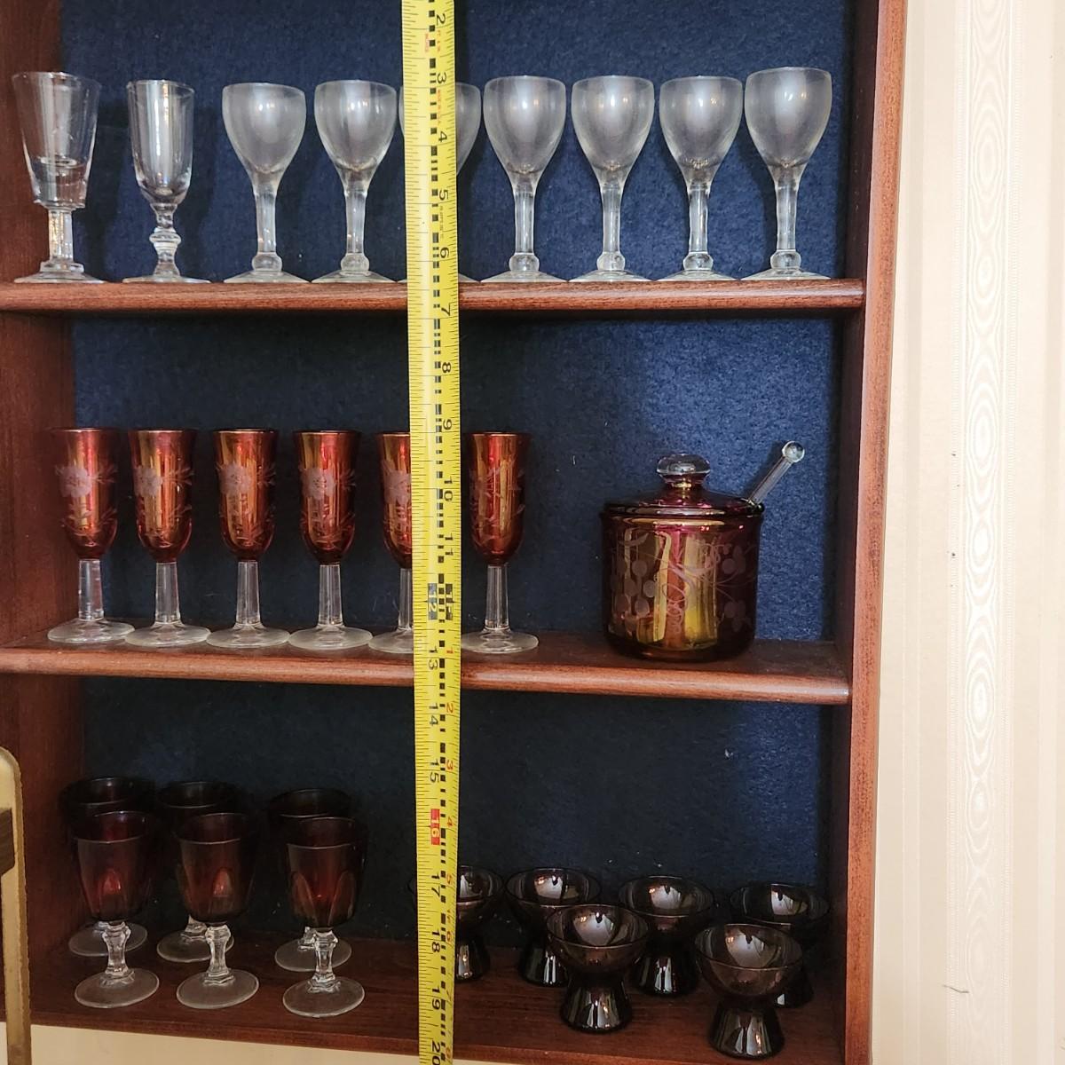 3 Shelves of Glasses Clear Etched Red Cranberry
