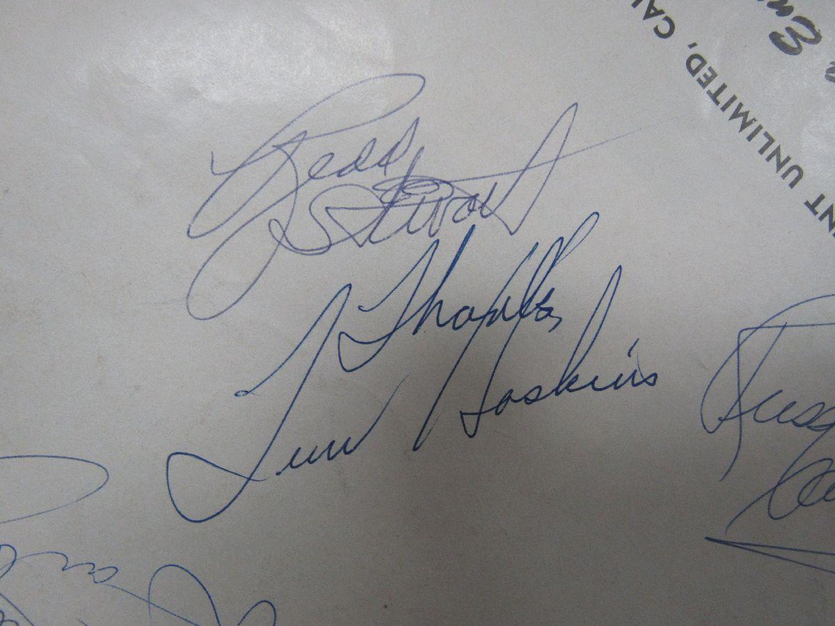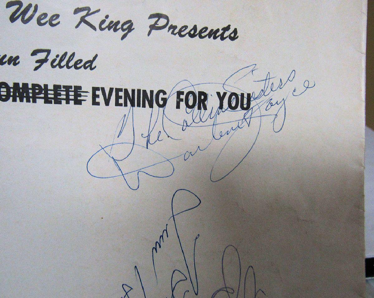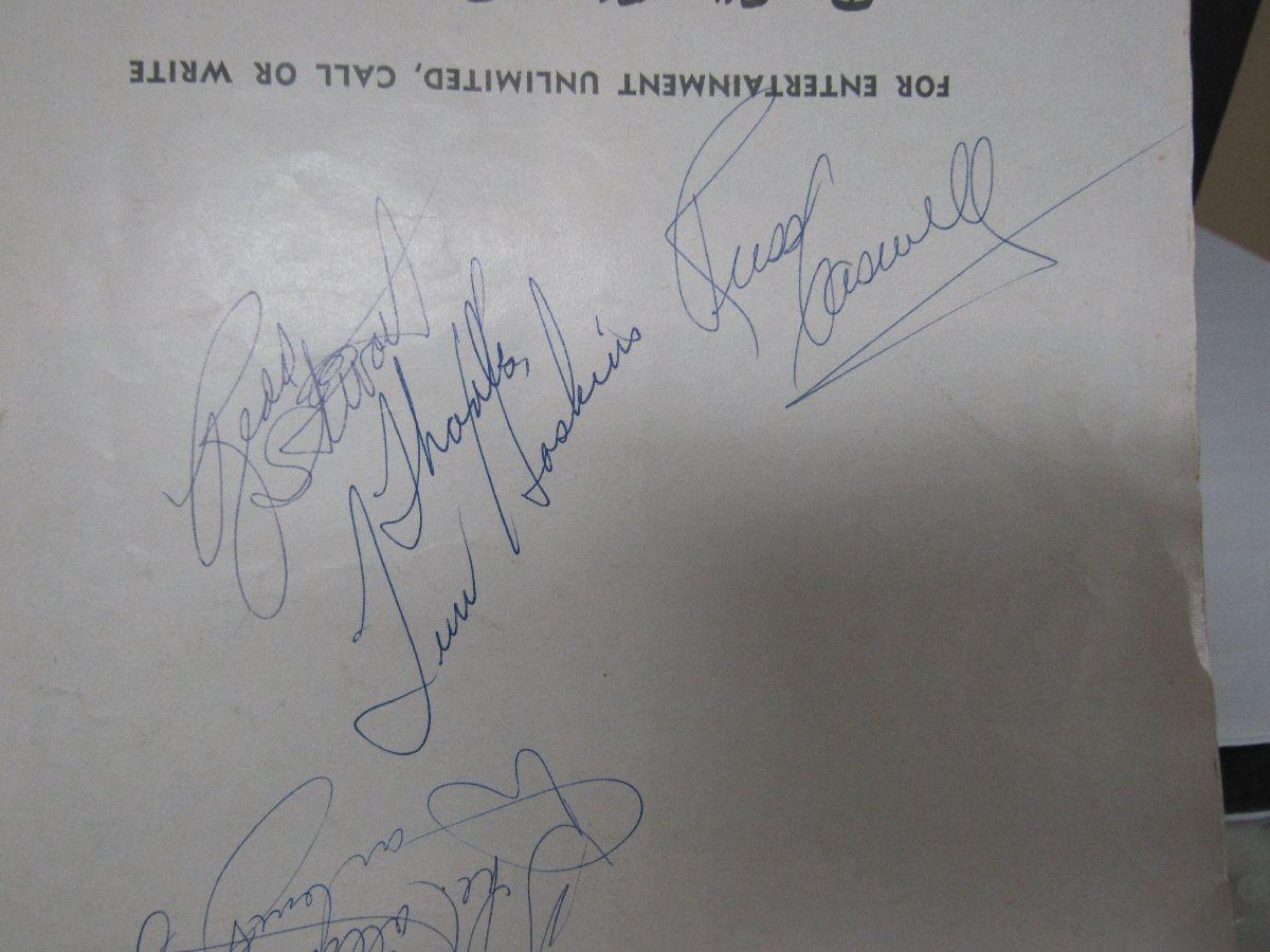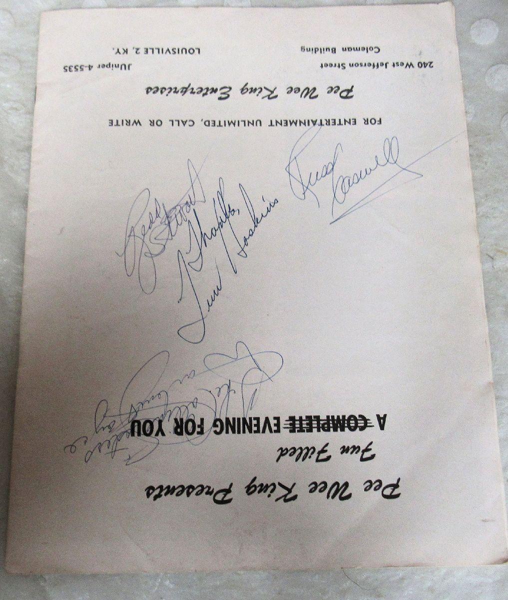The Pee Wee King program has his autograph on front and the others are on the back, including: Redd Stewart, the Collins Sisters, and two I can't make out. Not dated. Holiday on Ice is from 1948, Folklore Dancers/Globetrotters undated. Used condition with some spotting, minor bending, minor tear or two. Shipping is available at shipping cost plus $5.00 handling fee on one box, $10.00 handling fee on two boxes, $15.00 handling fee on 3 boxes. Helps cover shipping materials and labor cost. You will receive exact item as pictured, no refunds, returns not accepted. Do not bid if you do not intend to pay for your lots or the shipping/handling fees.
