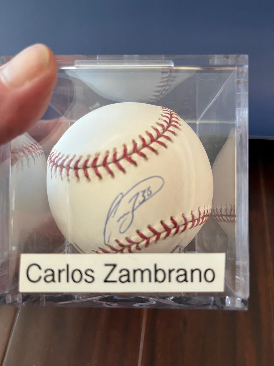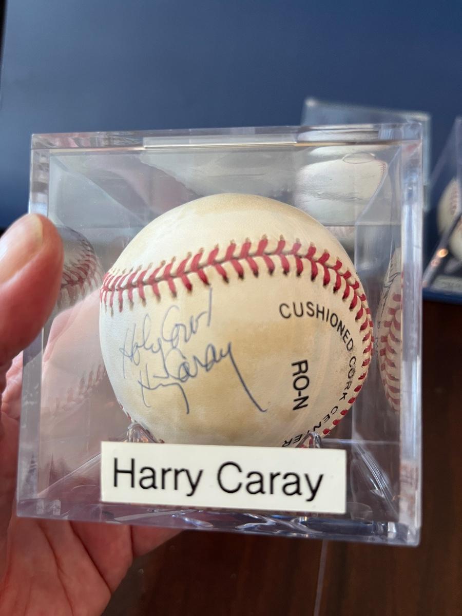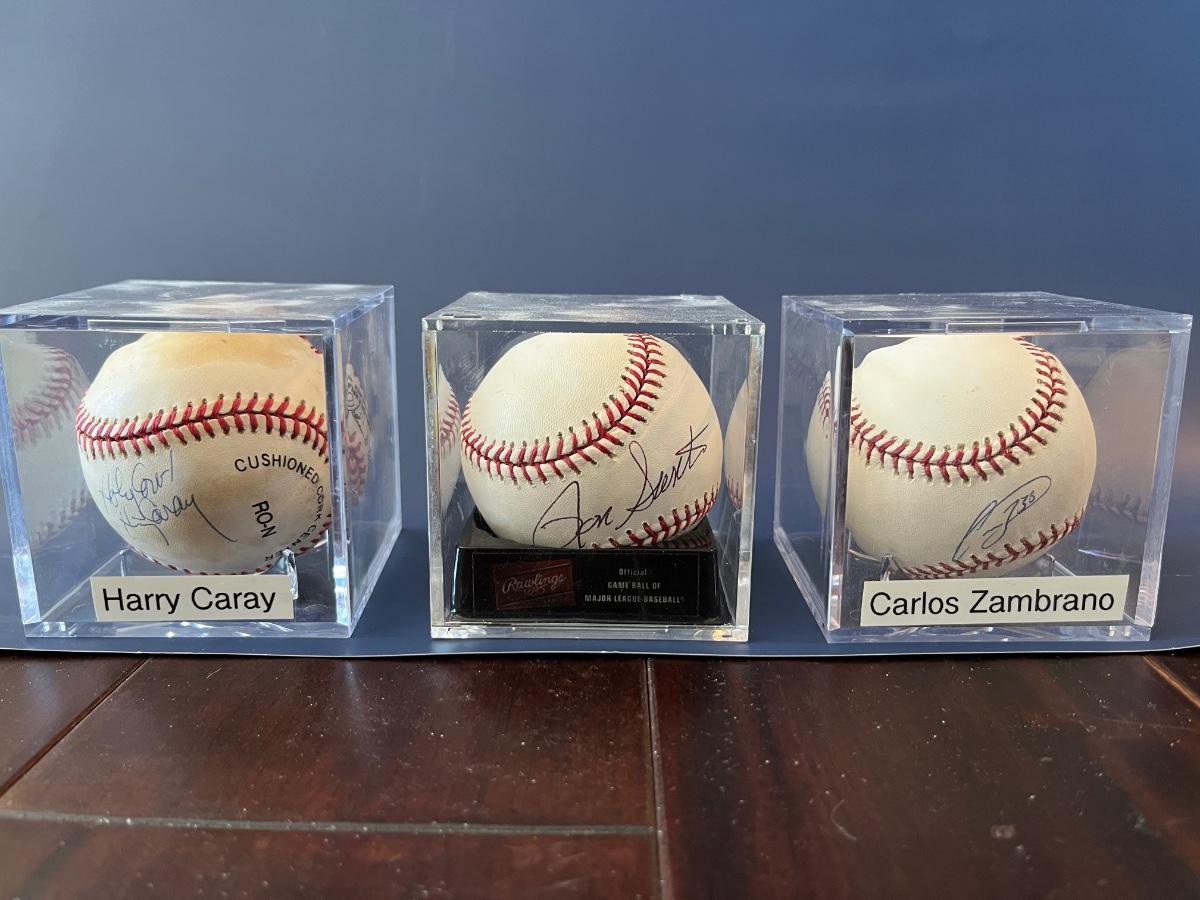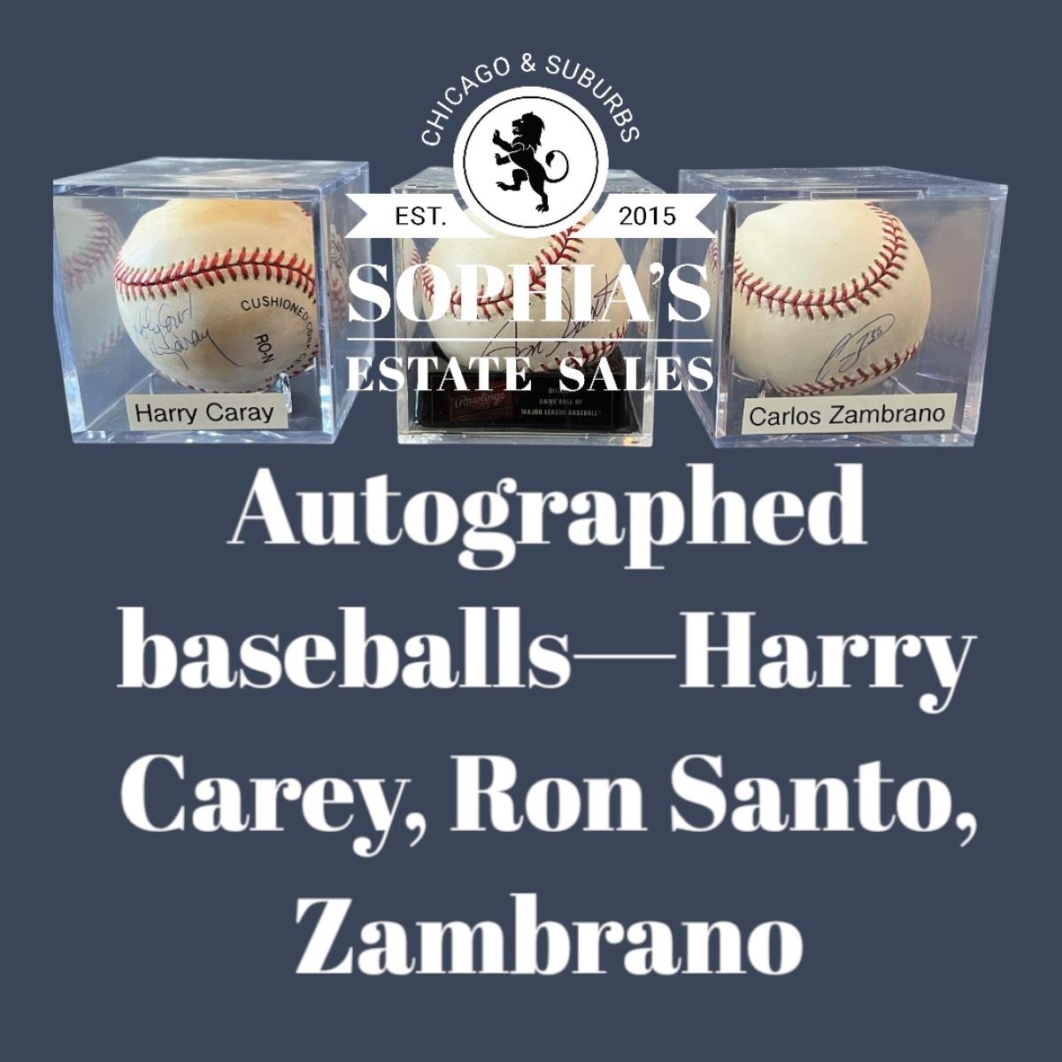 A lot of three autographed baseballs: Harry Caray, Ron Santo and Carlos Zambrano. All have been stored in display cases out of direct light and are in excellent condition.