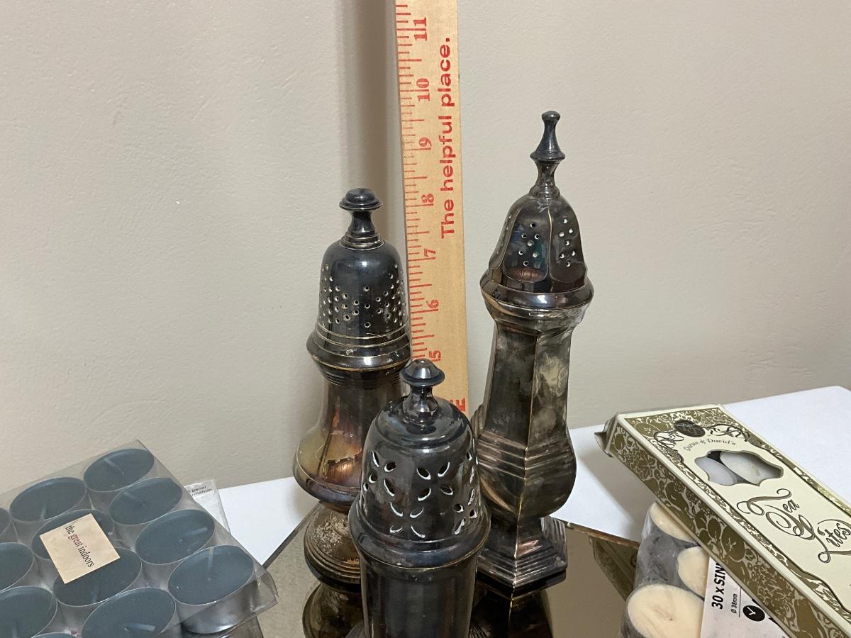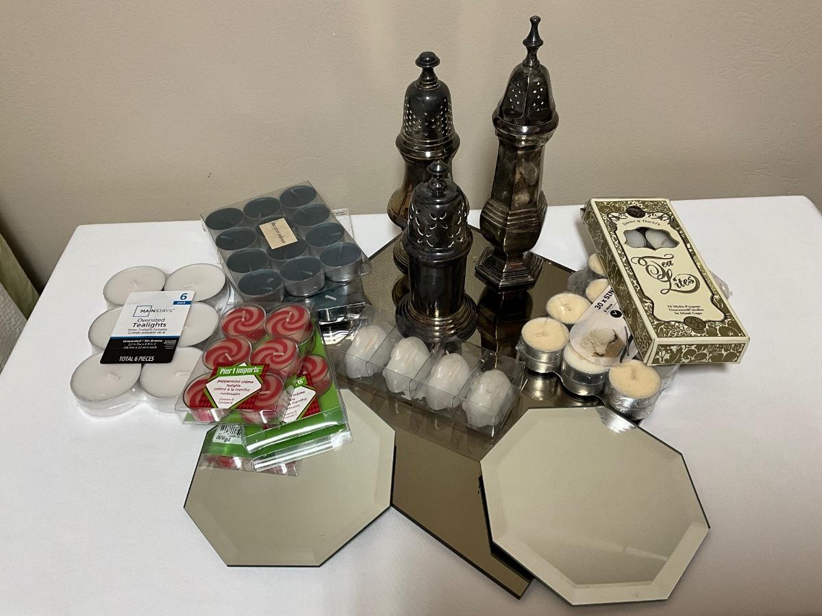 3 Silver plated Potpourri containers, 3 glass mirror plates, and lots of tea candles