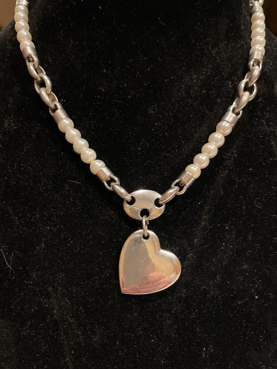 Silver tone heart and faux pearls