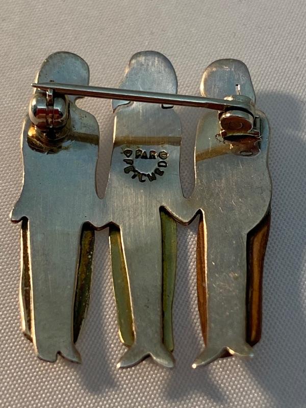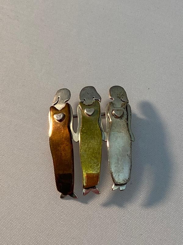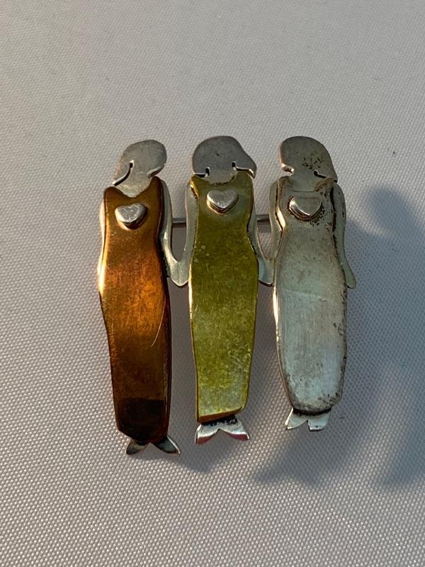 Multi toned pin by Far Fetched. Silver, copper, and brass. Could represent 3 sisters, bestfriends, or mother/daughters. Each has a heart on her. Unsure if this is sterling because there is no stamp but research makes me think it is.