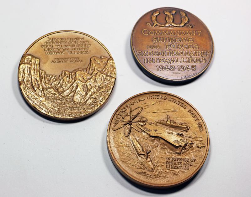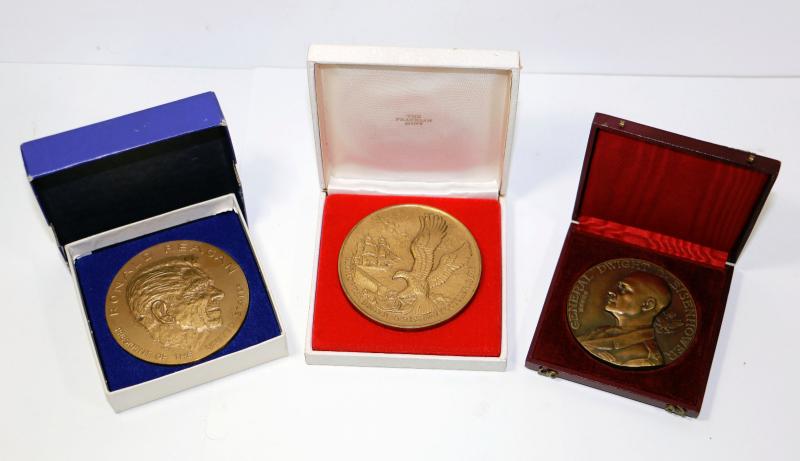 3 Solid Bronze Medallions - Eisenhower Reagan US Navy - In Cases.