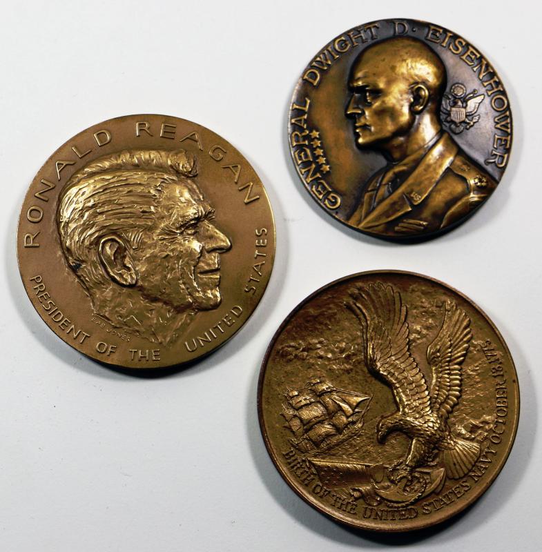 3 Solid Bronze Medallions - Eisenhower Reagan Birth of the US Navy - In Cases