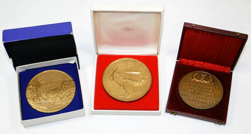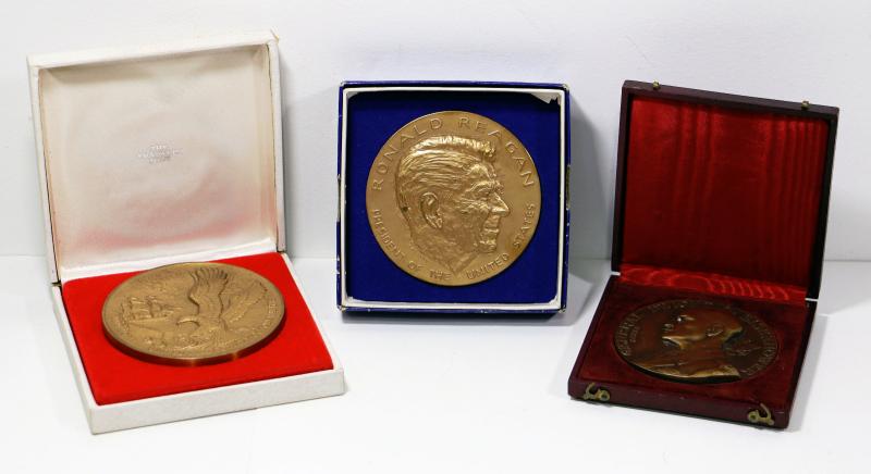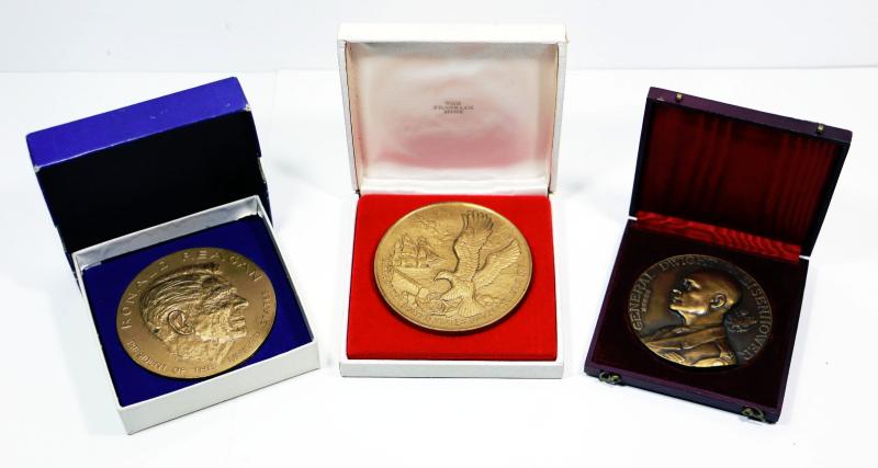 Included: General Dwight D. Eisenhower Bronze medallion by A. Morlon 2-3/4" diameter, Ronald Reagan bronze medallion by Treasury Bureau of The Mint, 3" diameter, Birth of The United States Navy bronze medallion by Franklin Mint, 3" diameter, All solid bronze and all in original cases - as seen on pictures.