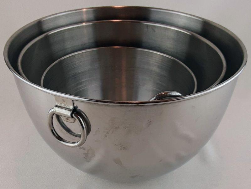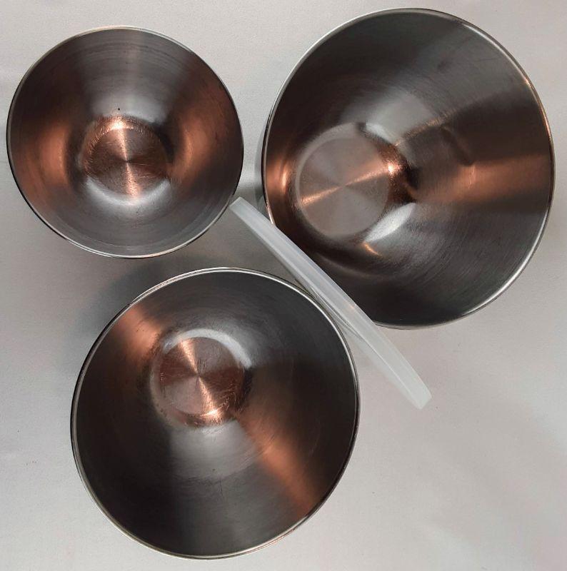 The largest bowl has some slight dents. It measures 5in. tall and 7.5in. diameter. The middle bowl has a plastic lid and is 4.5in. tall and 6.75 diameter. The smallest is 3.5in. tall and 5.5in. diameter.