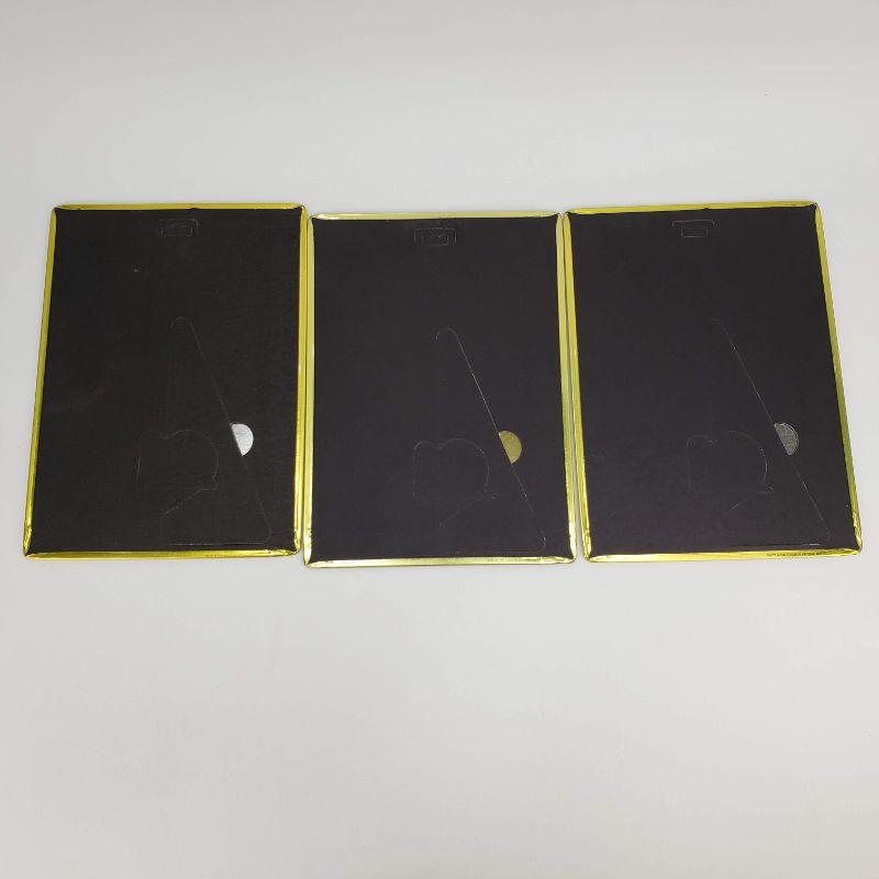Have a built in stand on the back for display. Each has some scratches in the corners. Each has a small crease in the top middle where it bent a little.