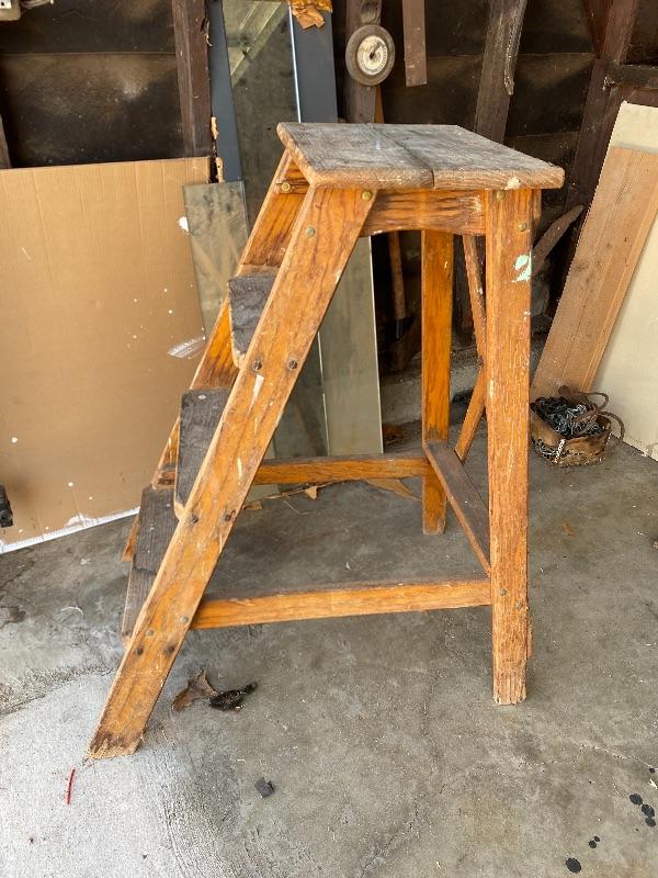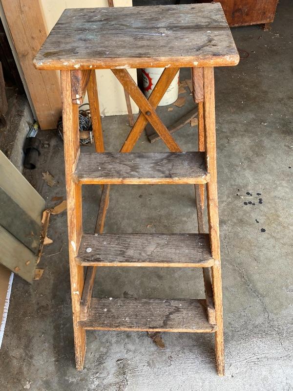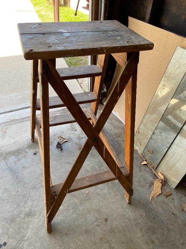 3 step with standing platform wood ladder. Fixed frame so it does not fold. Sturdy, stepped up on platform to check. Stands about 36"