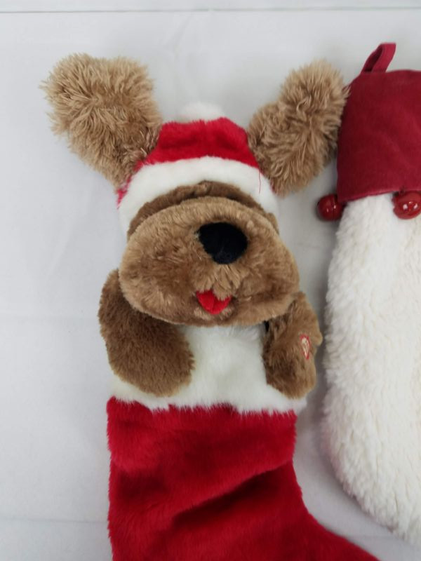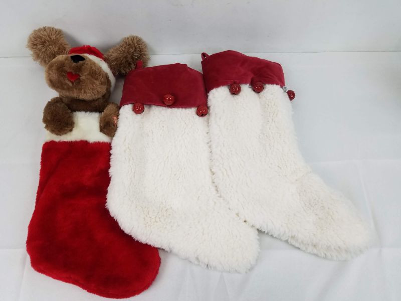 3 Stockings - 2 White with Bells, one Reindeer Plays Music