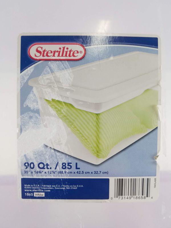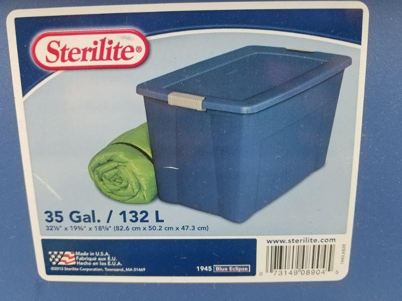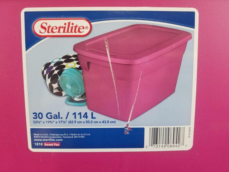 3 Storage Bins with Cracks. Blue 35 Gallons, Pink 30 gallons, Clear 90 ct