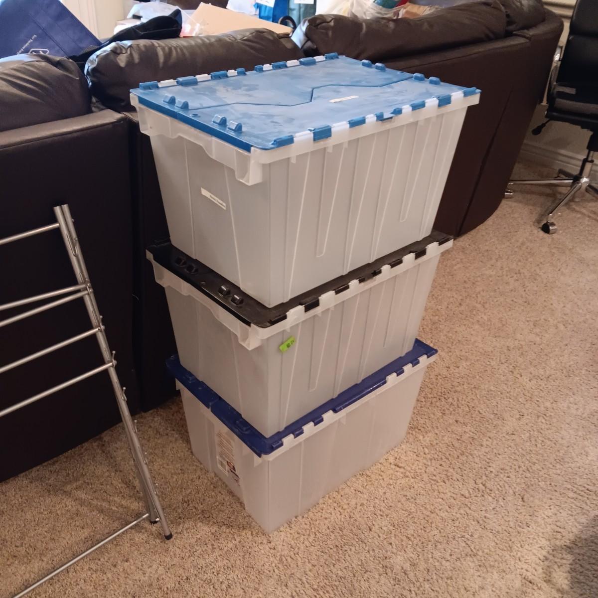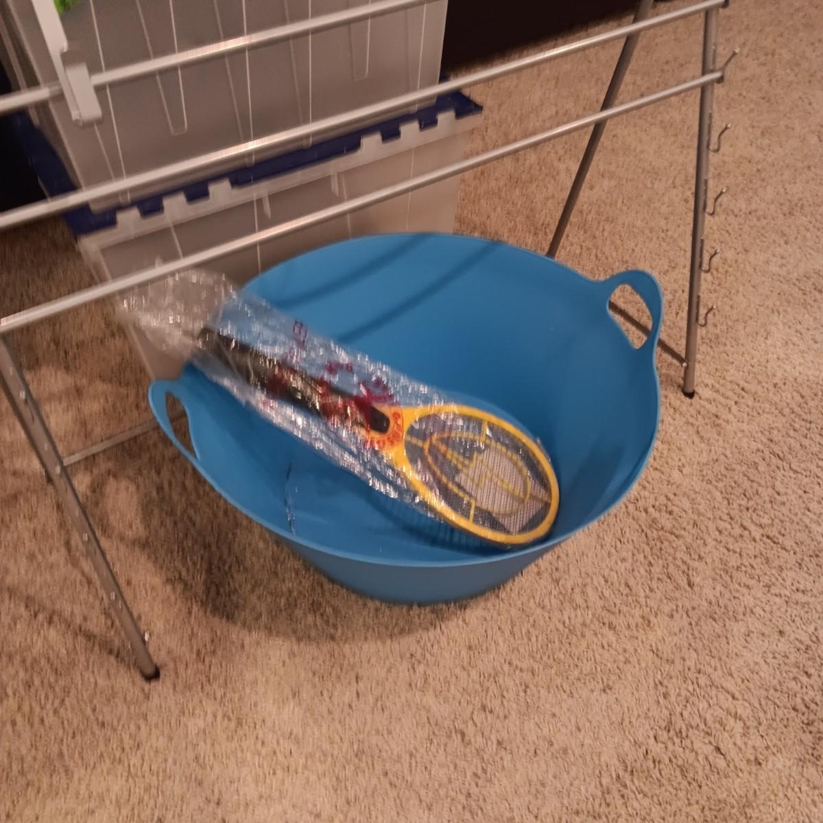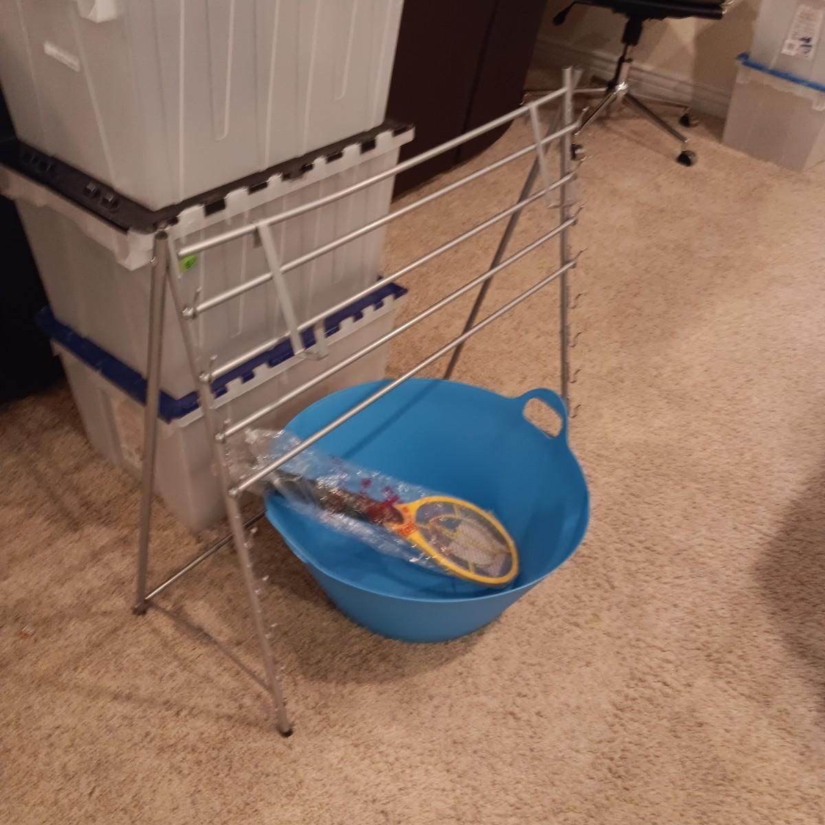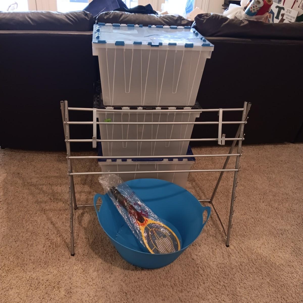 3 STORAGE TOTES, AN ORGANIZER, FLY ZAPPER AND PLASTIC TUB