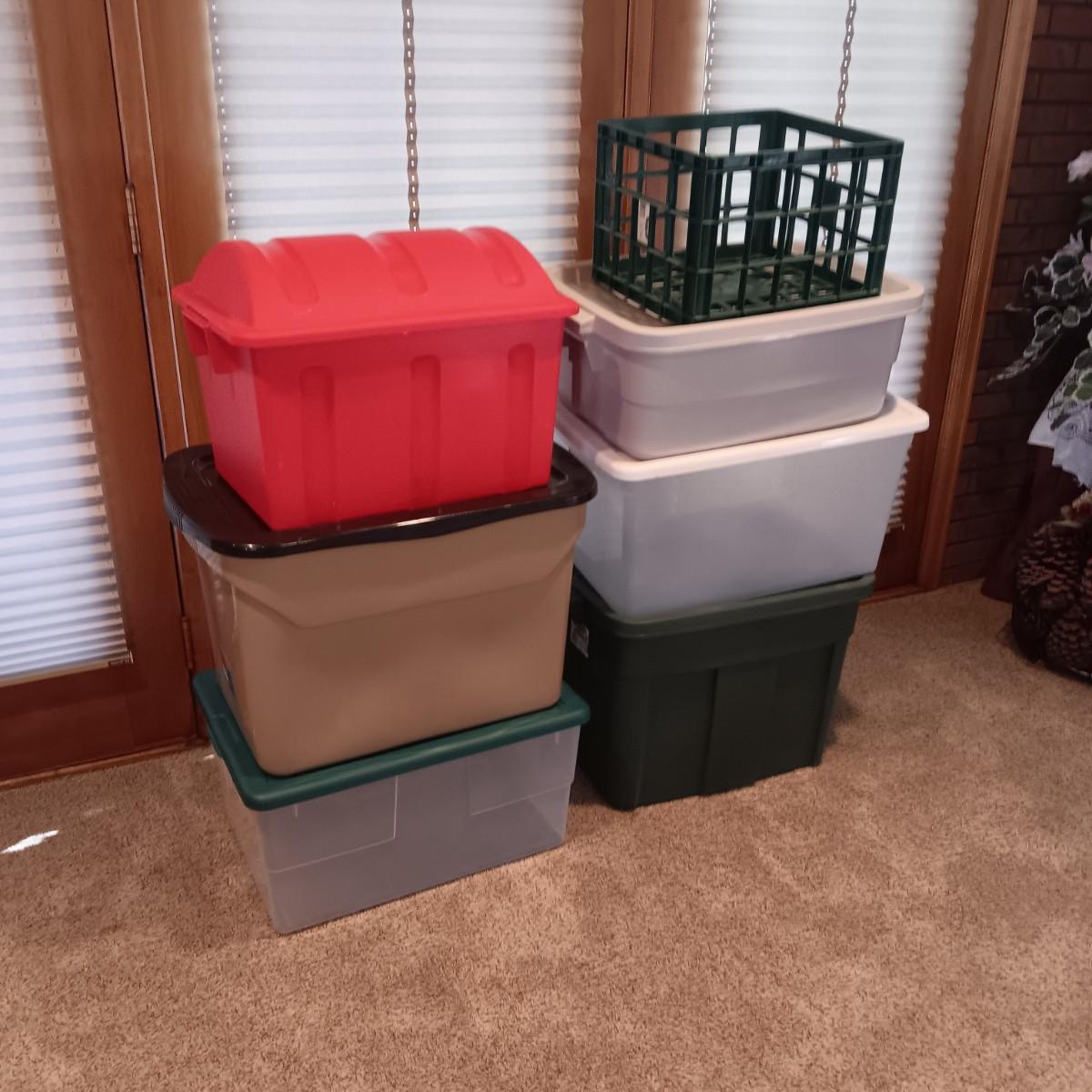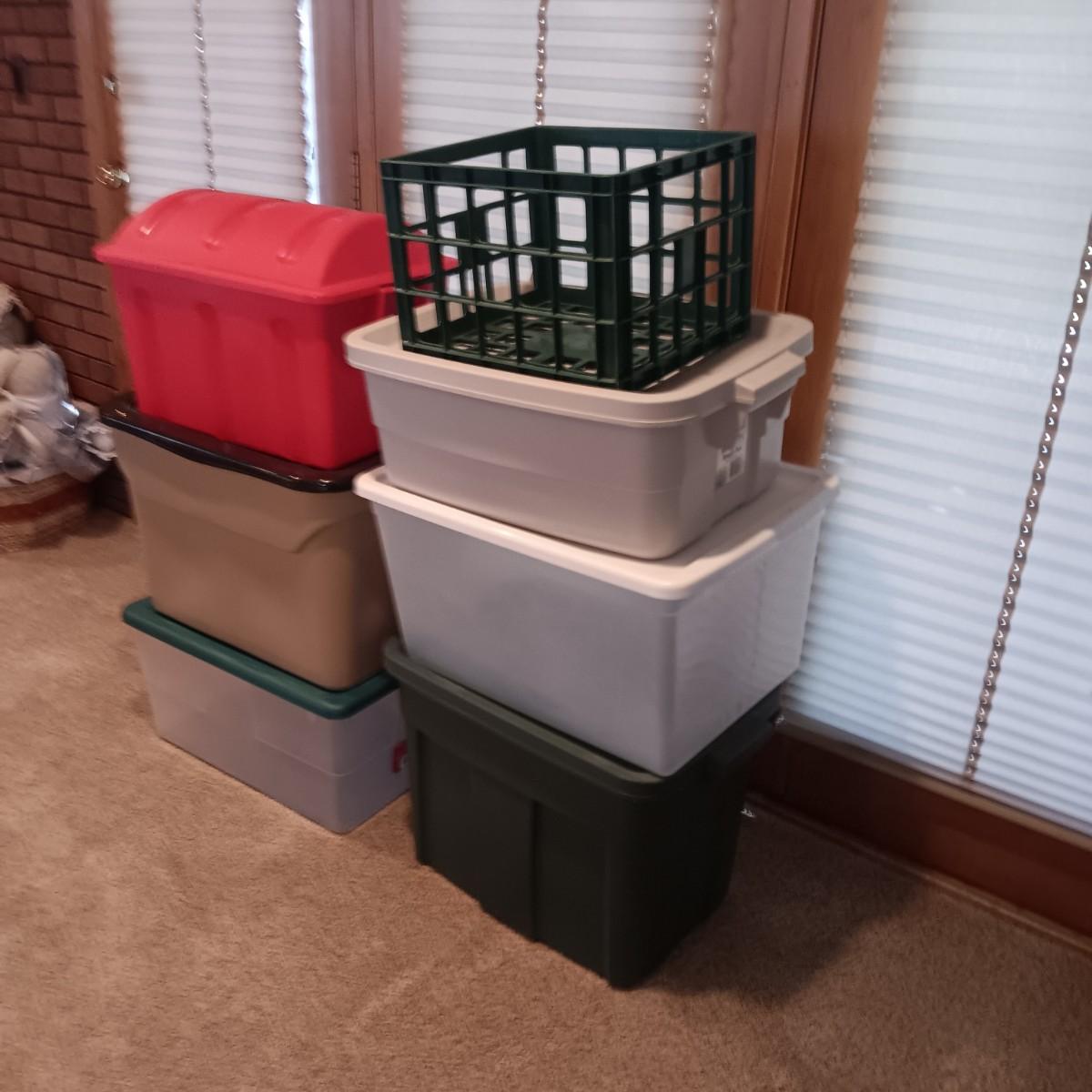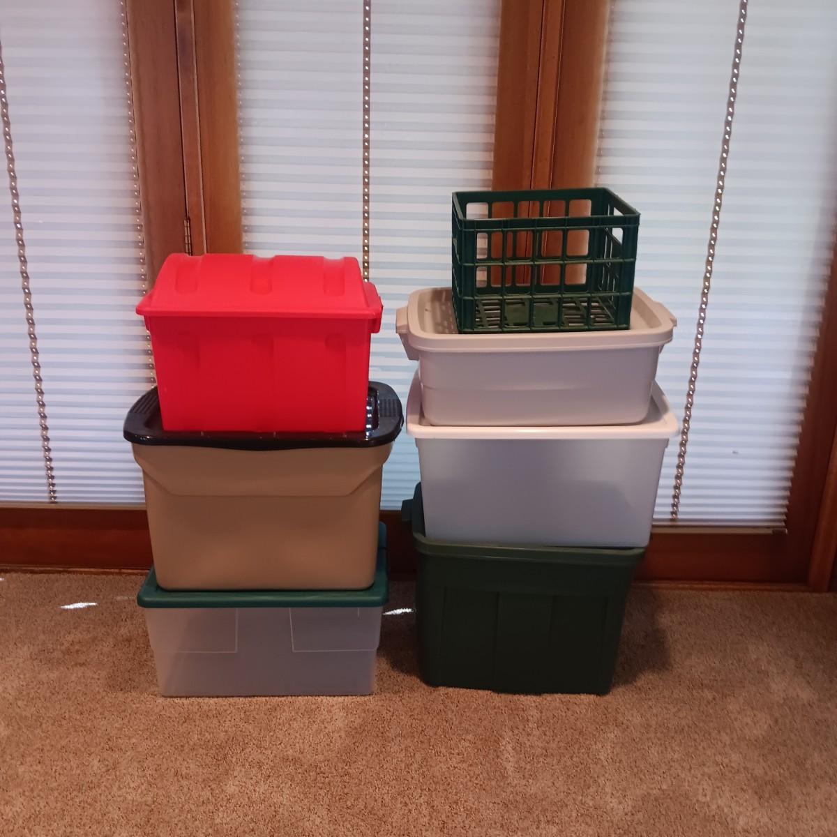 6 STORAGE TOTES AND A MILK CRATE