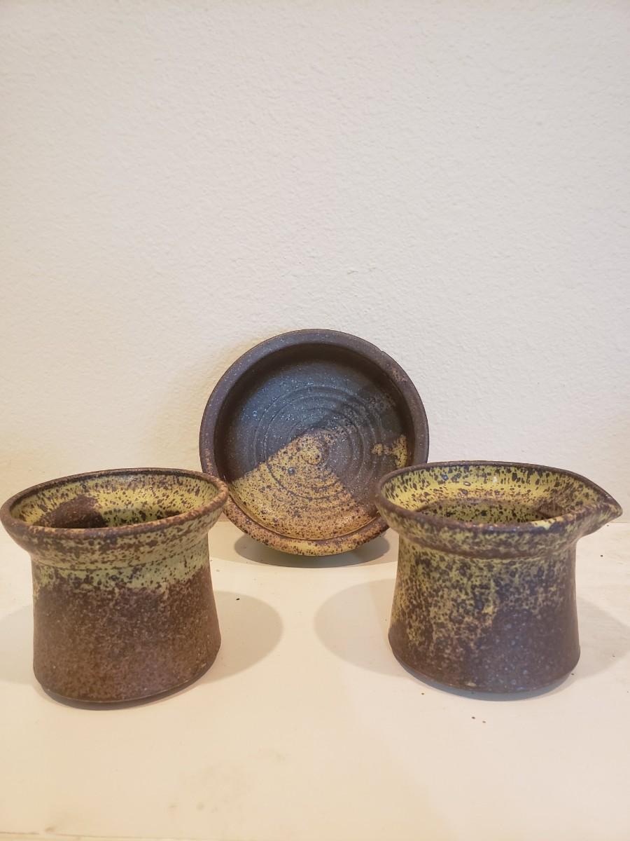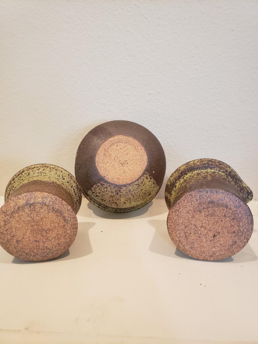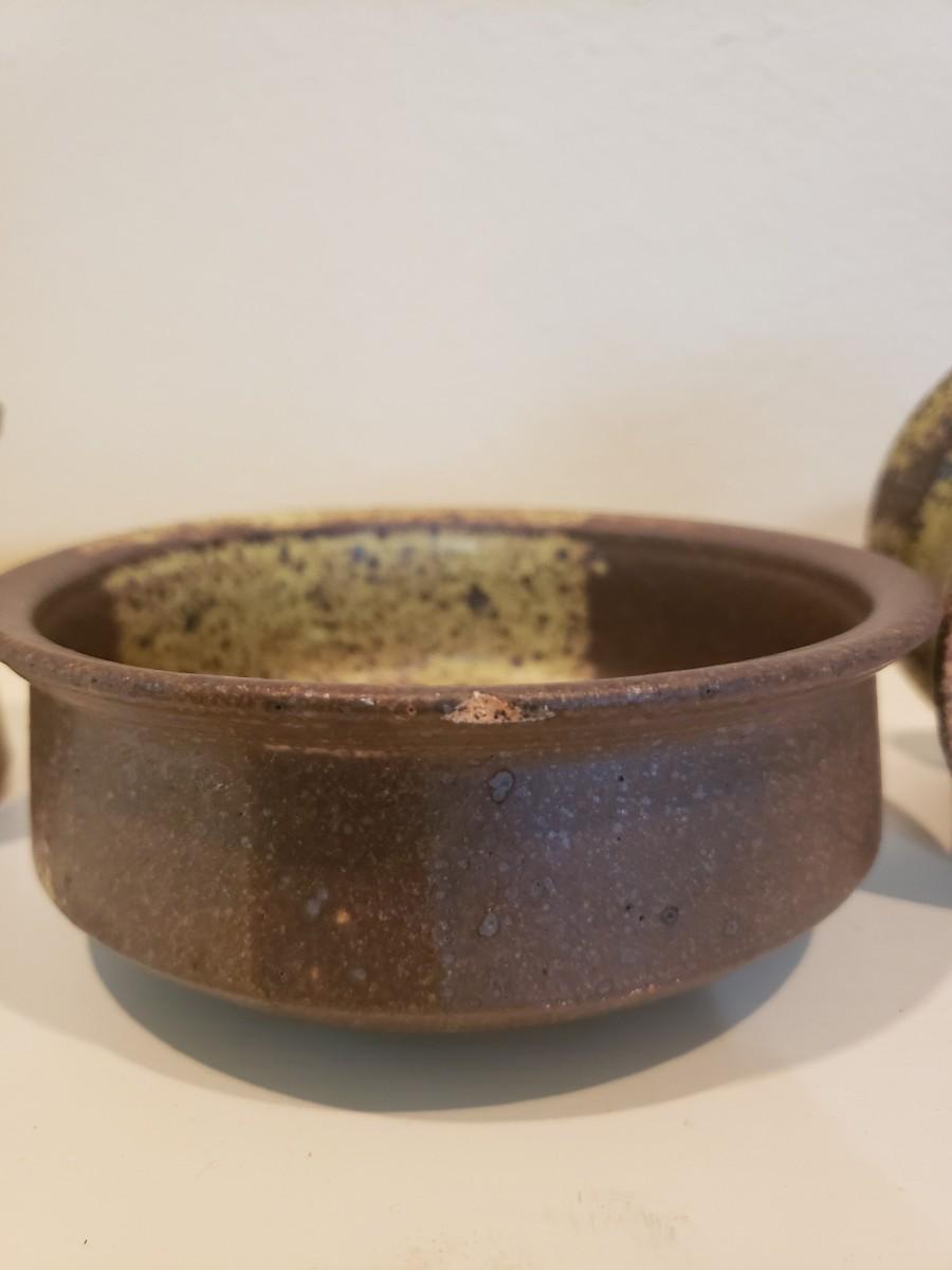 Lot of 3 unsigned studio pottery pieces. Sugar 3" H x 3.5"W. Creamer 4" W x 3"H. Bowl has a small chip on the rim 2"H x 5.5"W see photo.
