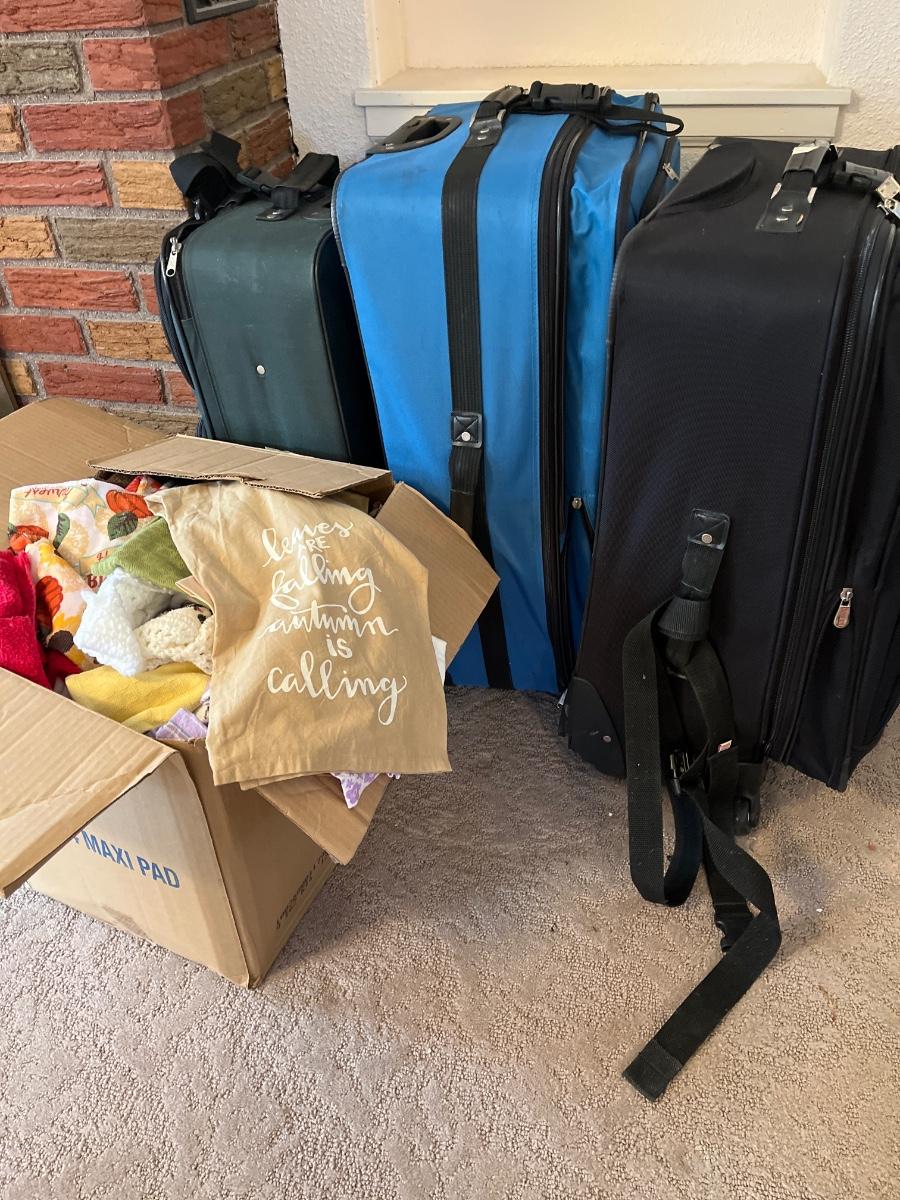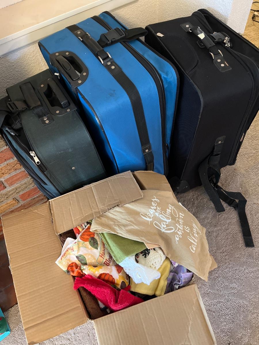 3 suitcases and a box of towels