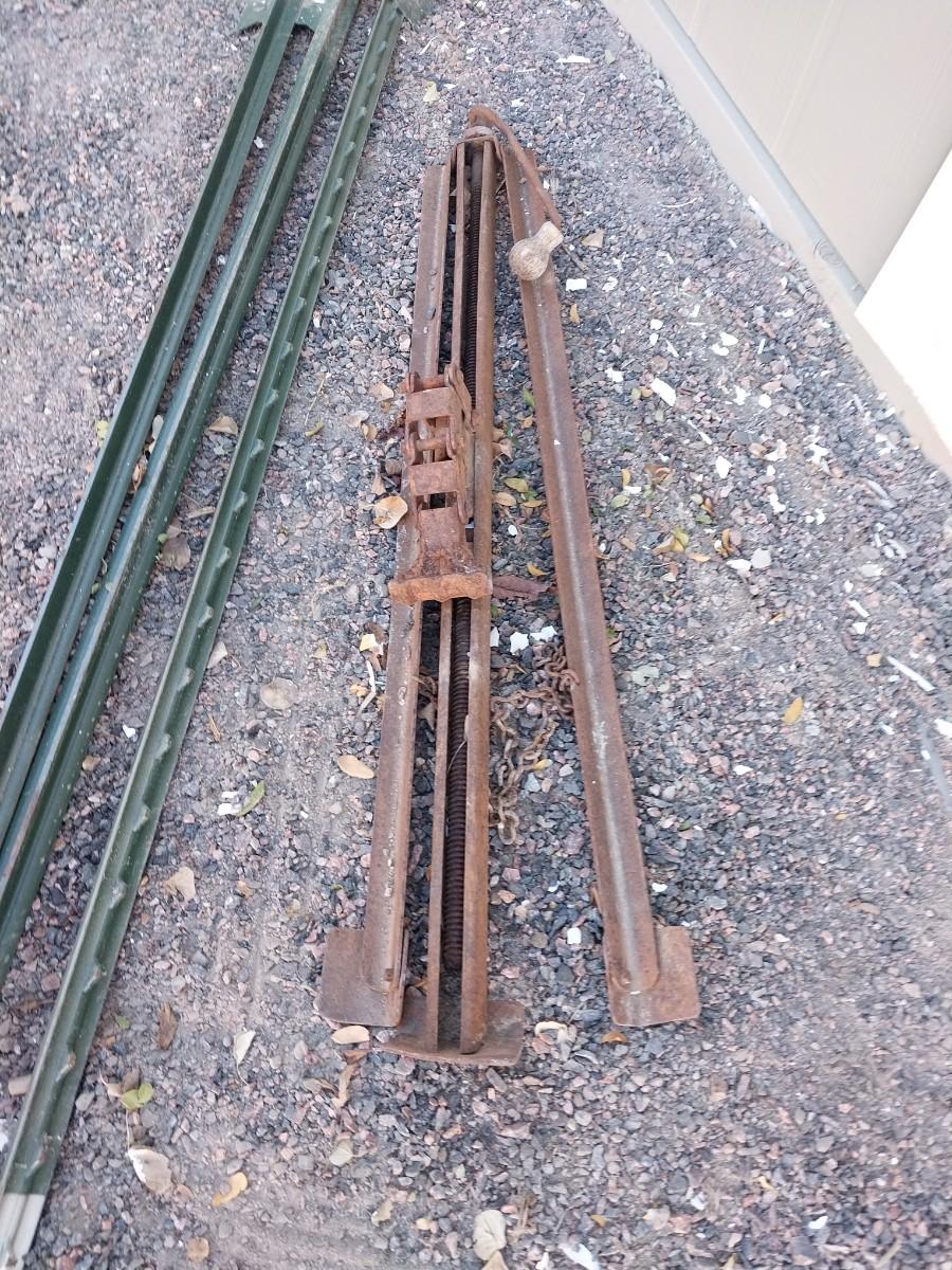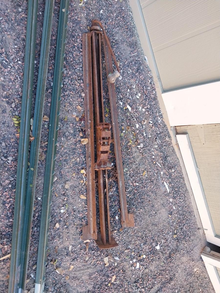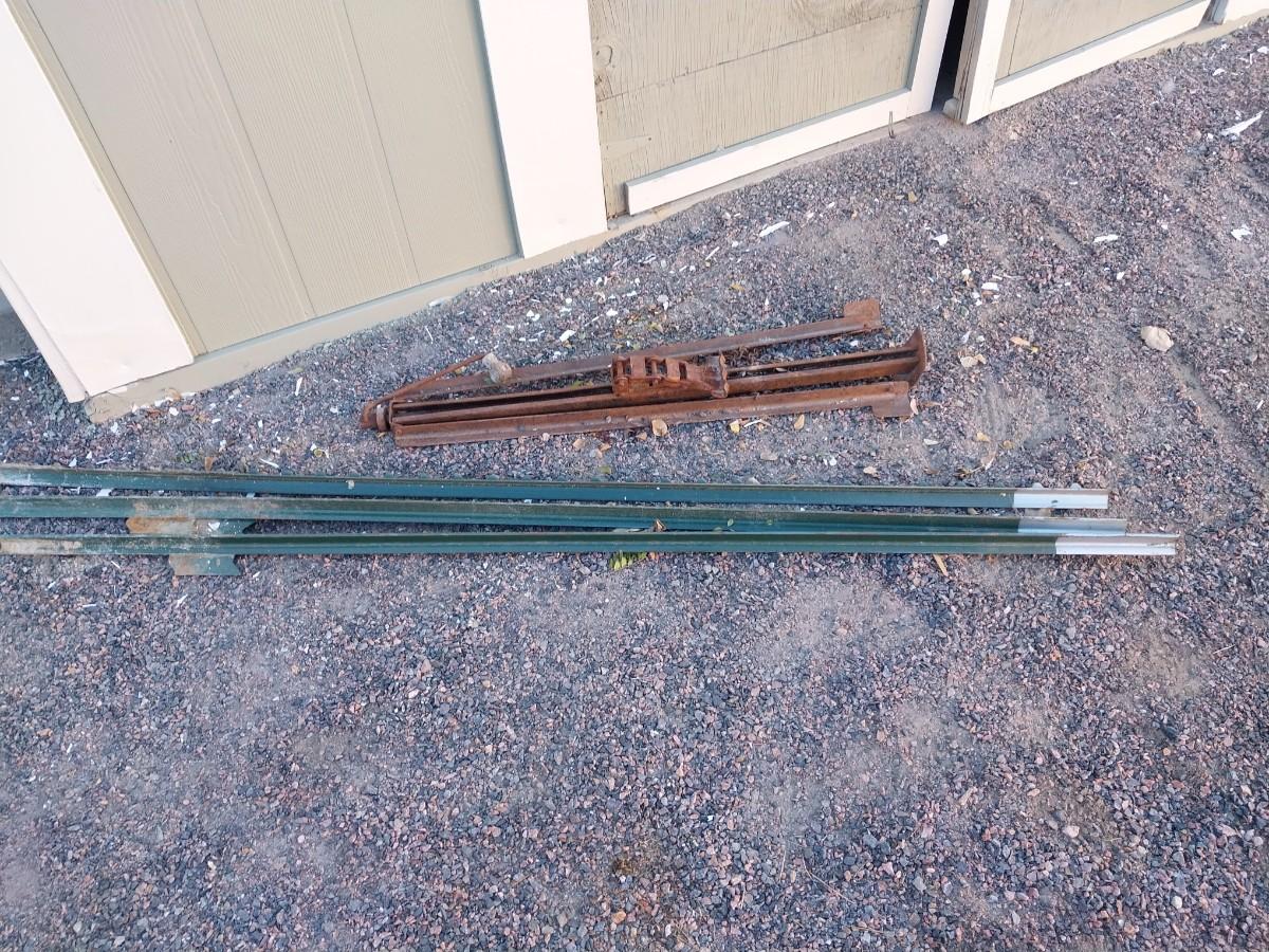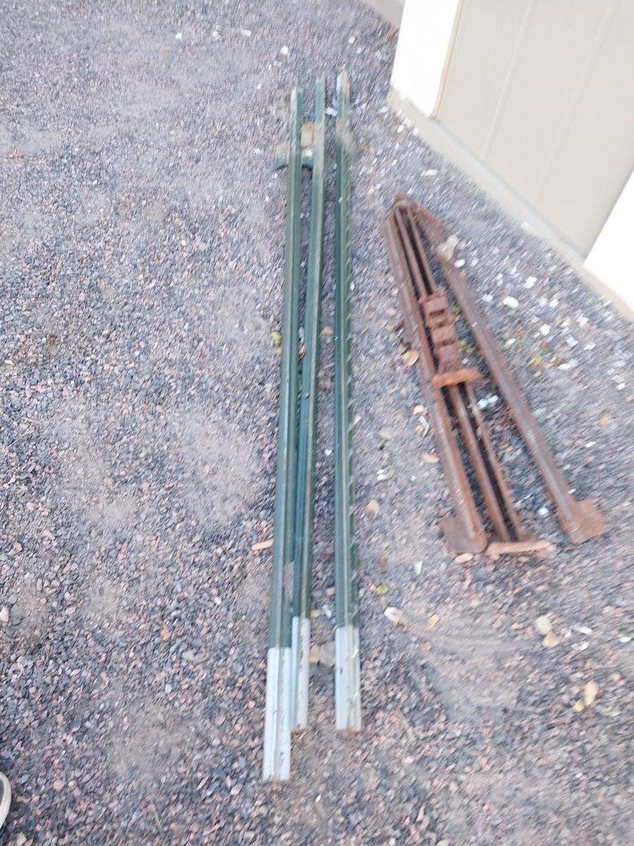 3 T POSTS, STEEL PIECE, GARDEN HOSE AND 4 CONCRETE BLOCKS