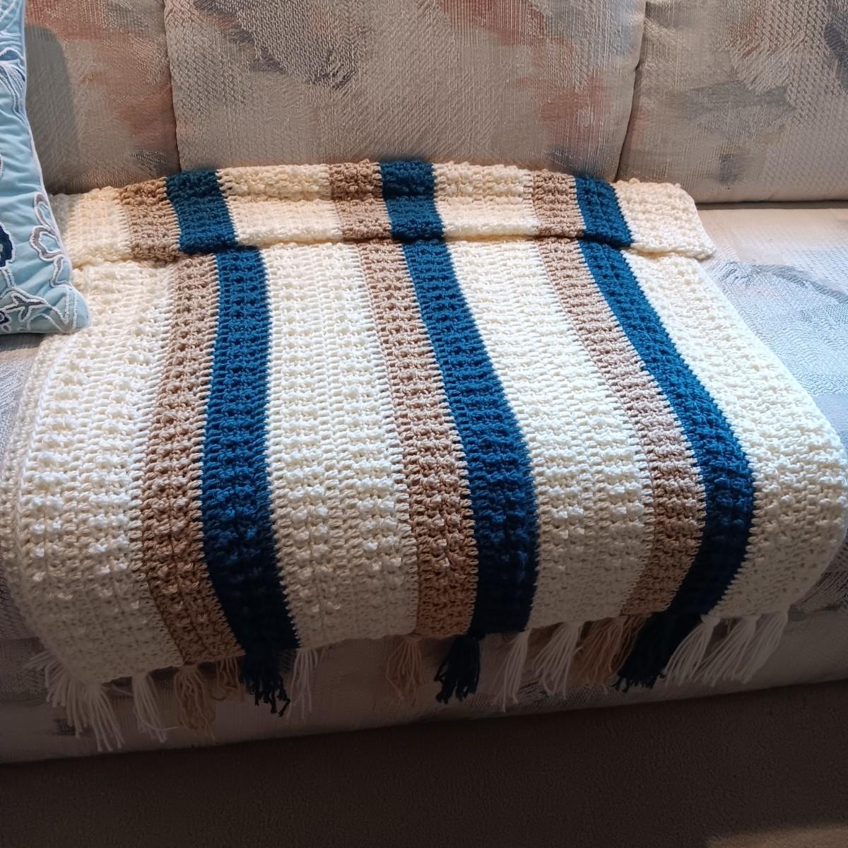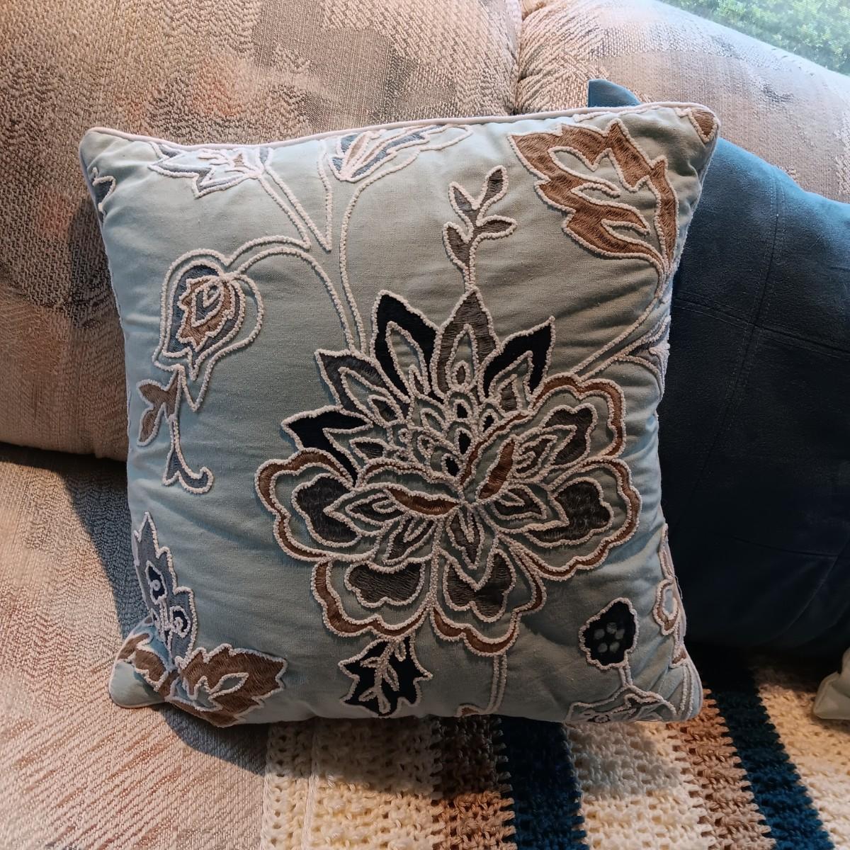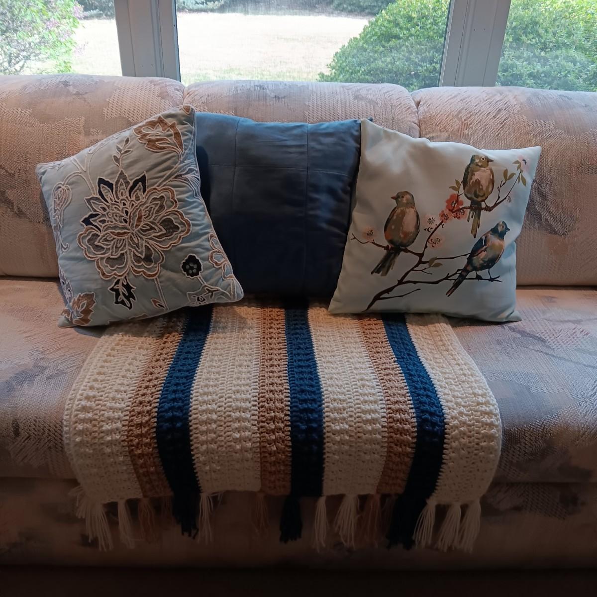 3 THROW PILLOWS AND A HAND CROCHETED THROW BLANKET