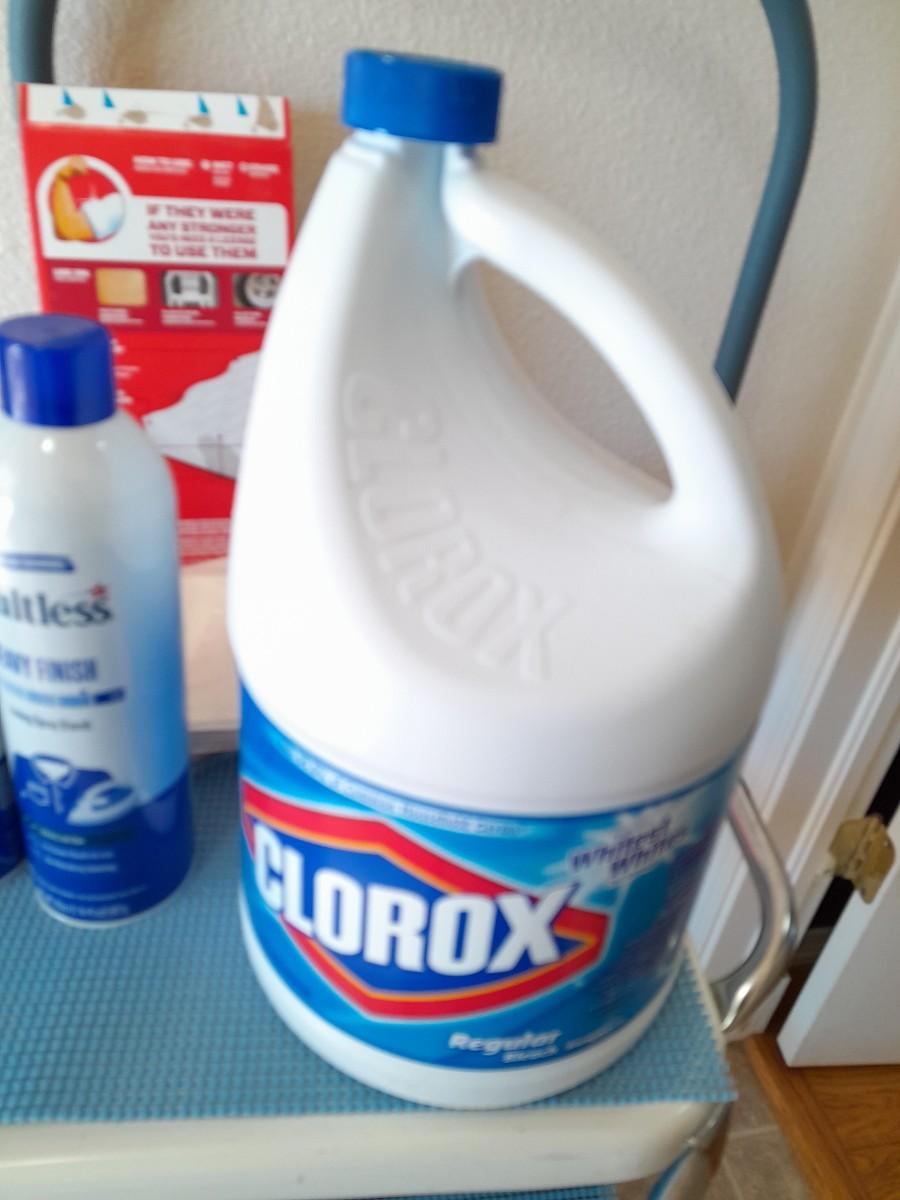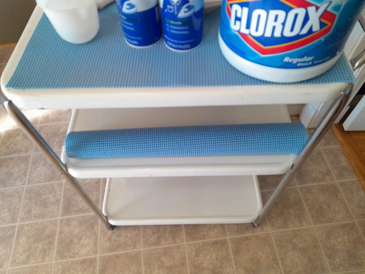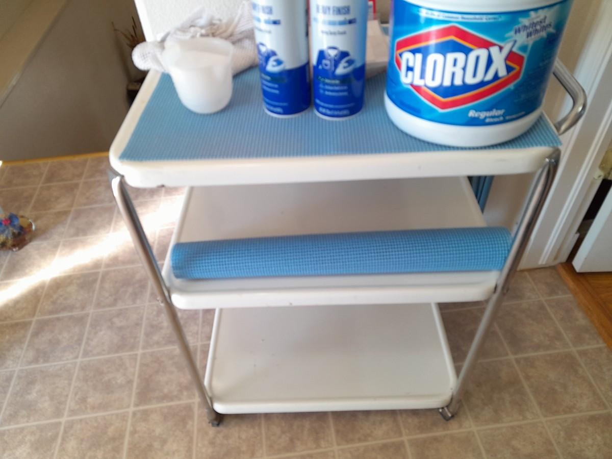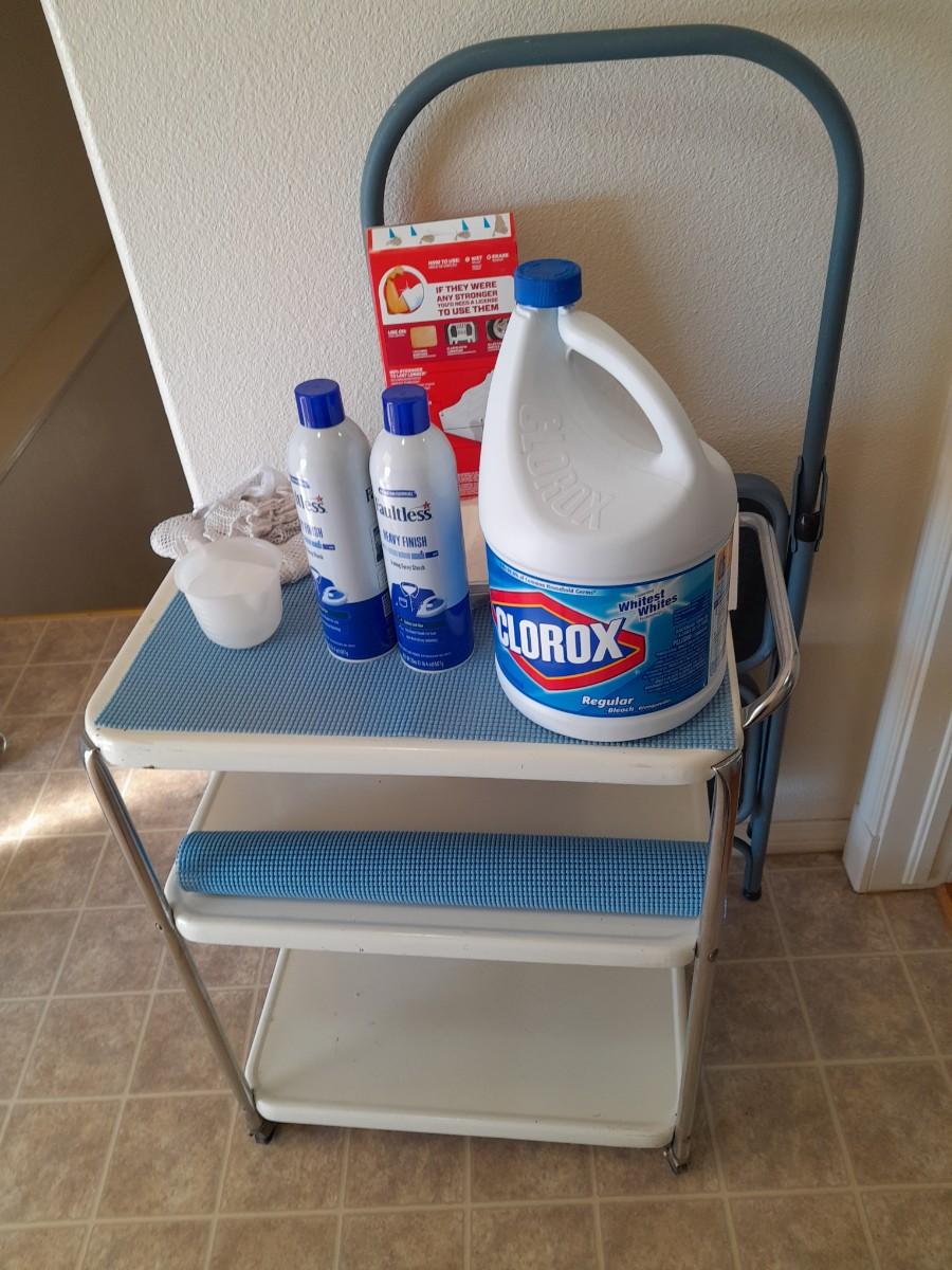 THE CART 29" X 23" X 15.5" NEEDS TO BE TIGHTENED UP AND THE BLEACH IS APPROX 1/4 FULL