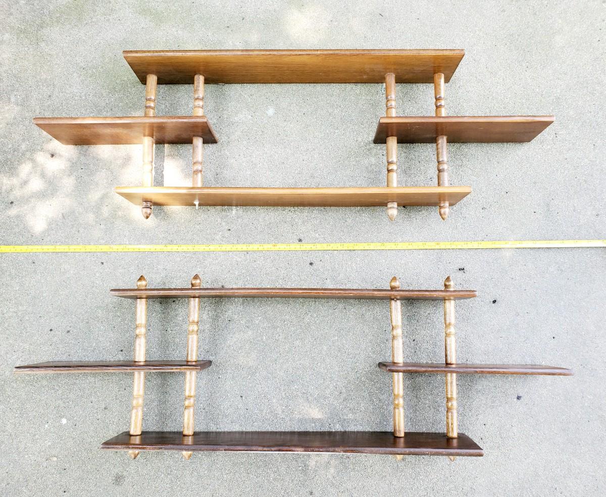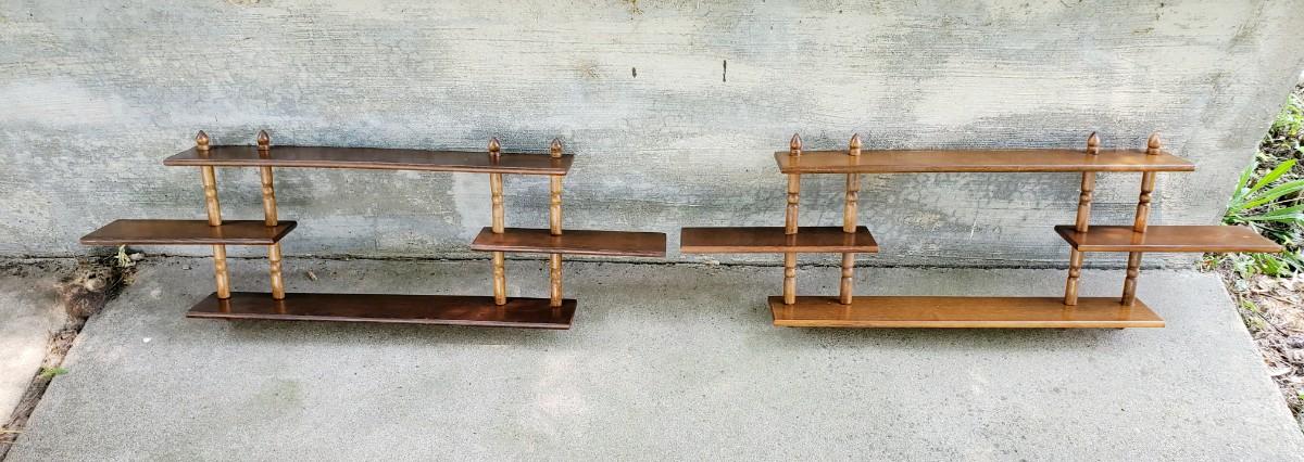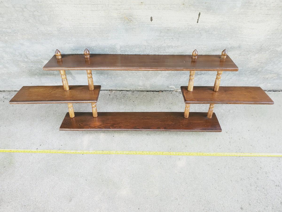 Nice wooden 3 tiered wooden shelves, one is missing a bottom knob, see photos, good condition otherwise
