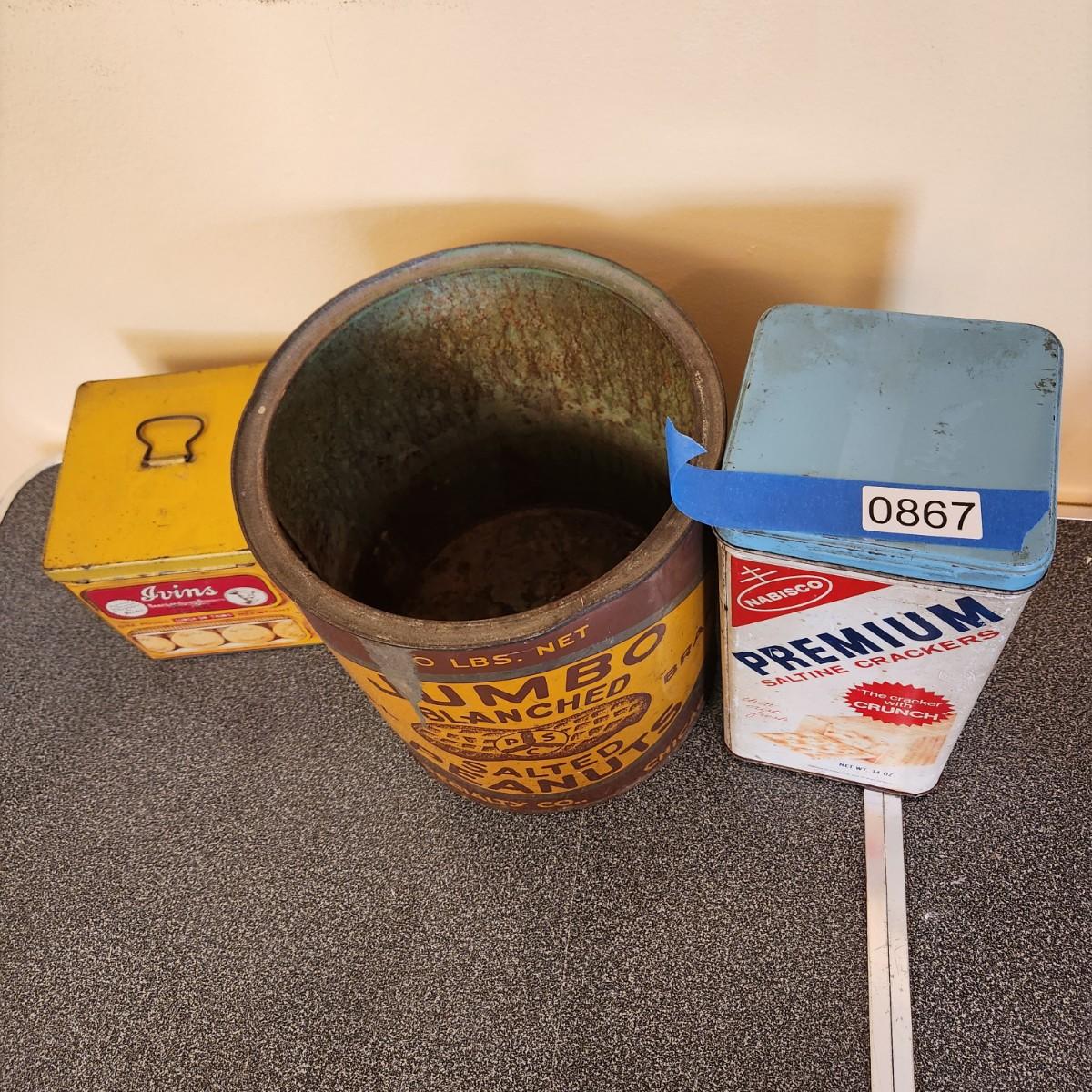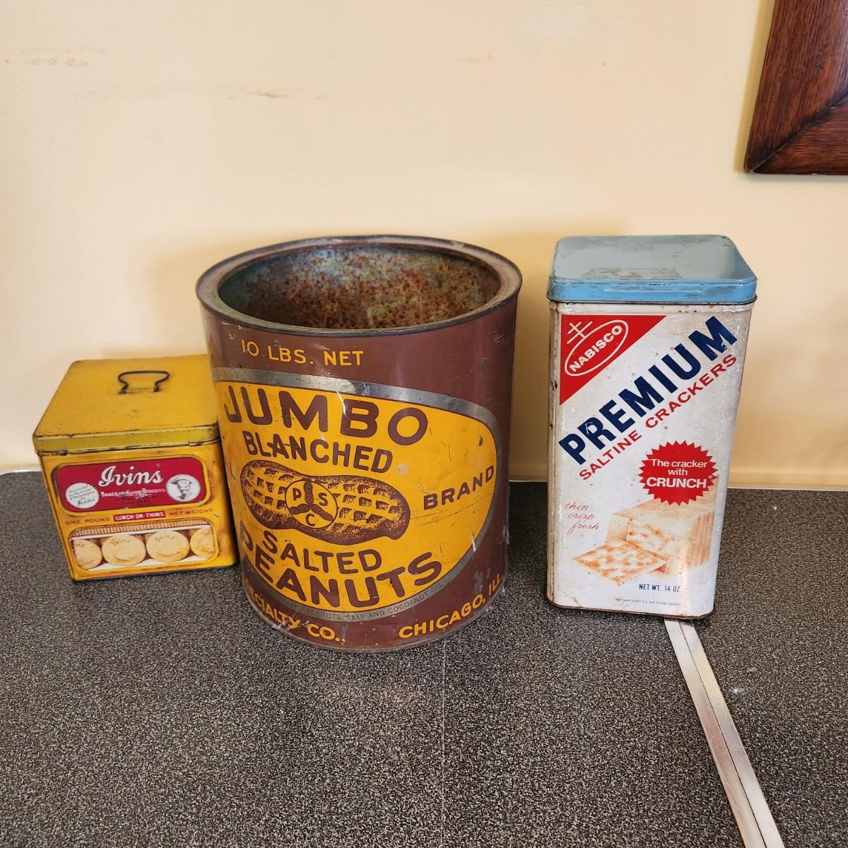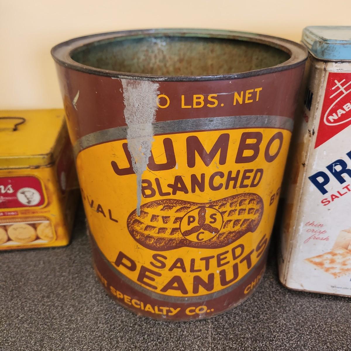 3 Tin Cans Ivins Biscuits, Nabisco, Oval Chicago Jumbo Salted Peanuts Can 10 lb.