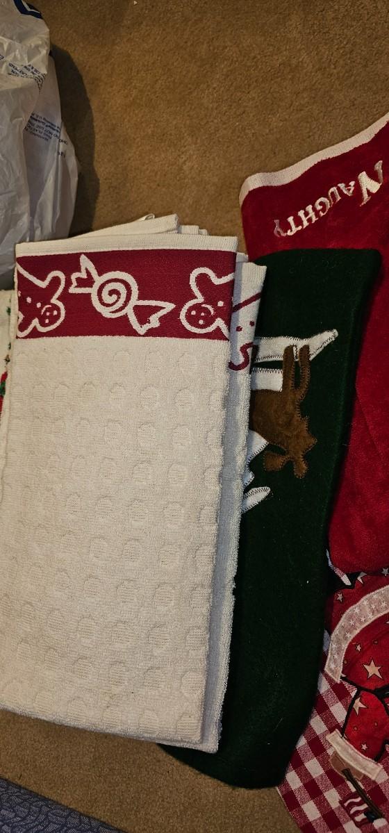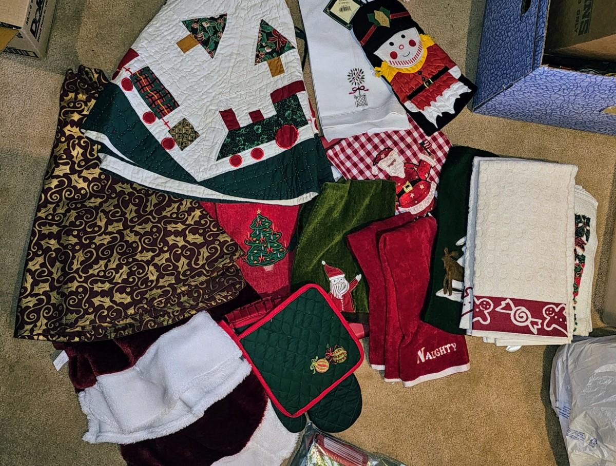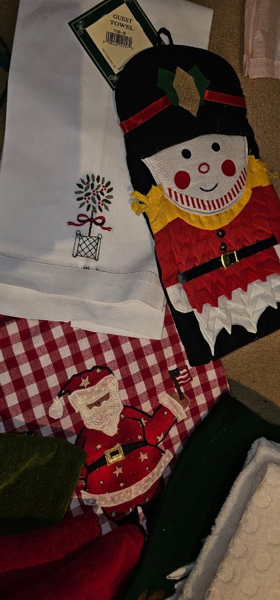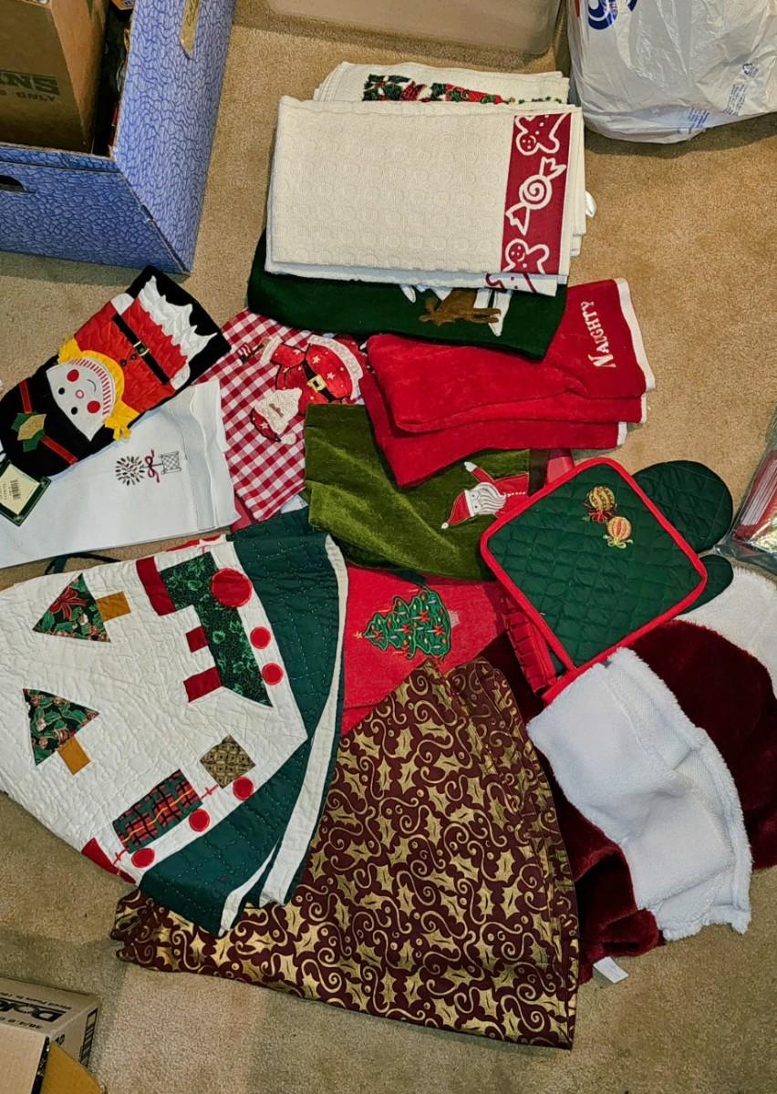 3 tree skirts, Christmas dish towels, Christmas oven mitts Large lot of Christmas items
