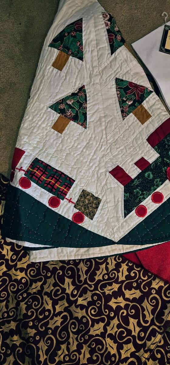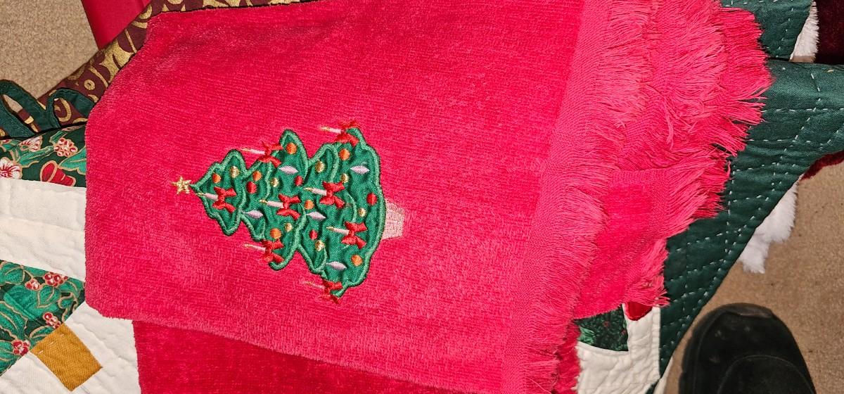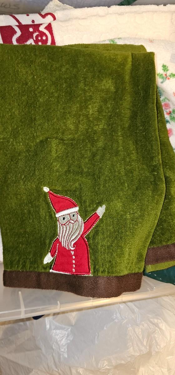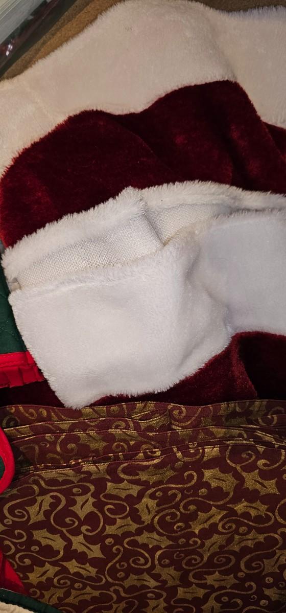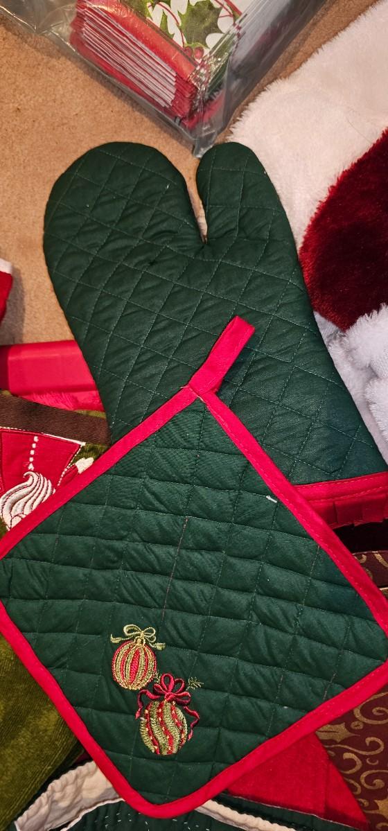 3 tree skirts, Christmas dish towels, Christmas oven mitts Large lot of Christmas items