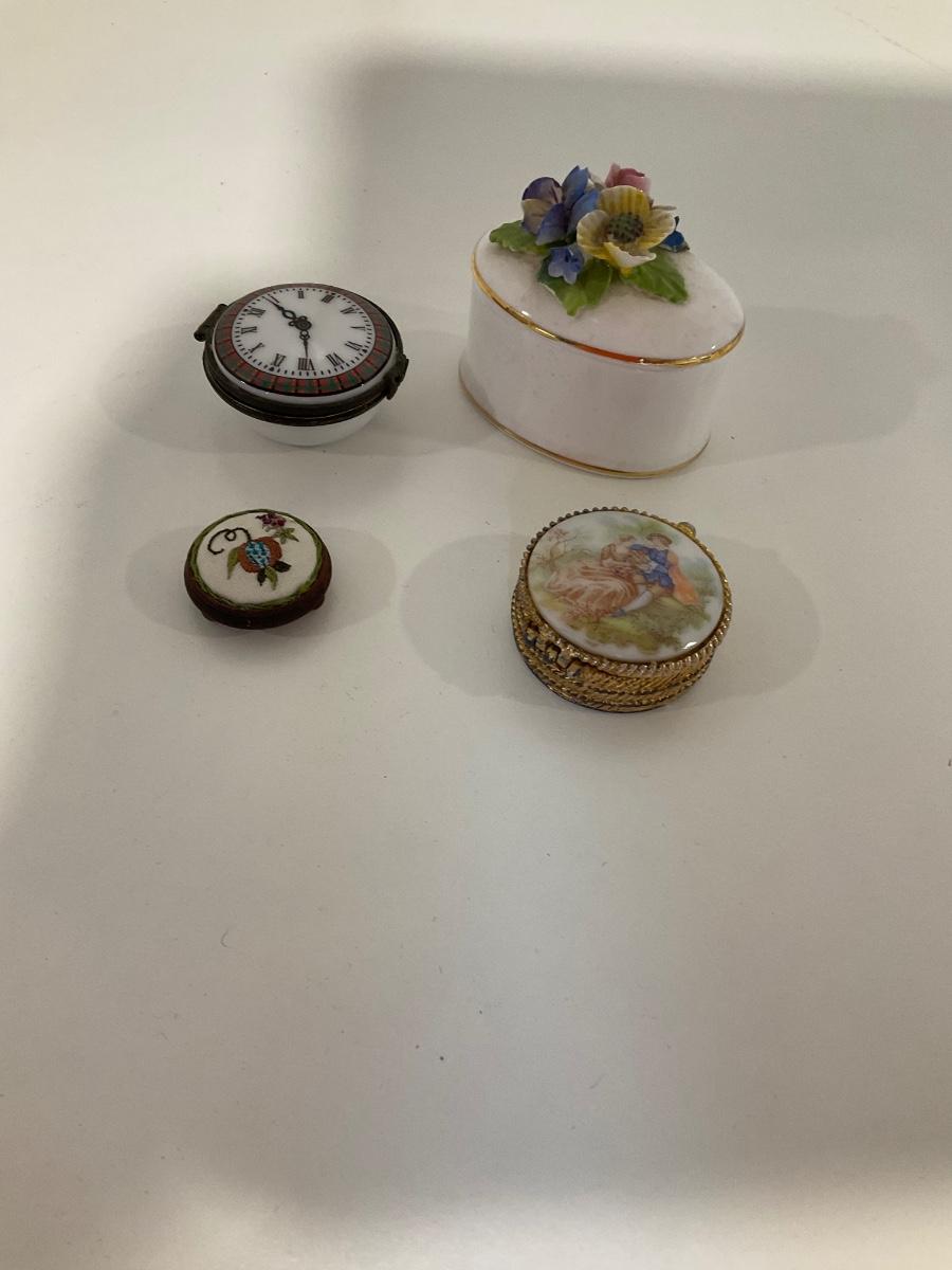 Each trinket boxes open, round ones have hinge, oval one has lid that can be removed