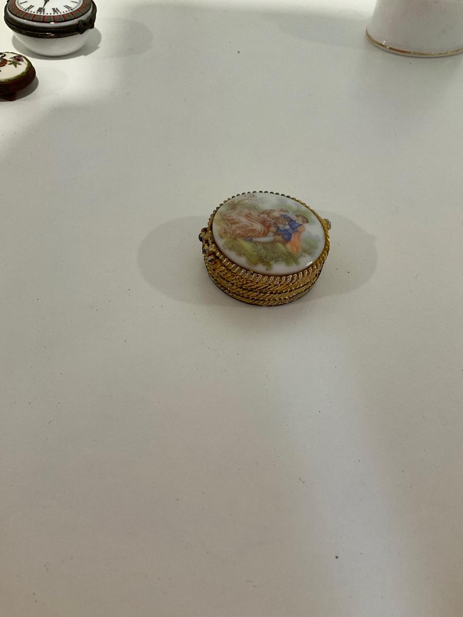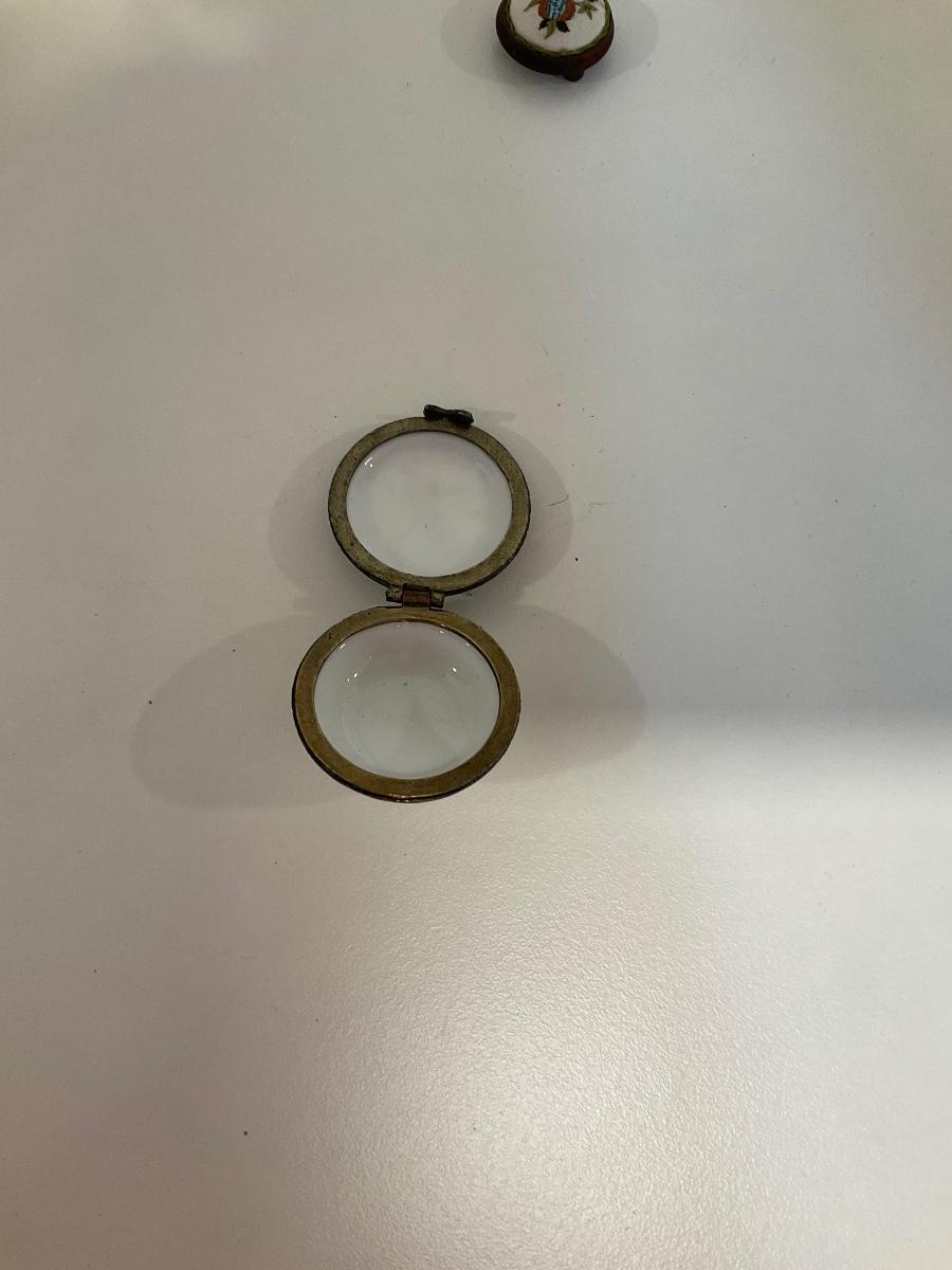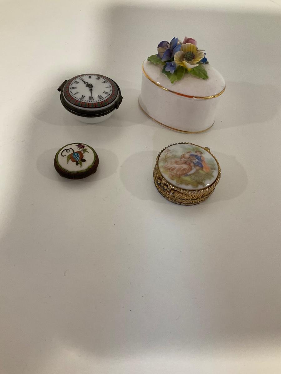 Each trinket boxes open, round ones have hinge, oval one has lid that can be removed