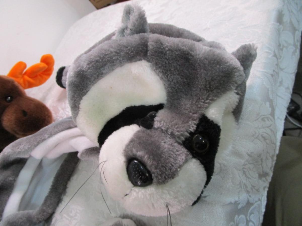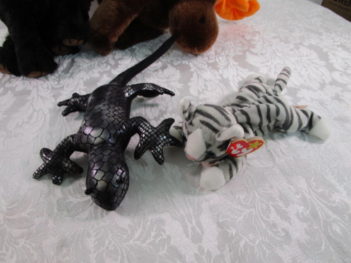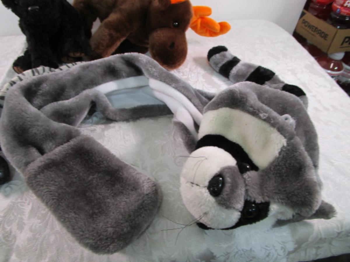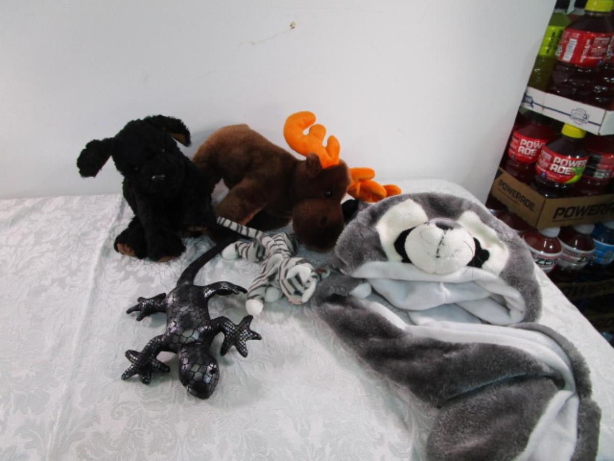 3 Ty stuffed animals, 1 stuffed lizard, 1 raccoon hat with gloved ends