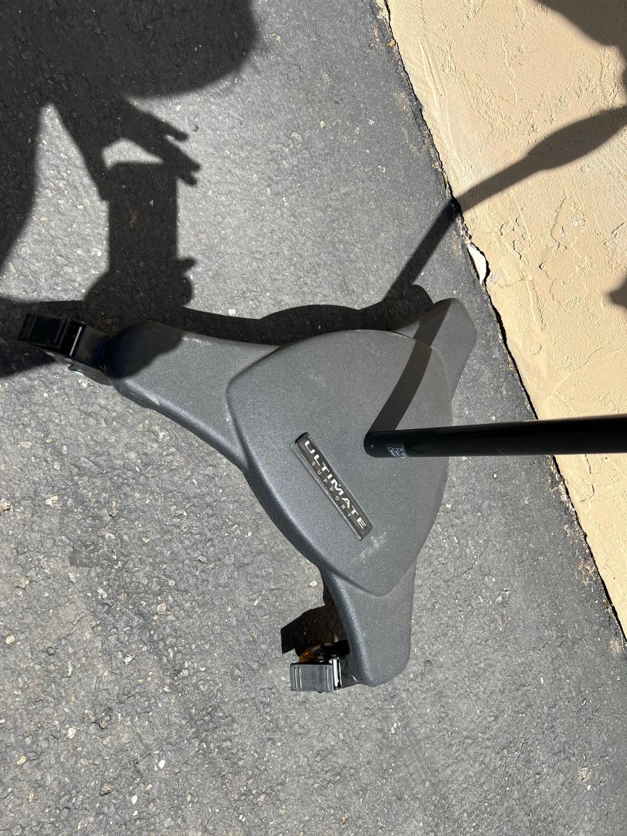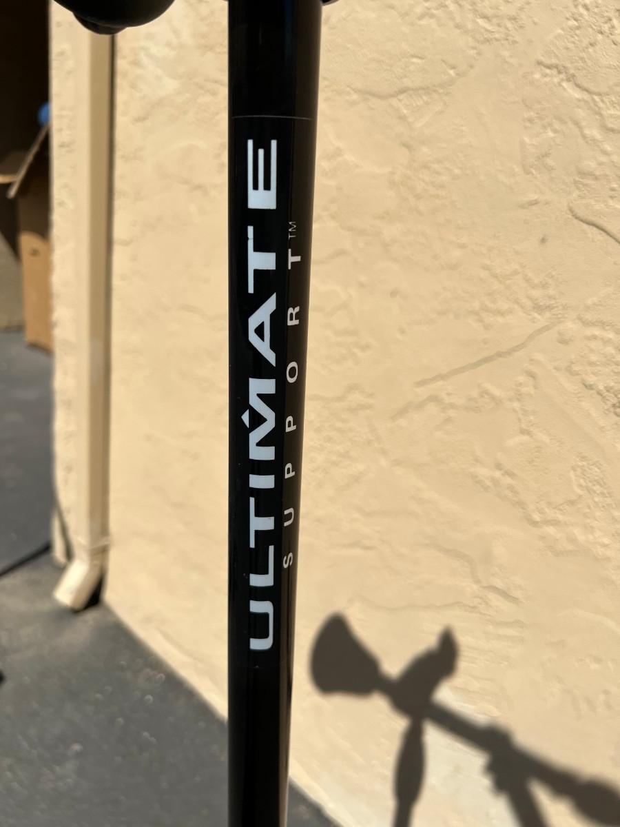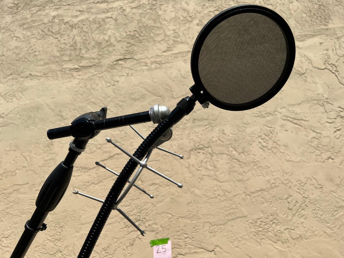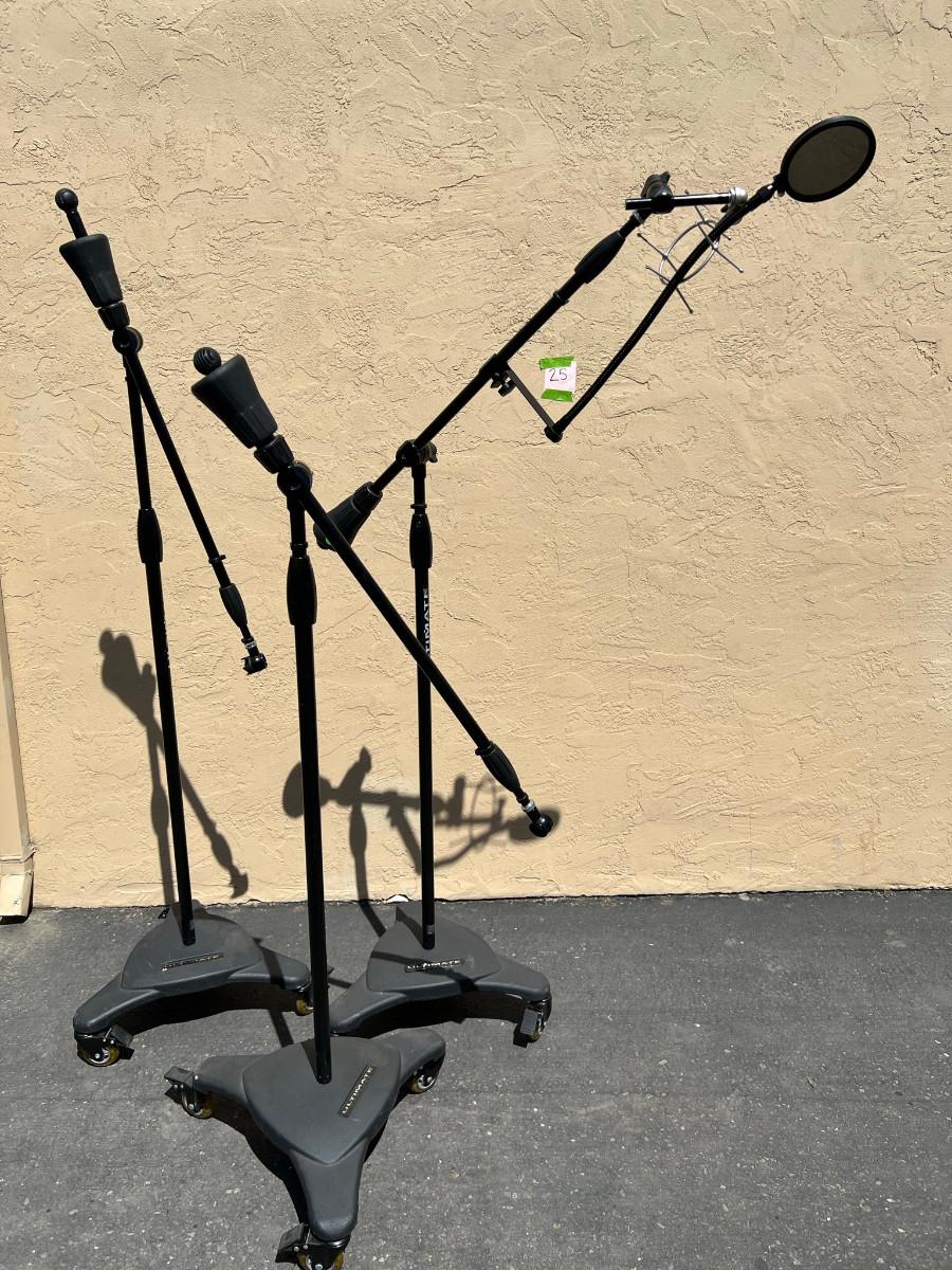Adjustable 78" tall x 18" base. 3 total microphone holders. Very sturdy.