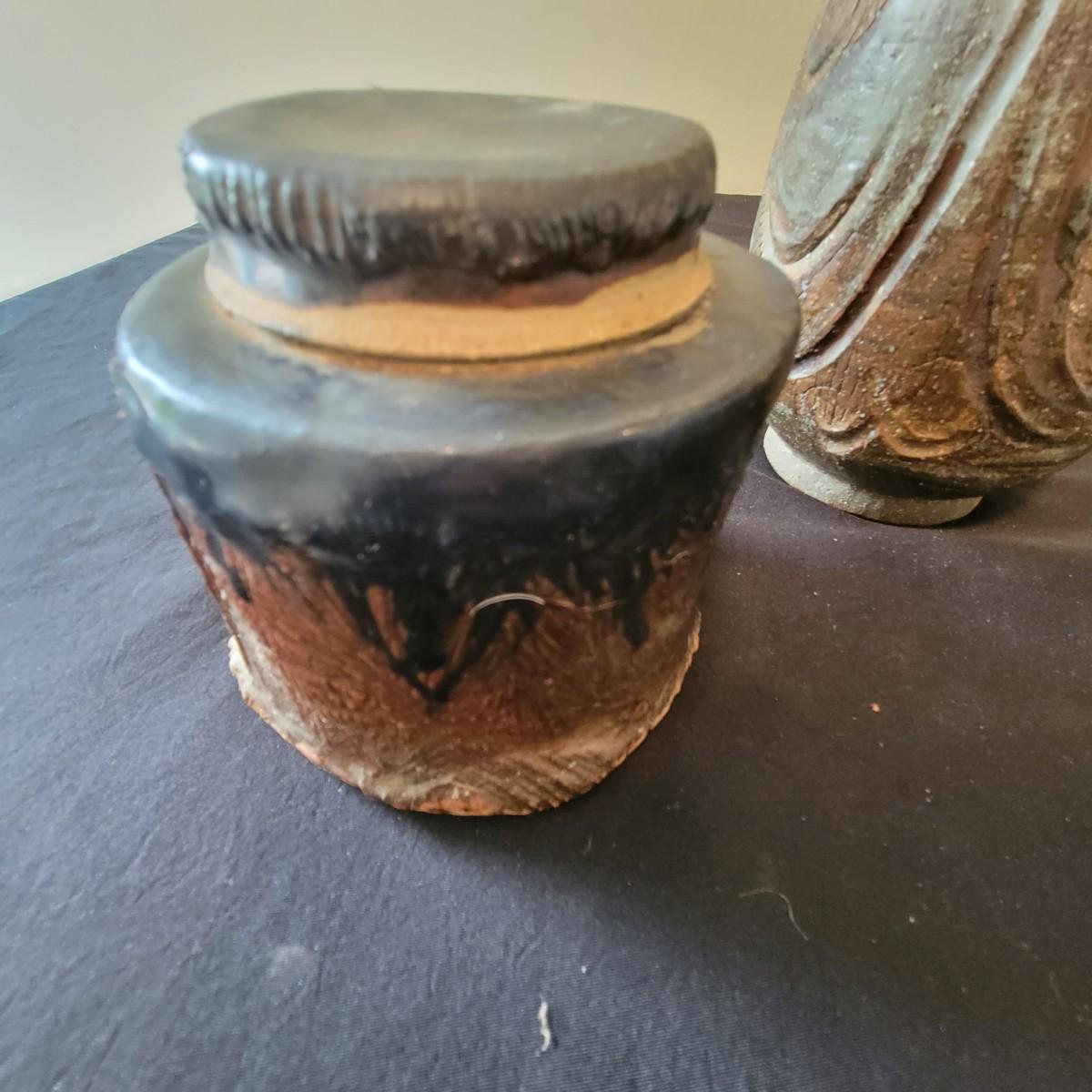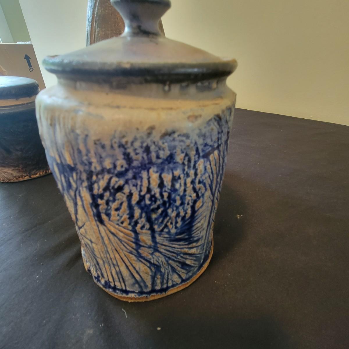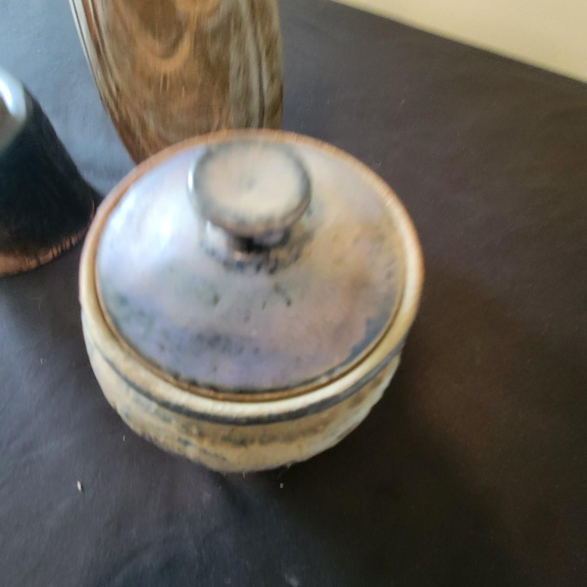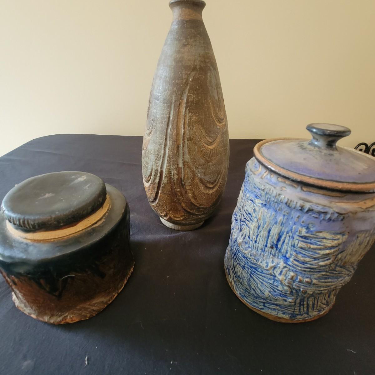 Three unique pieces of pottery with varying glazes and textures. All three are in excellent condition and appear to be hand made pieces. The larger vase is signed and the smaller crock is stamped. See attached pictures. Largest piece measures approximately 4.25"d x 10". Shipping available