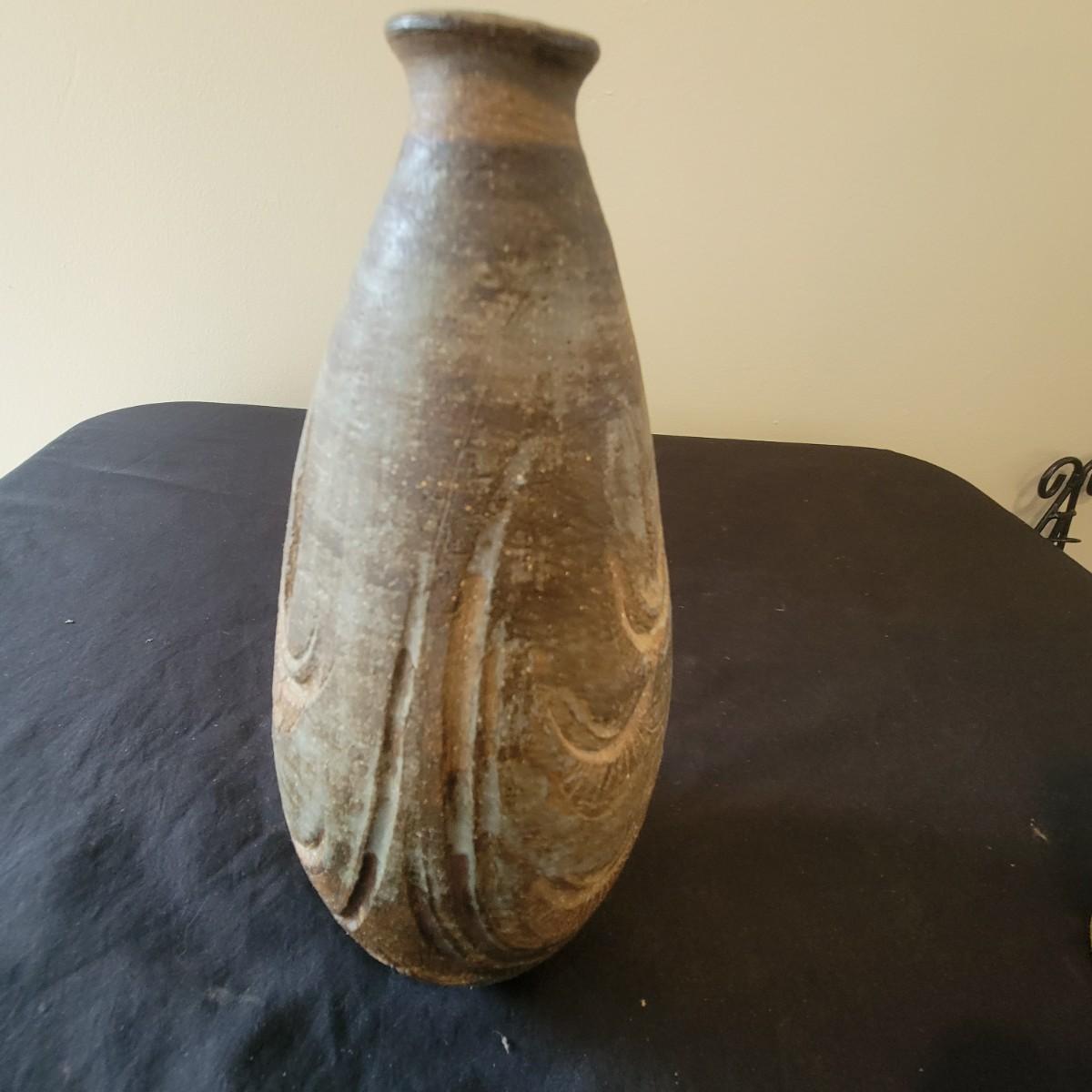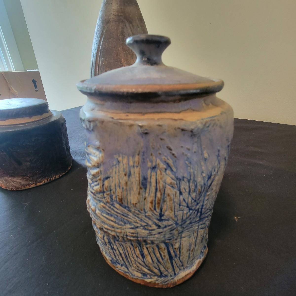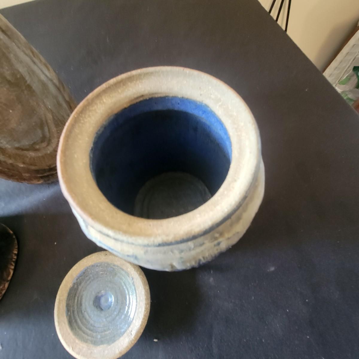 Three unique pieces of pottery with varying glazes and textures. All three are in excellent condition and appear to be hand made pieces. The larger vase is signed and the smaller crock is stamped. See attached pictures. Largest piece measures approximately 4.25"d x 10". Shipping available