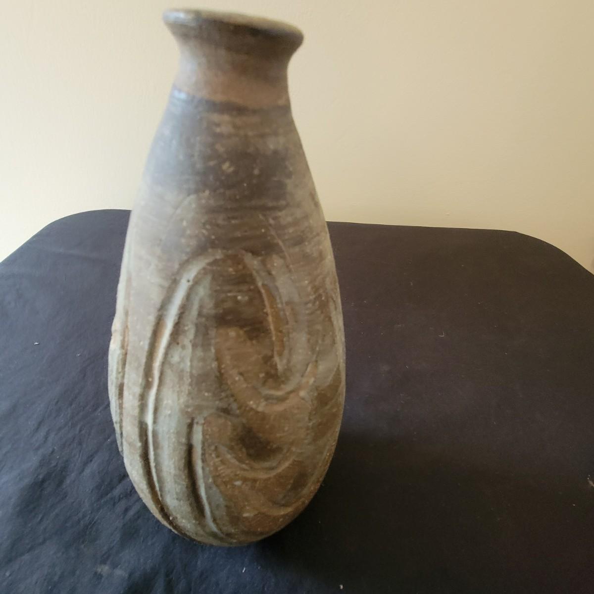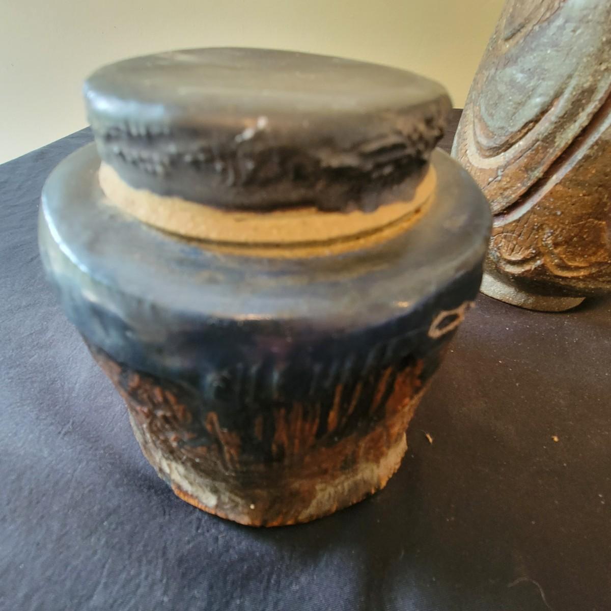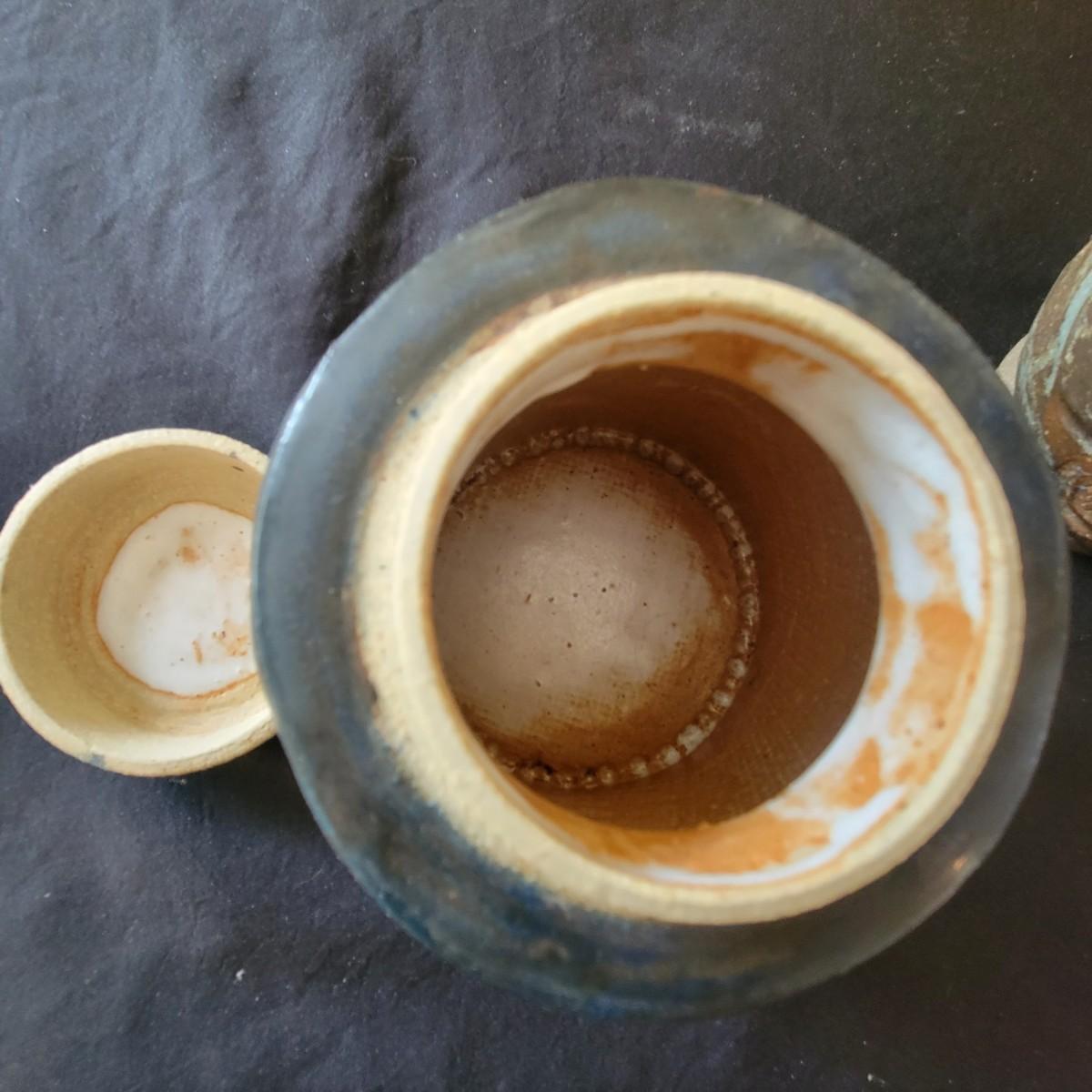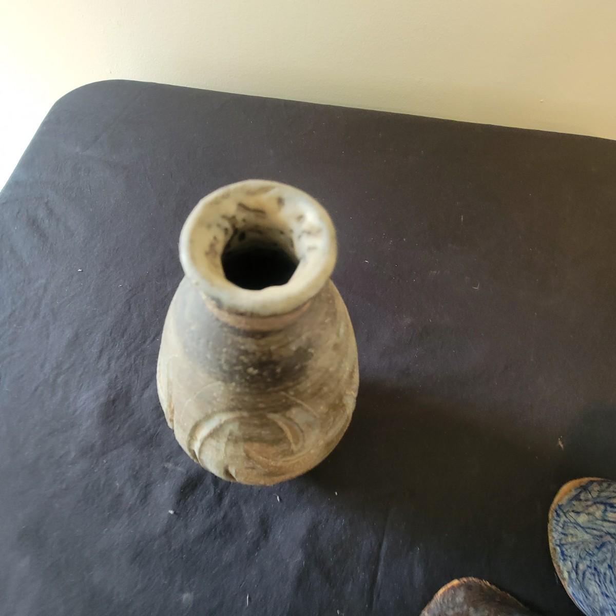 Three unique pieces of pottery with varying glazes and textures. All three are in excellent condition and appear to be hand made pieces. The larger vase is signed and the smaller crock is stamped. See attached pictures. Largest piece measures approximately 4.25"d x 10". Shipping available