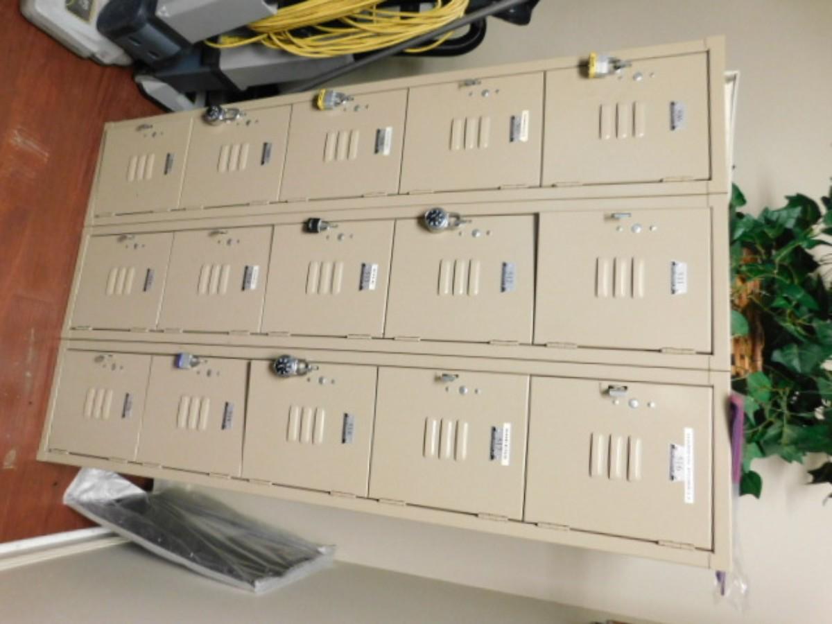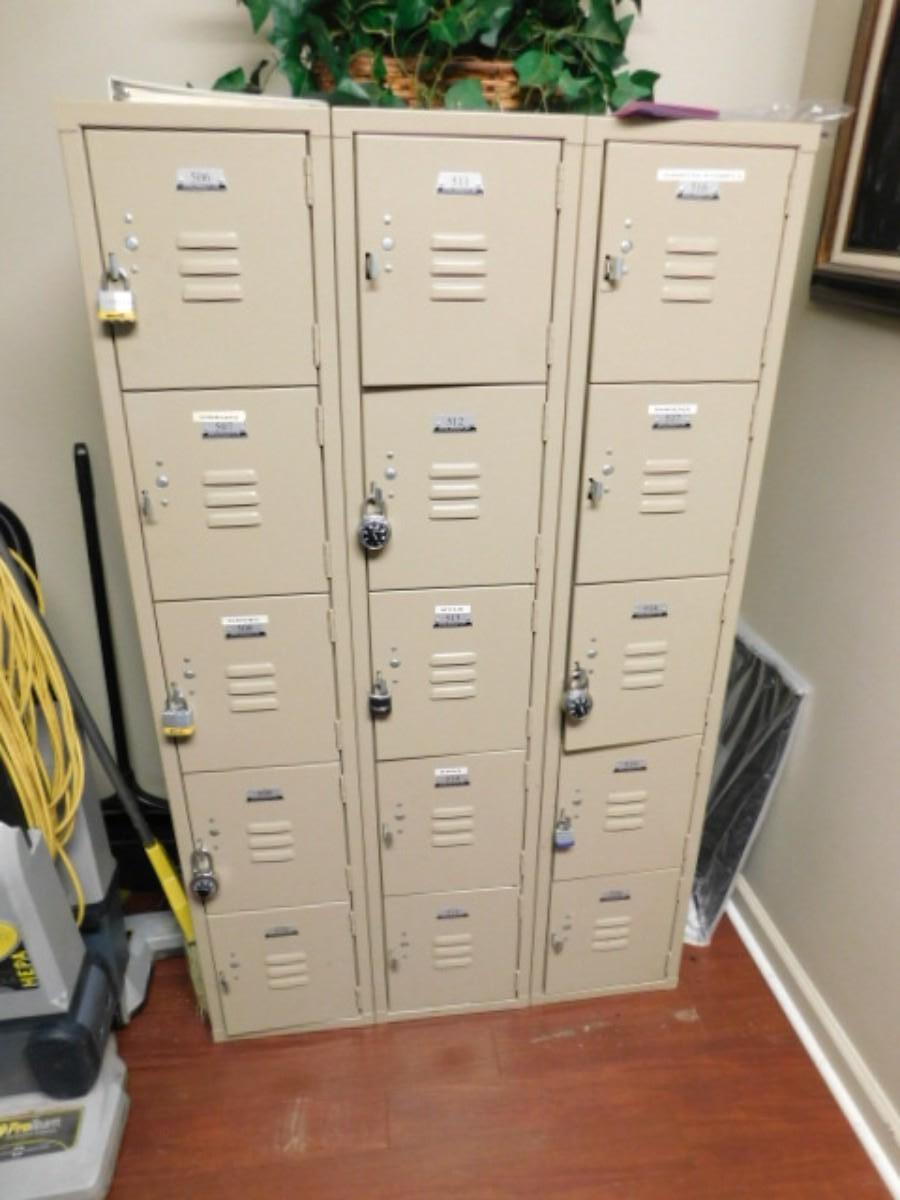 3 Unit Locker Set 15 Compartment Choice A Expect some wear or scratches to finish. Shipping option available via freight or local mover at Buyer's expense. Buyer must have all shipping scheduled within the stated dates and times of pickup. Recommended local mover is Beaty Bros. Moving 828-201-2982