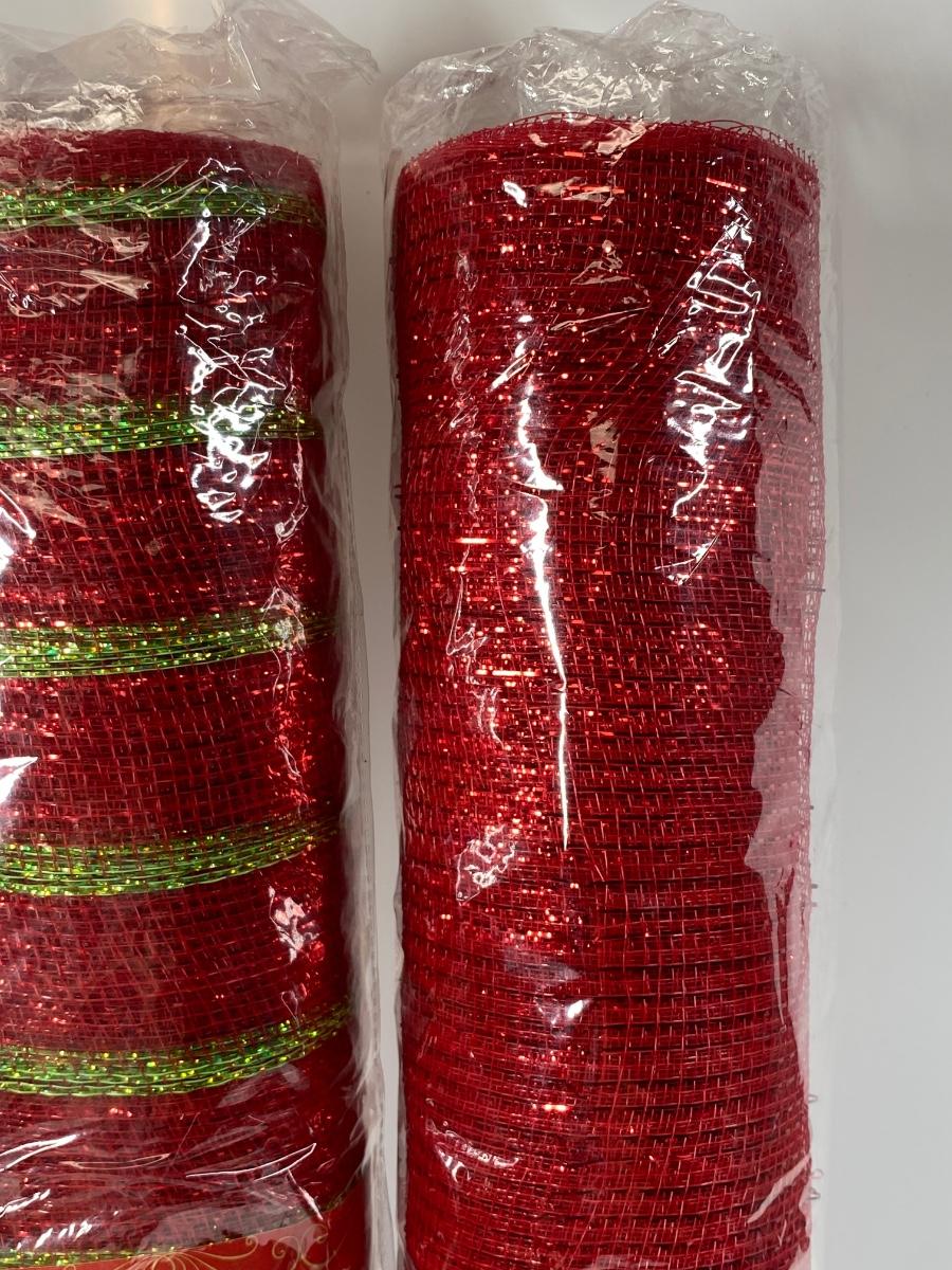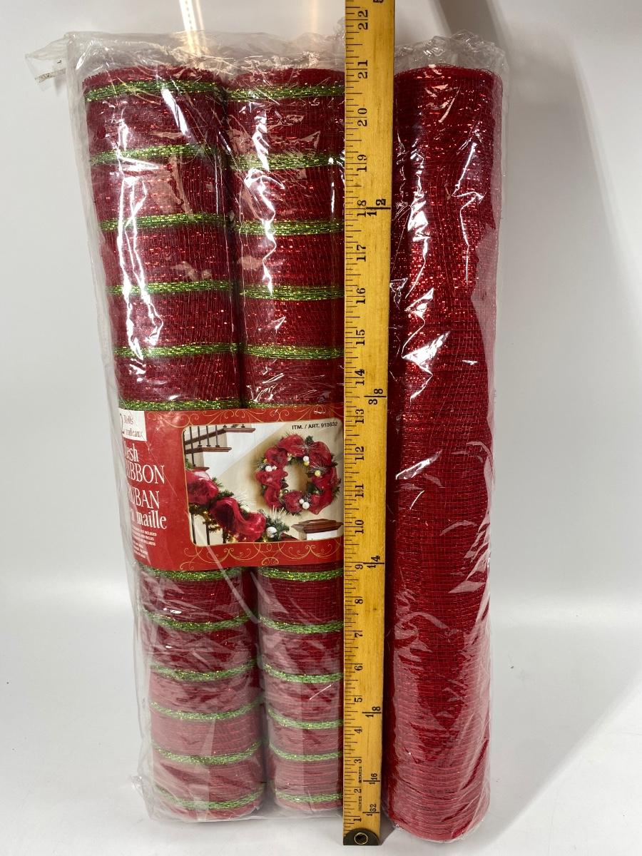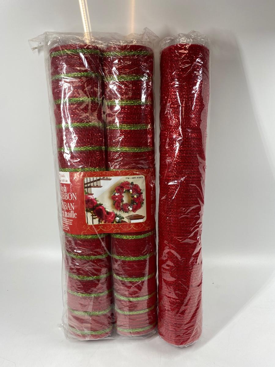 3 rolls of unopened wide mesh ribbon. Two are red and green, the other is solid red.