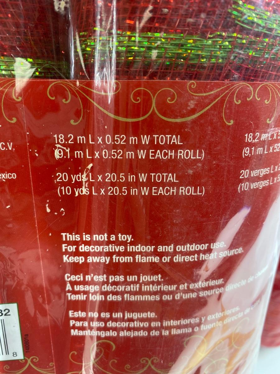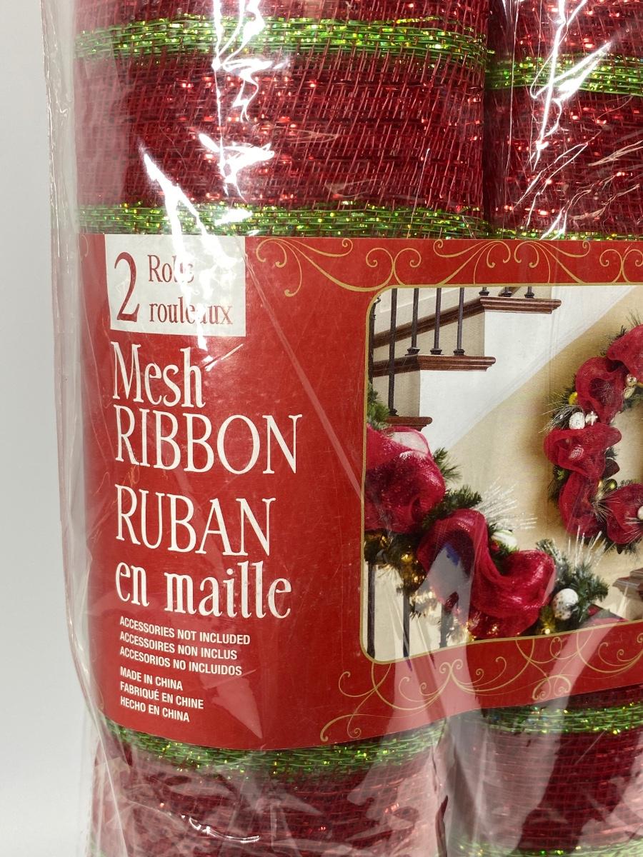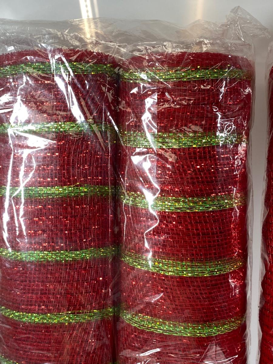 3 rolls of unopened wide mesh ribbon. Two are red and green, the other is solid red.