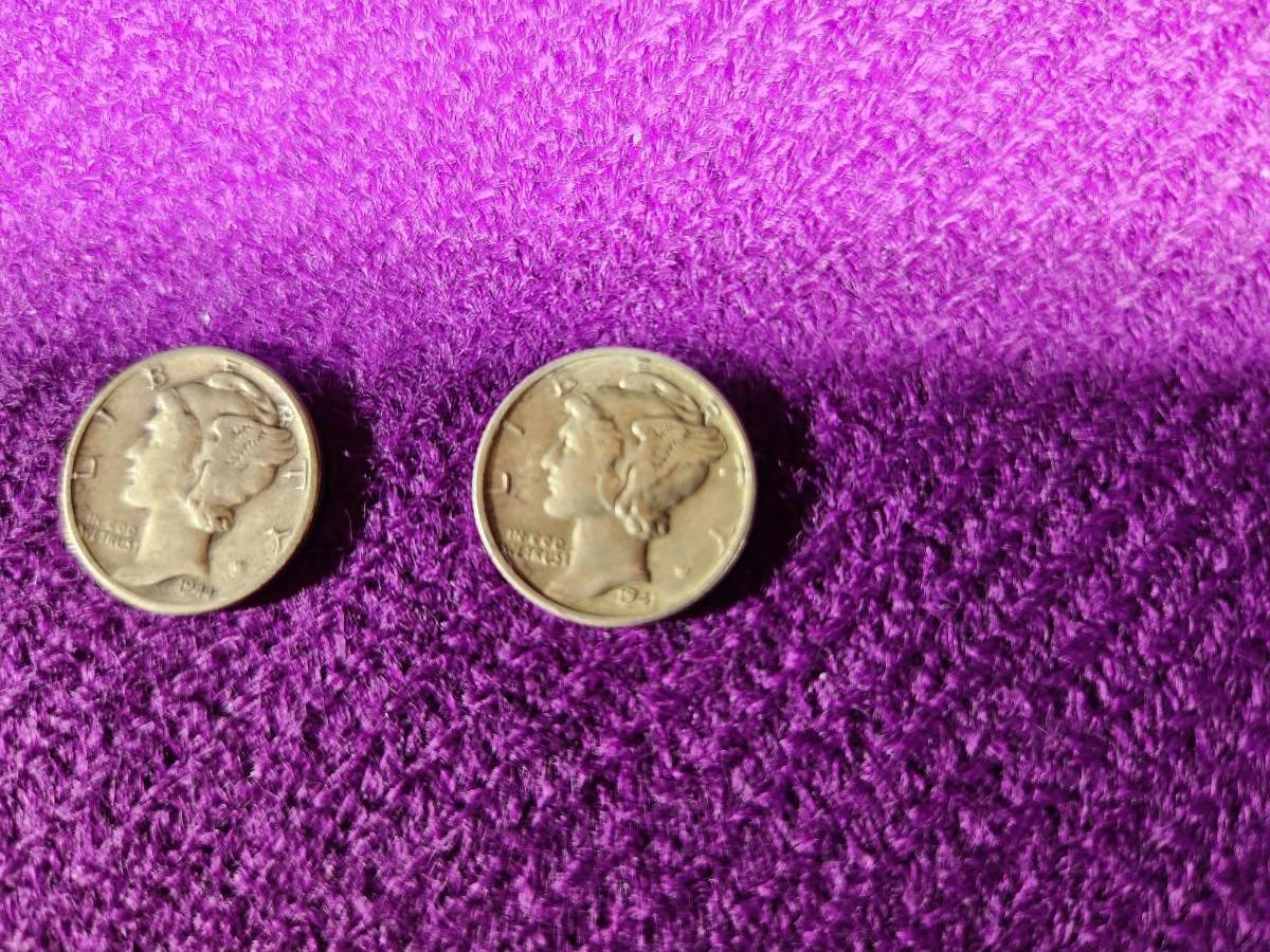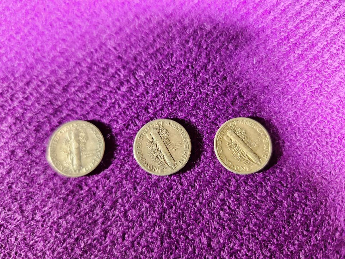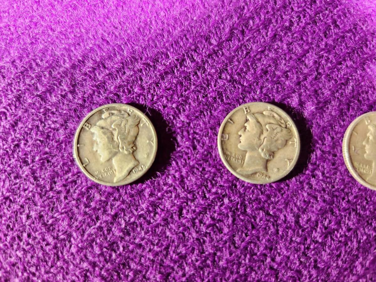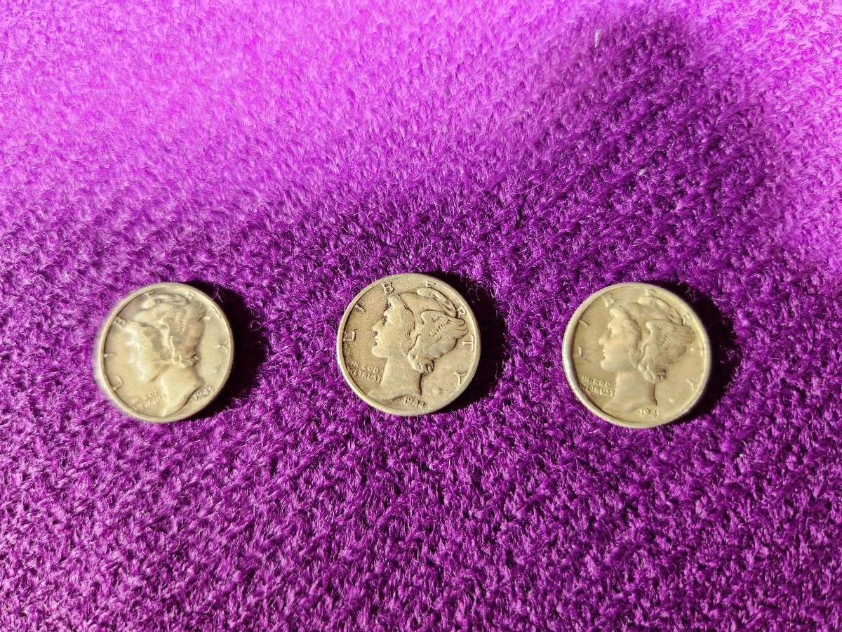 This auction lot is for 3 US Mint Mercury Silver Dimes. The grouping includes a 1941, a 1944 and a 1945-D.