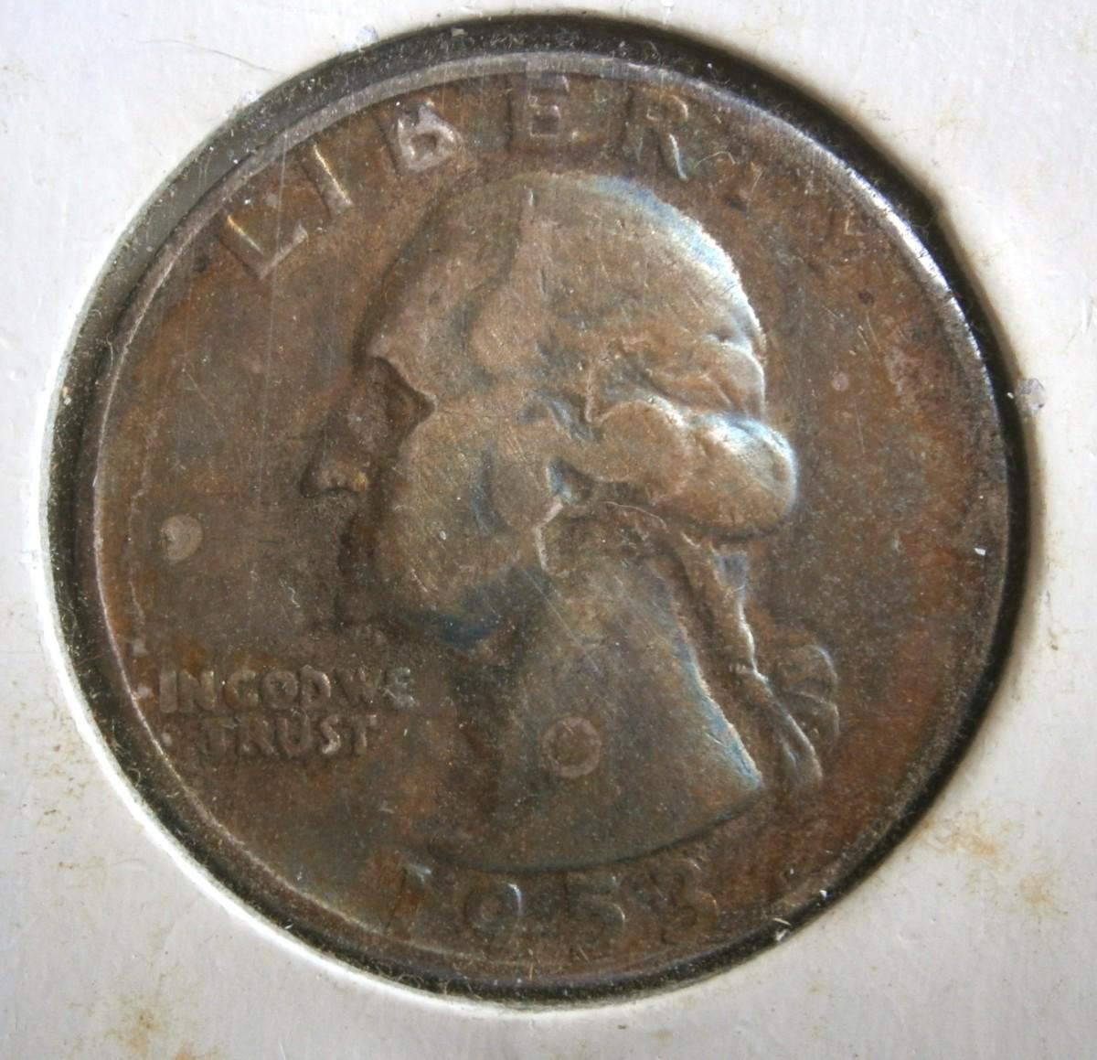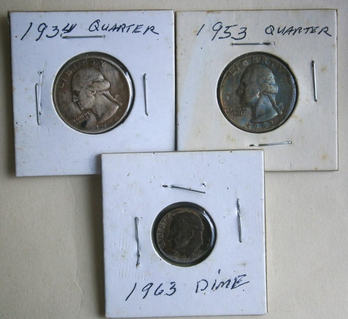 3 US Silver Coins, 1934 & 1953 Quarters together with 1963 Roosevelt Dime, 900 silver.