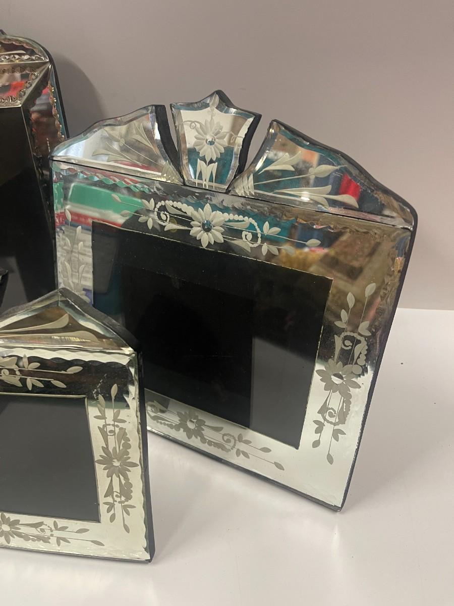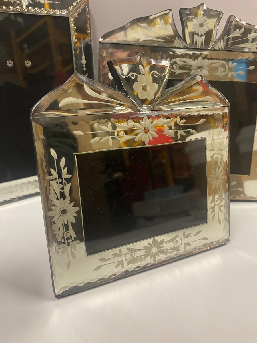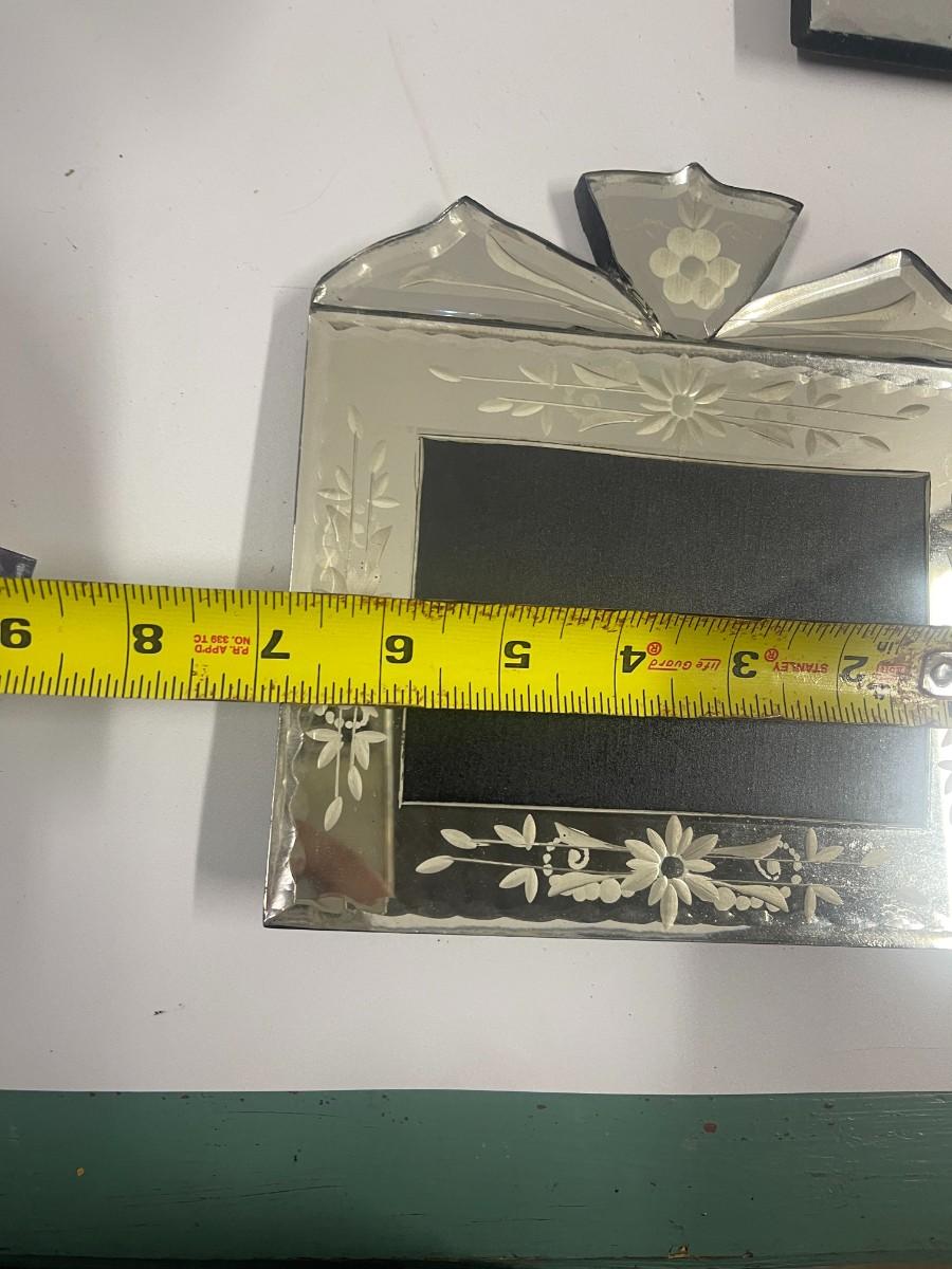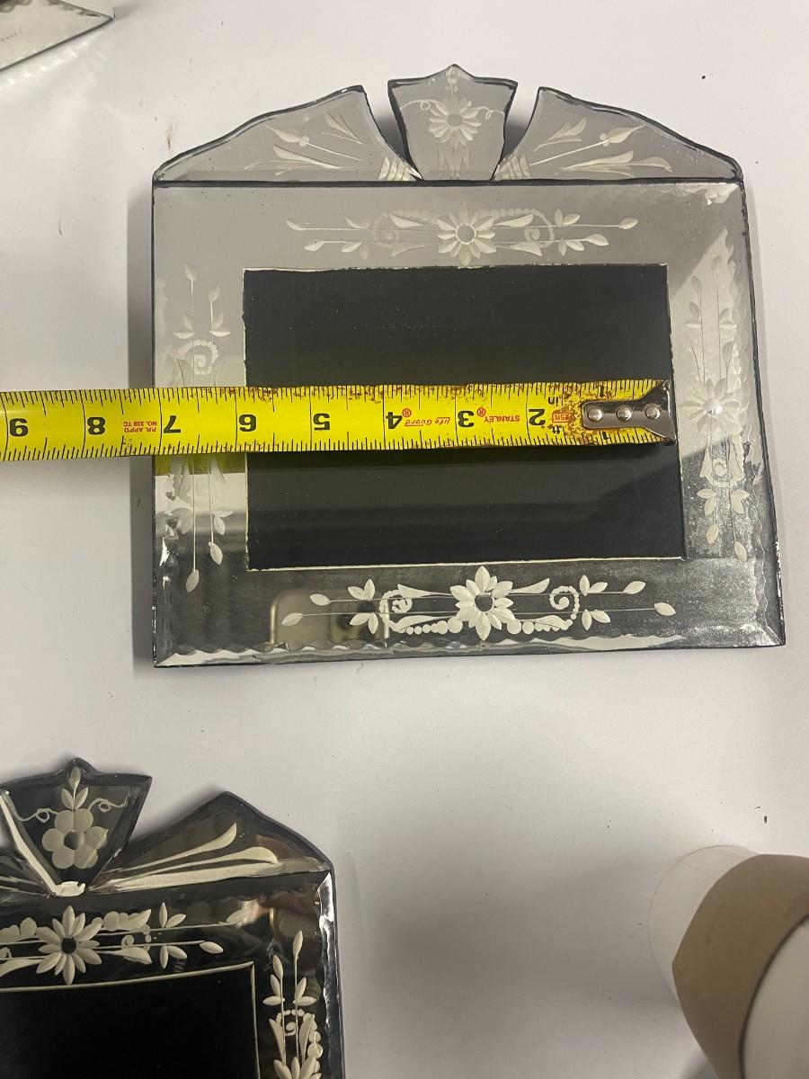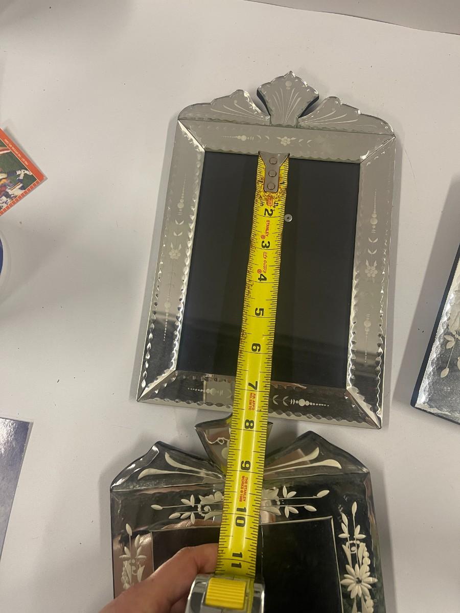 Lot of 3 Venetian style mirrored picture frames. One is for a 3" x 5" photo and is 7" x 7". One is 9" x 9" and holds a 4" x 6" photo. One is 7" x 11 1/2" and holds a photo that is 5" x 7"