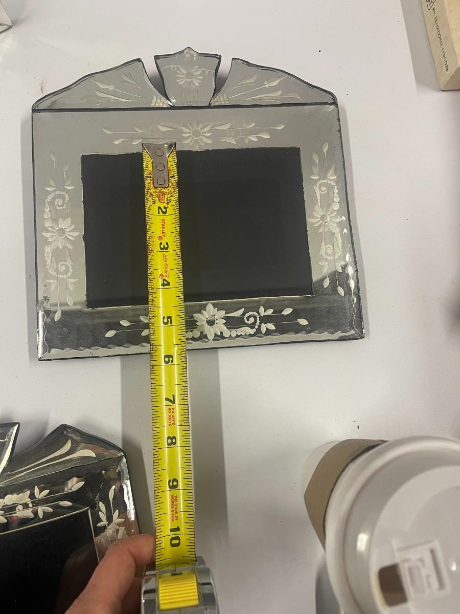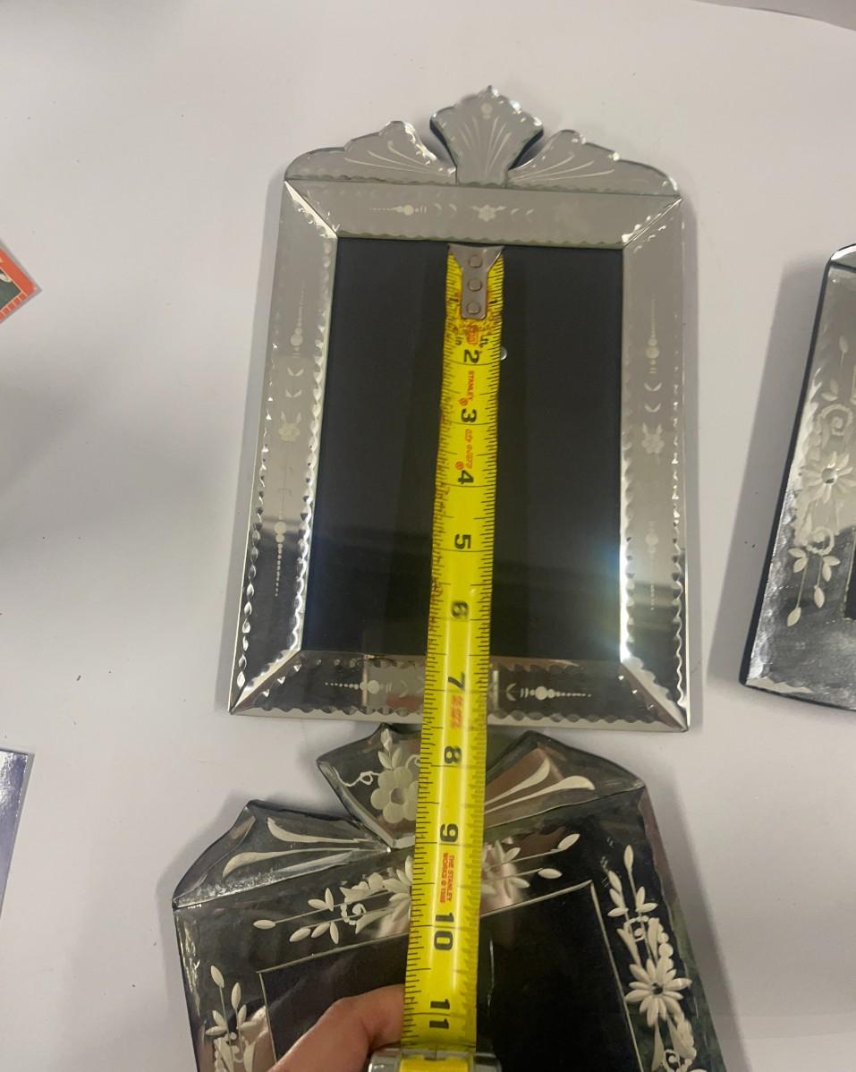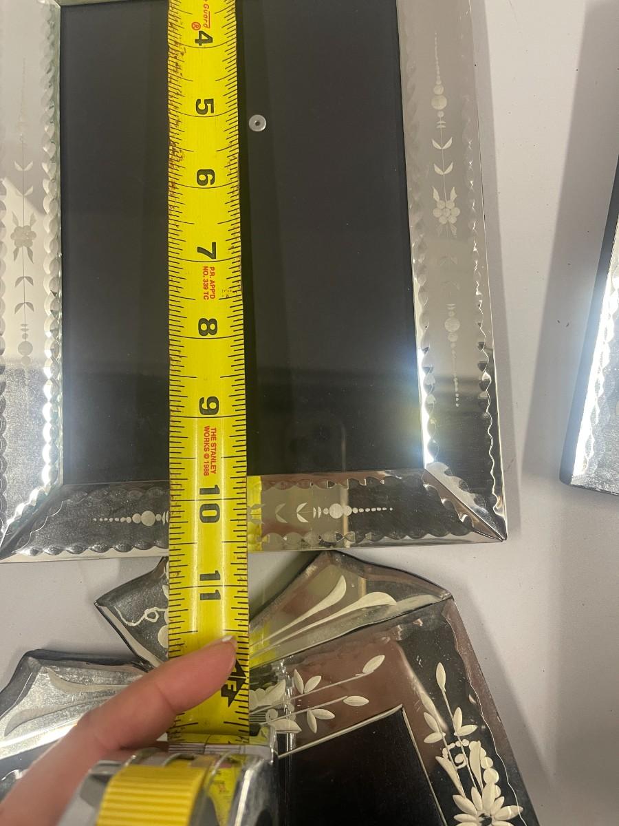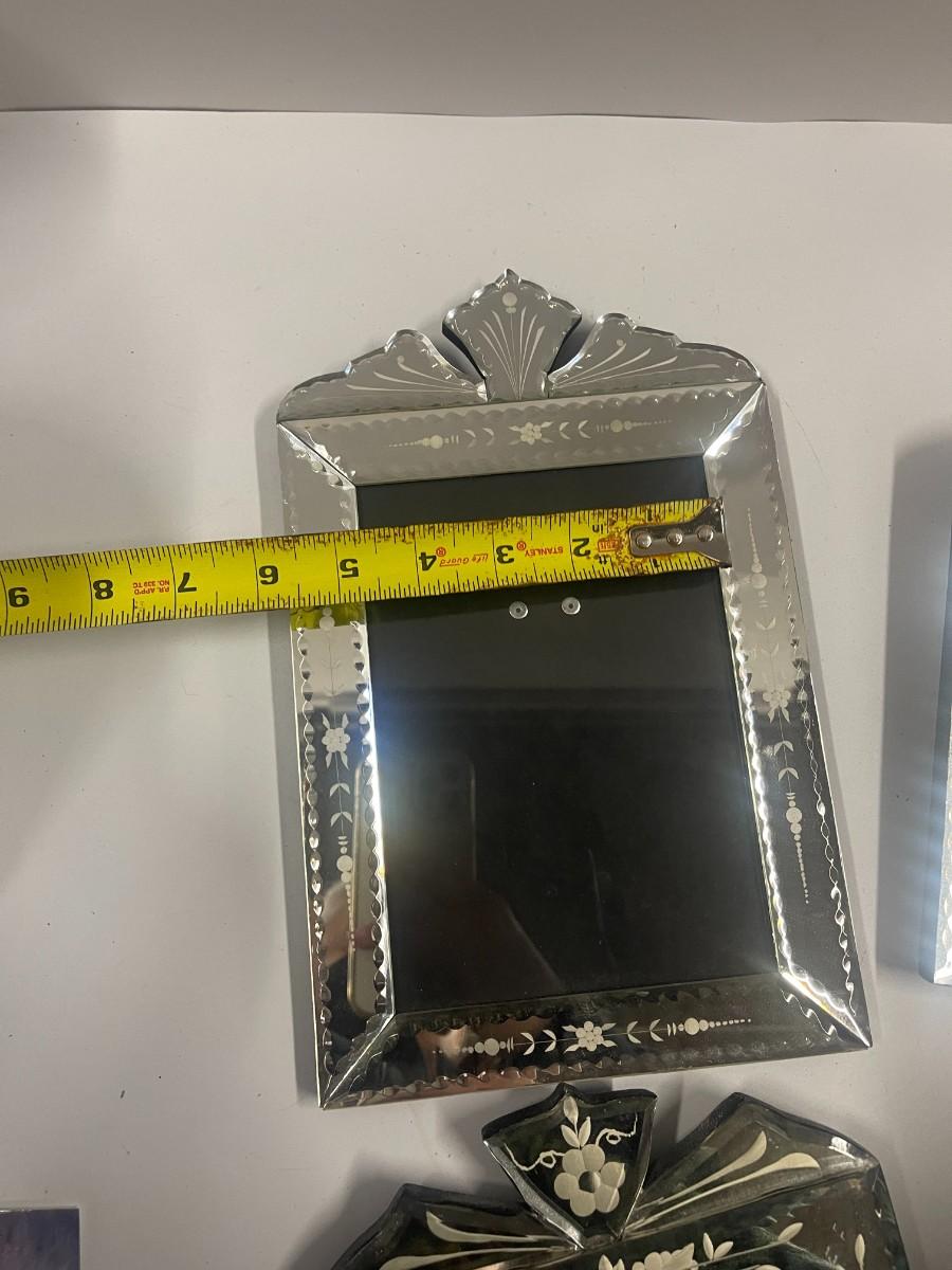 Lot of 3 Venetian style mirrored picture frames. One is for a 3" x 5" photo and is 7" x 7". One is 9" x 9" and holds a 4" x 6" photo. One is 7" x 11 1/2" and holds a photo that is 5" x 7"