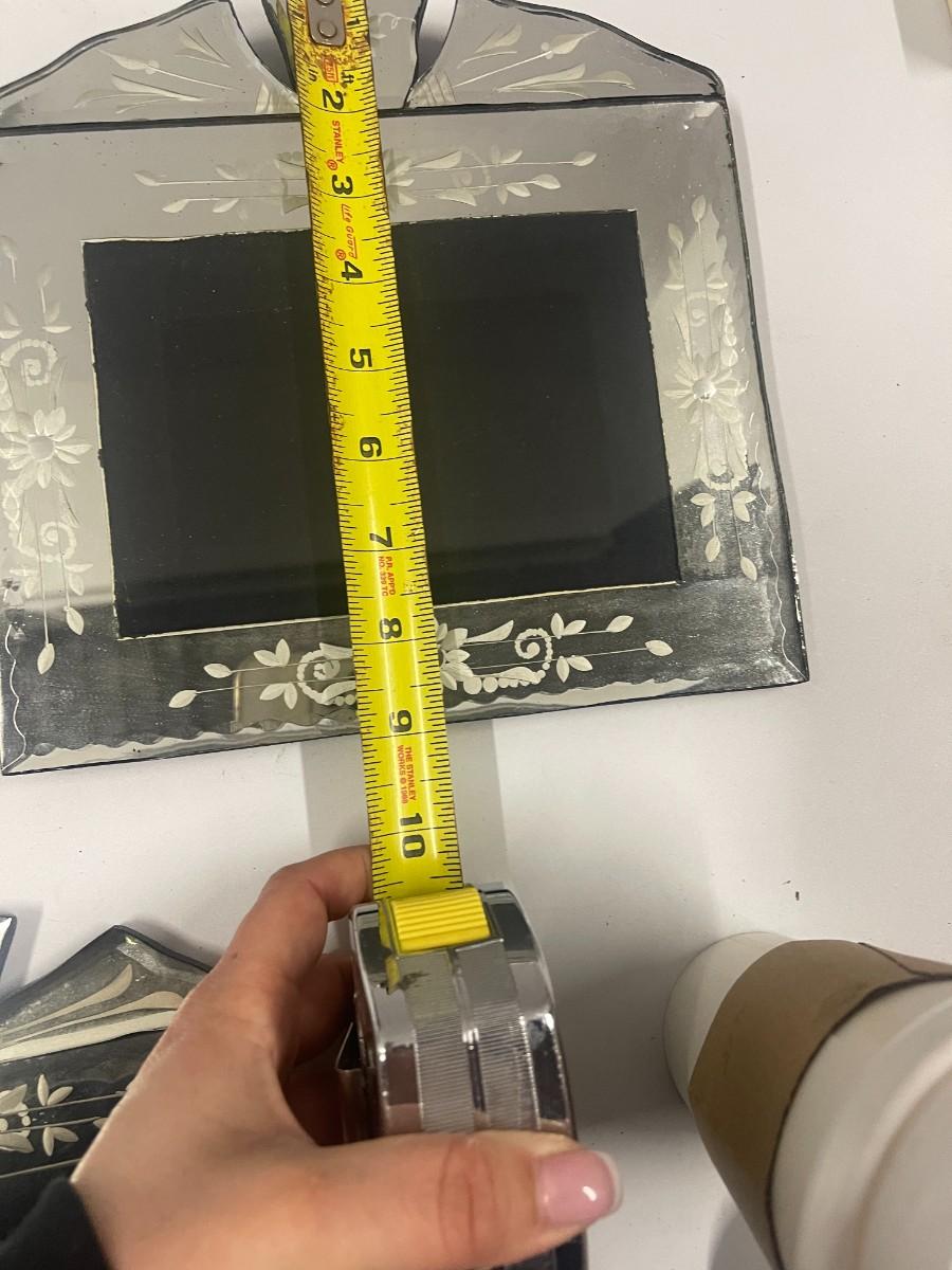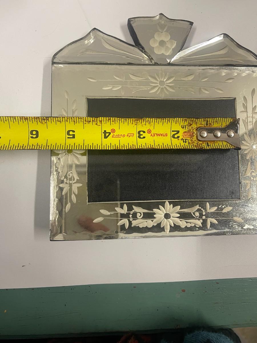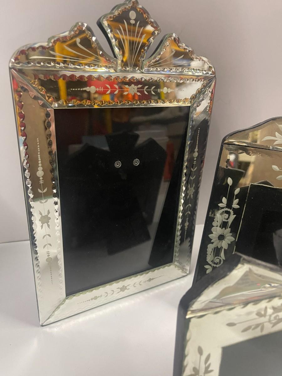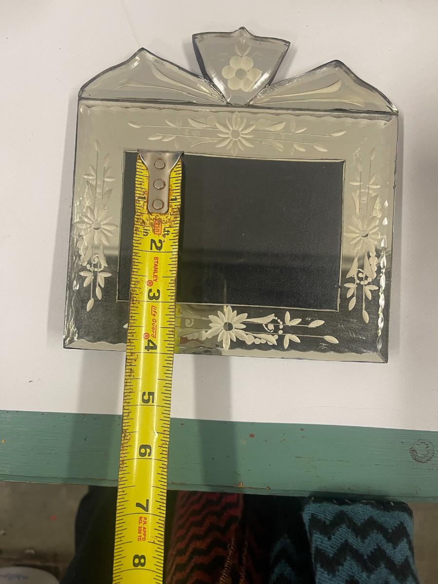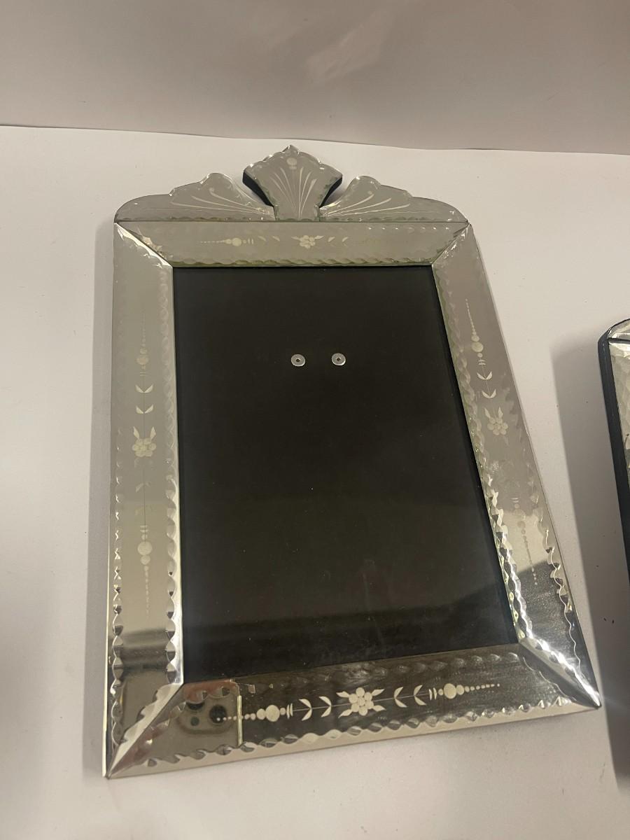 Lot of 3 Venetian style mirrored picture frames. One is for a 3" x 5" photo and is 7" x 7". One is 9" x 9" and holds a 4" x 6" photo. One is 7" x 11 1/2" and holds a photo that is 5" x 7"