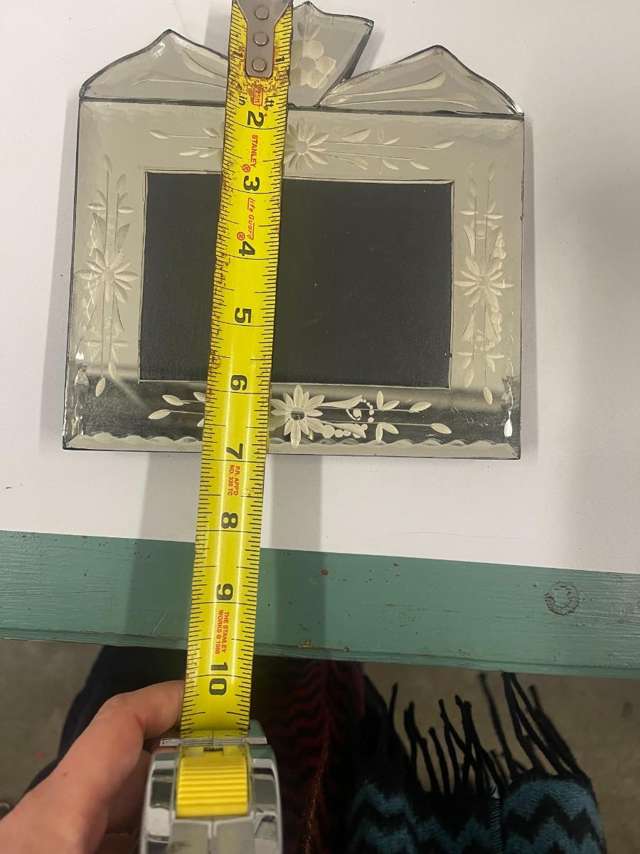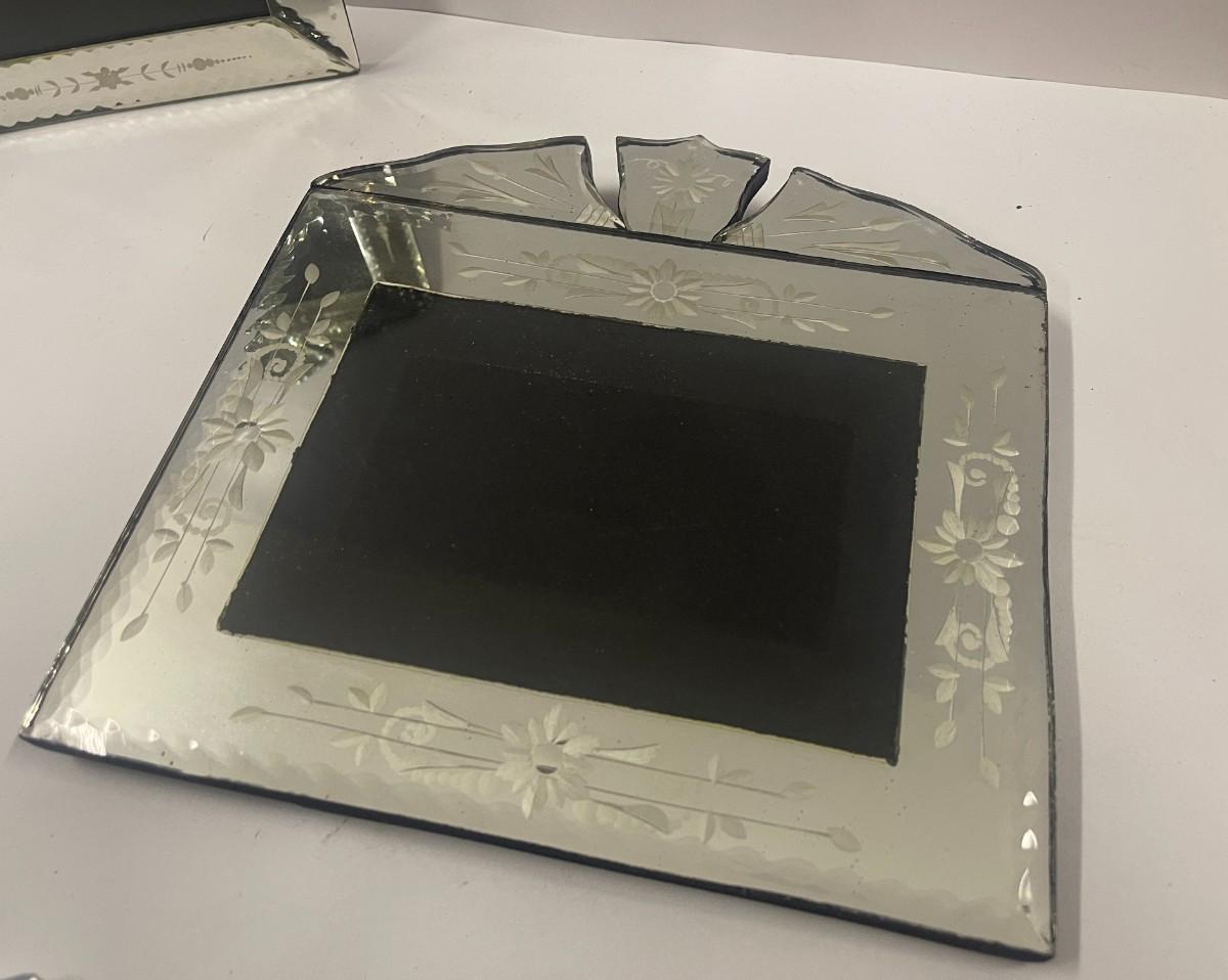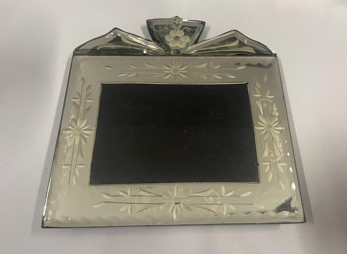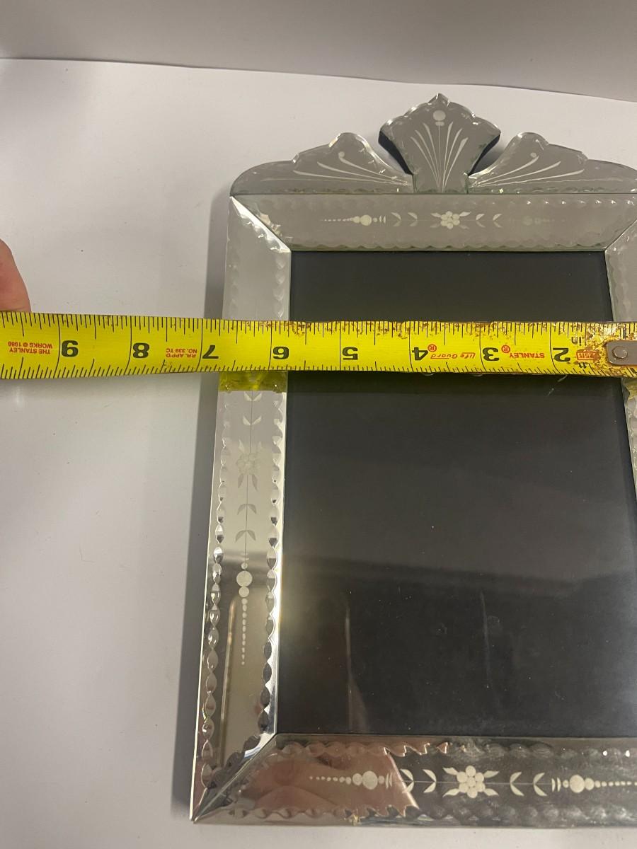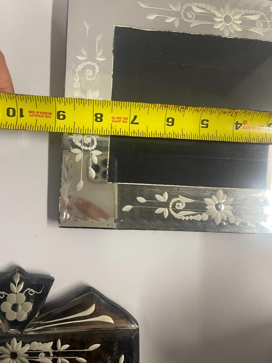 Lot of 3 Venetian style mirrored picture frames. One is for a 3" x 5" photo and is 7" x 7". One is 9" x 9" and holds a 4" x 6" photo. One is 7" x 11 1/2" and holds a photo that is 5" x 7"