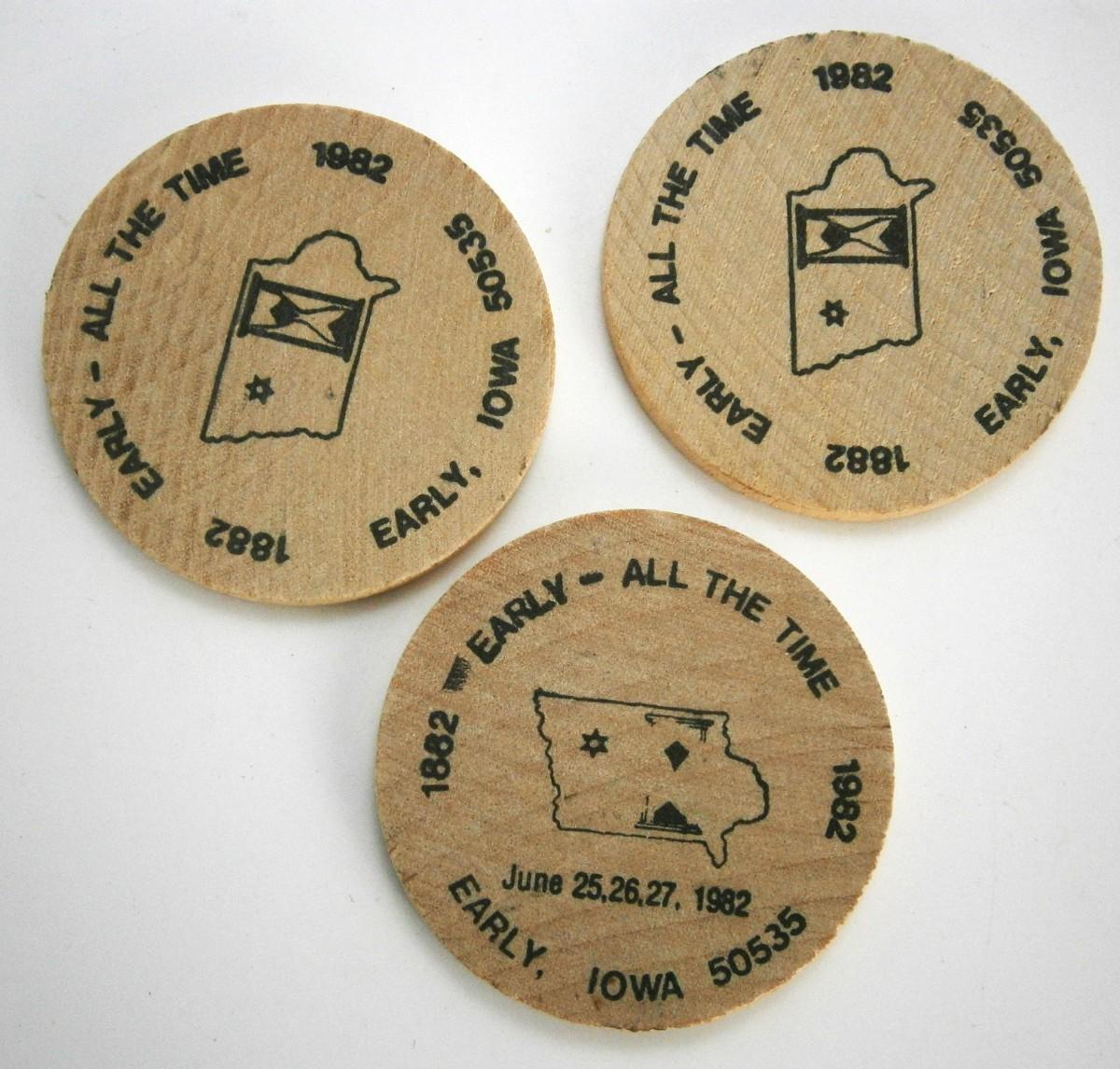 (3) Vintage 1982 Iowa Wooden Nickels, 1 1/2 in diameter