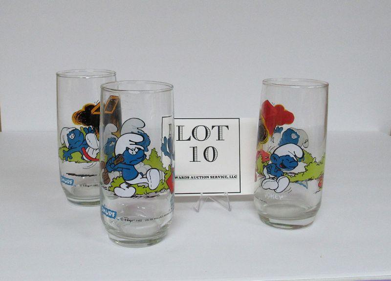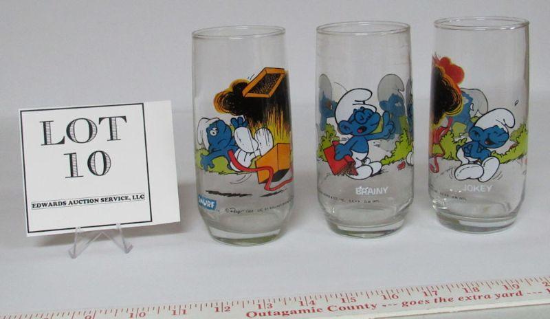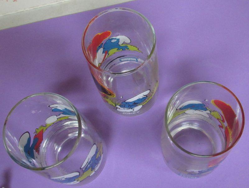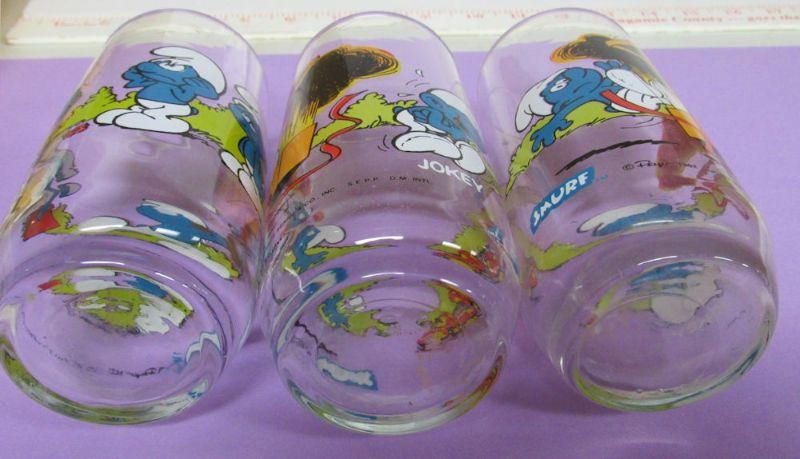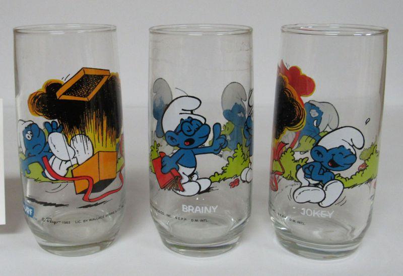 3 Vintage 1982 Smurf Glasses, 12 Jokey 1 Brainy